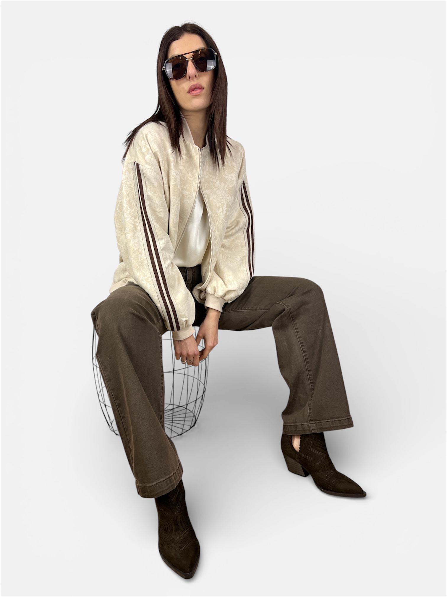 Un look che interpreta perfettamente le tendenze della stagione, dove comfort e stile si incontrano con naturalezza. Il bomber, protagonista assoluto, si rinnova con una texture sofisticata e dettagli sportivi, diventando il capo chiave per un’eleganza casual contemporanea. Abbinato a un jeans wide leg nei toni caldi del marrone, crea una silhouette rilassata ma estremamente attuale, in linea con il ritorno dei volumi ampi e delle palette naturali.