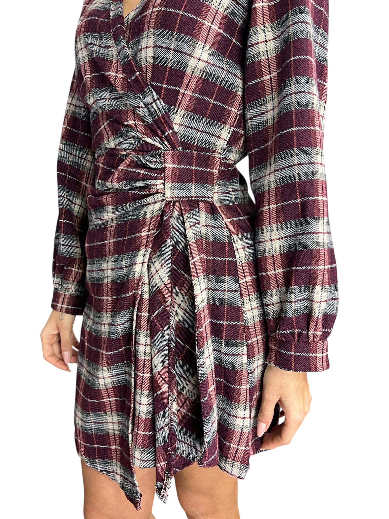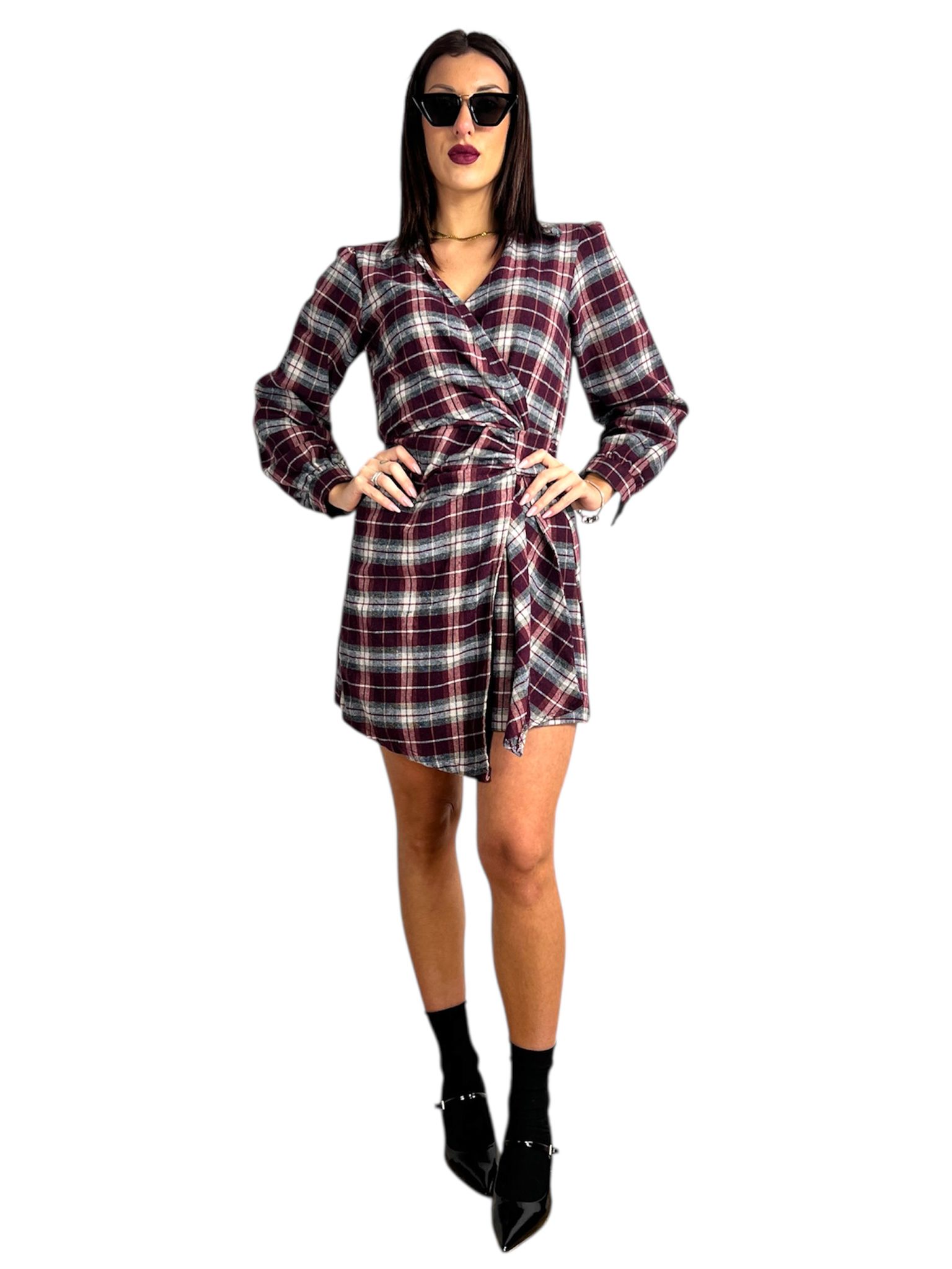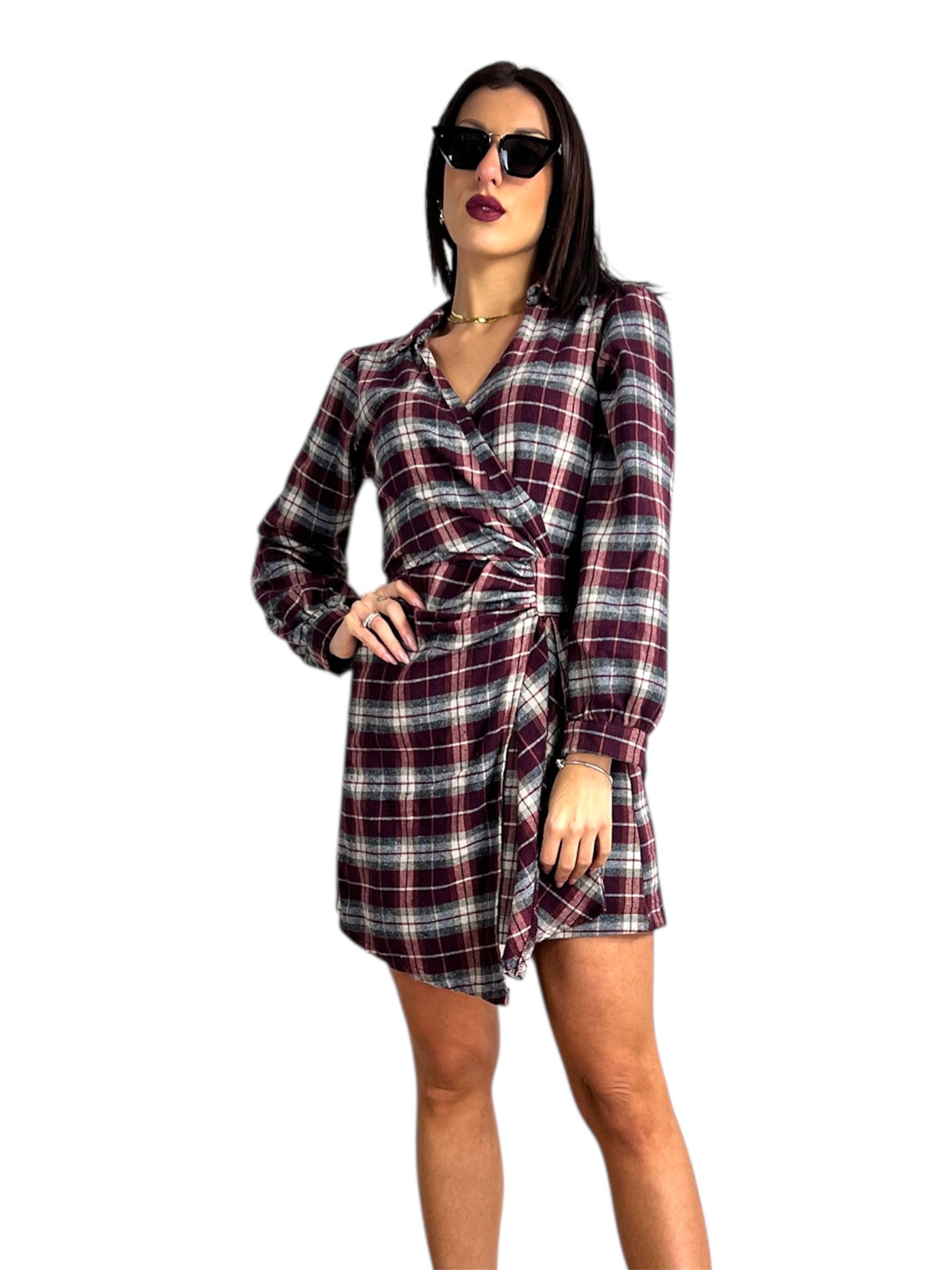- modello abito corto fantasia check colletto scollo incrocio ripresa sul fianco elastico in vita posteriore
