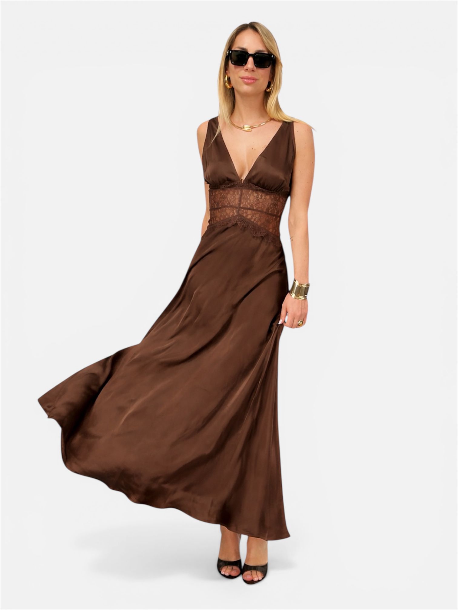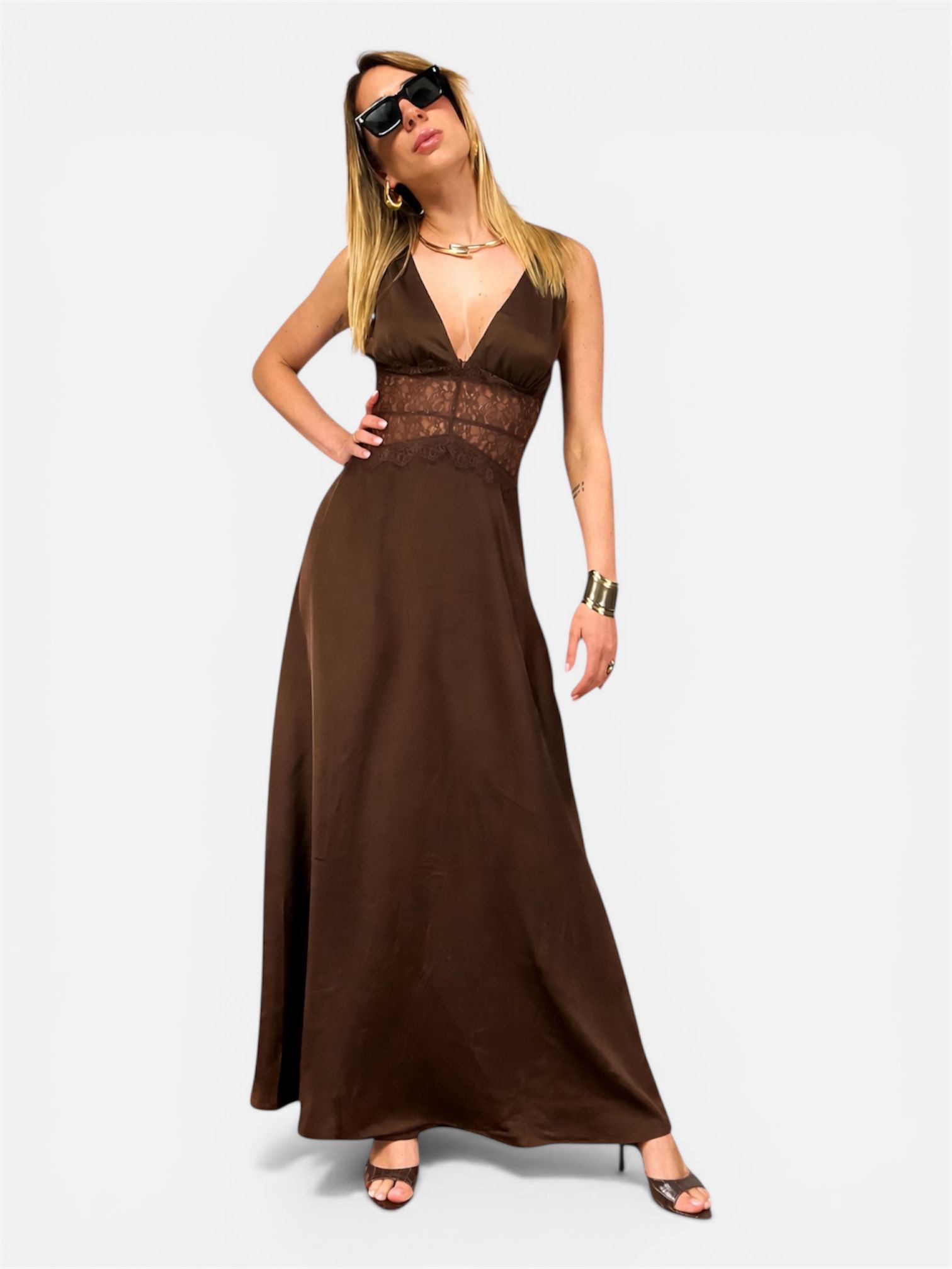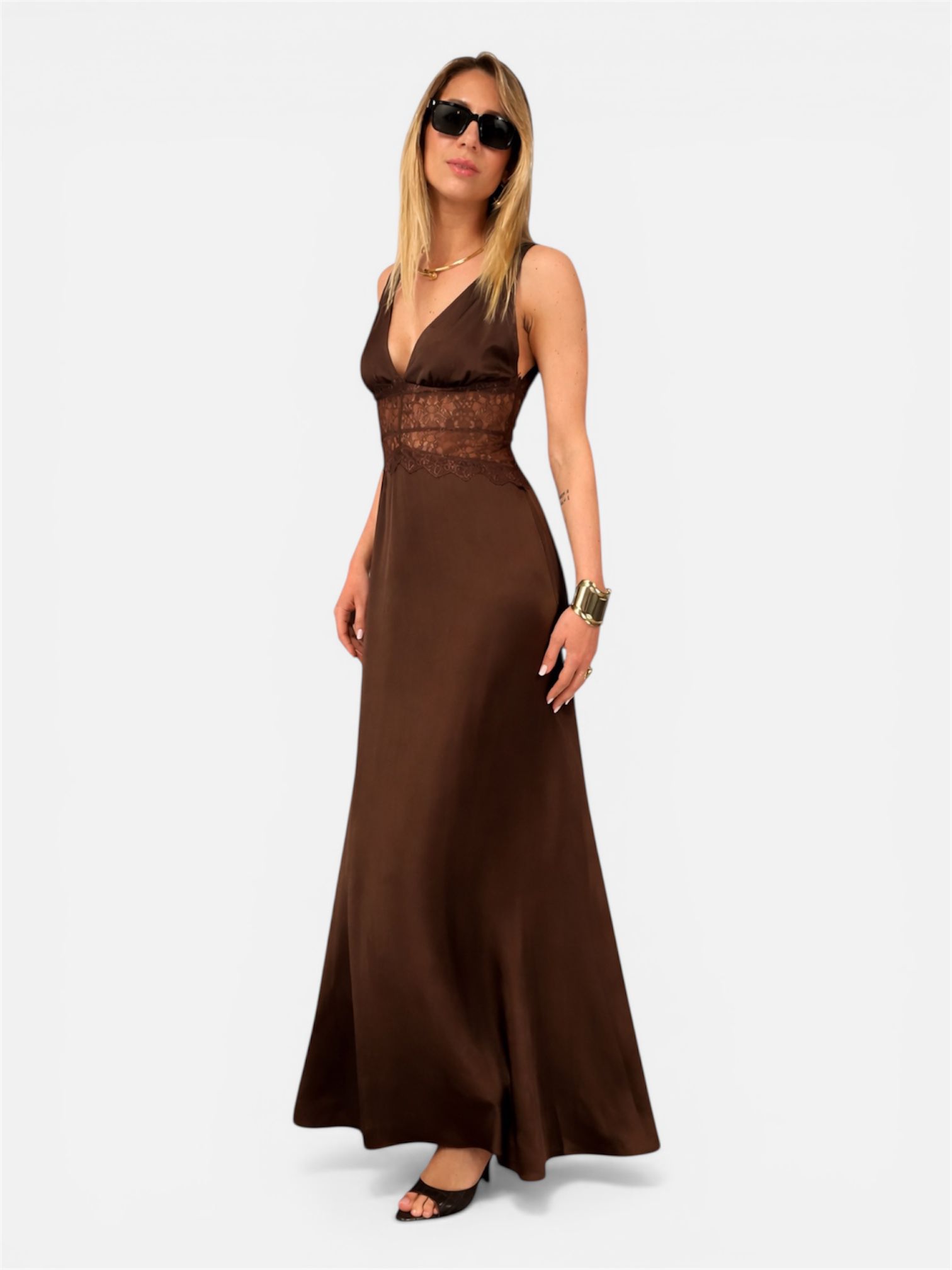 Abito lungo, un perfetto equilibrio tra eleganza classica e dettagli seducenti. Realizzato in pregiato raso fluido, questo capo scivola delicatamente lungo la silhouette, offrendo una lucentezza sofisticata e un tocco setoso sulla pelle.