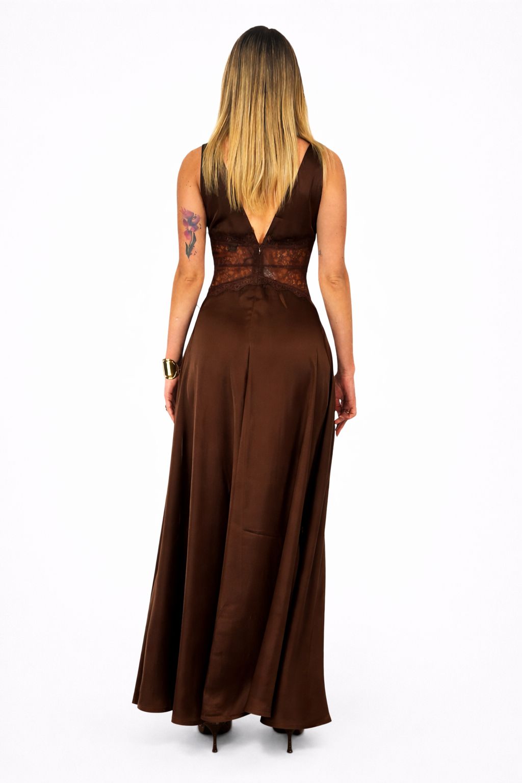 - Chiusura Discreta: Il retro è rifinito con una zip invisibile sulla schiena, che assicura una vestibilità perfetta senza interrompere la fluidità del design.
