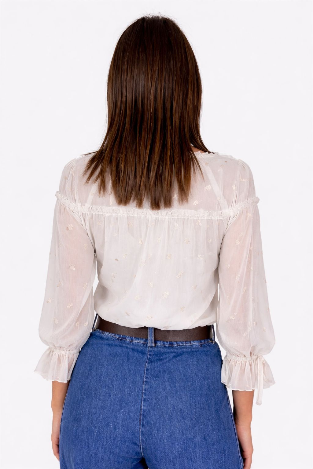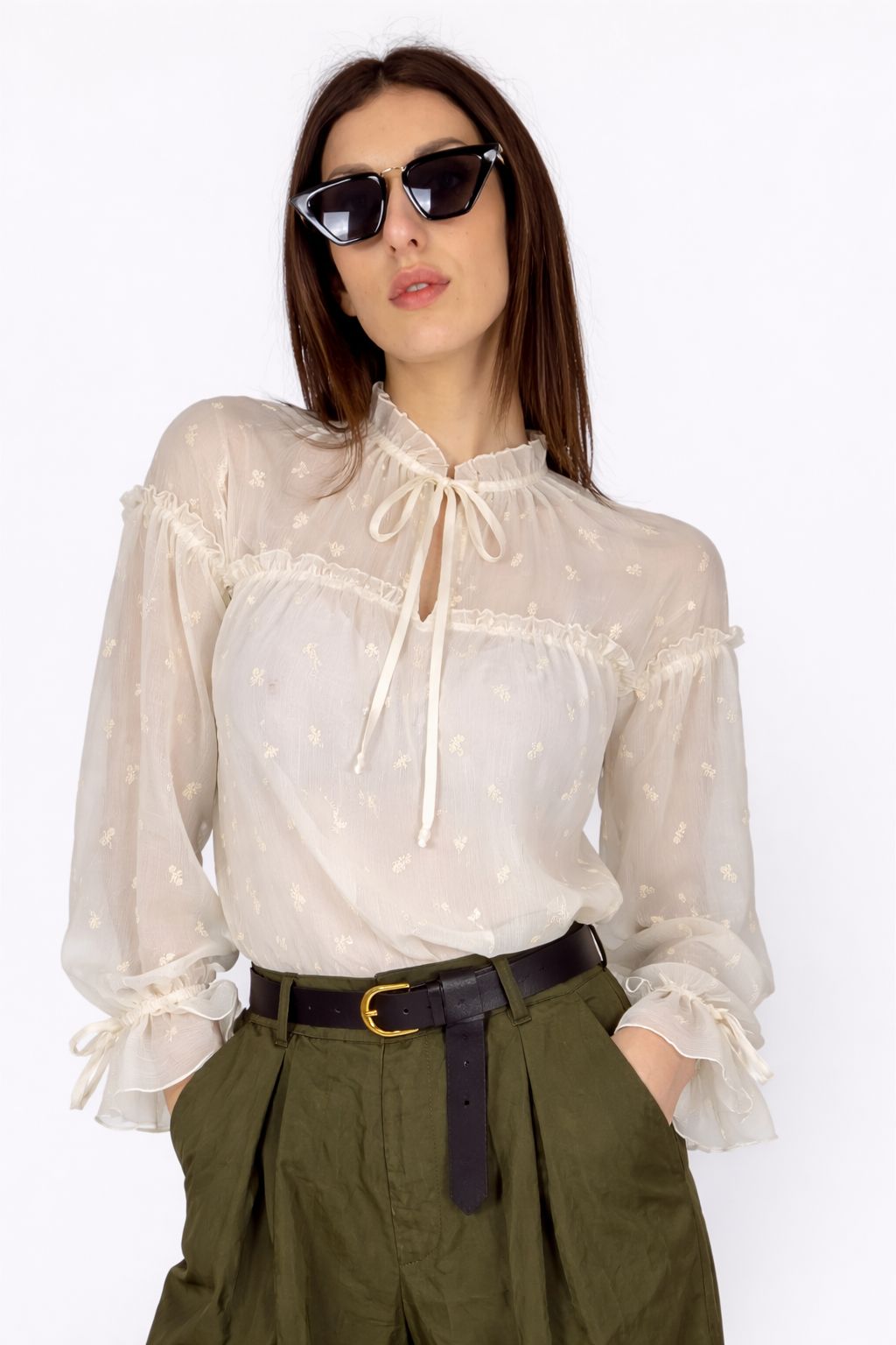 Eleva il tuo guardaroba con questa blusa sofisticata, dove la leggerezza del tessuto incontra la preziosità ricami delicati la rendono un capo distintivo, perfetto per chi ama uno stile ricercato e femminile.