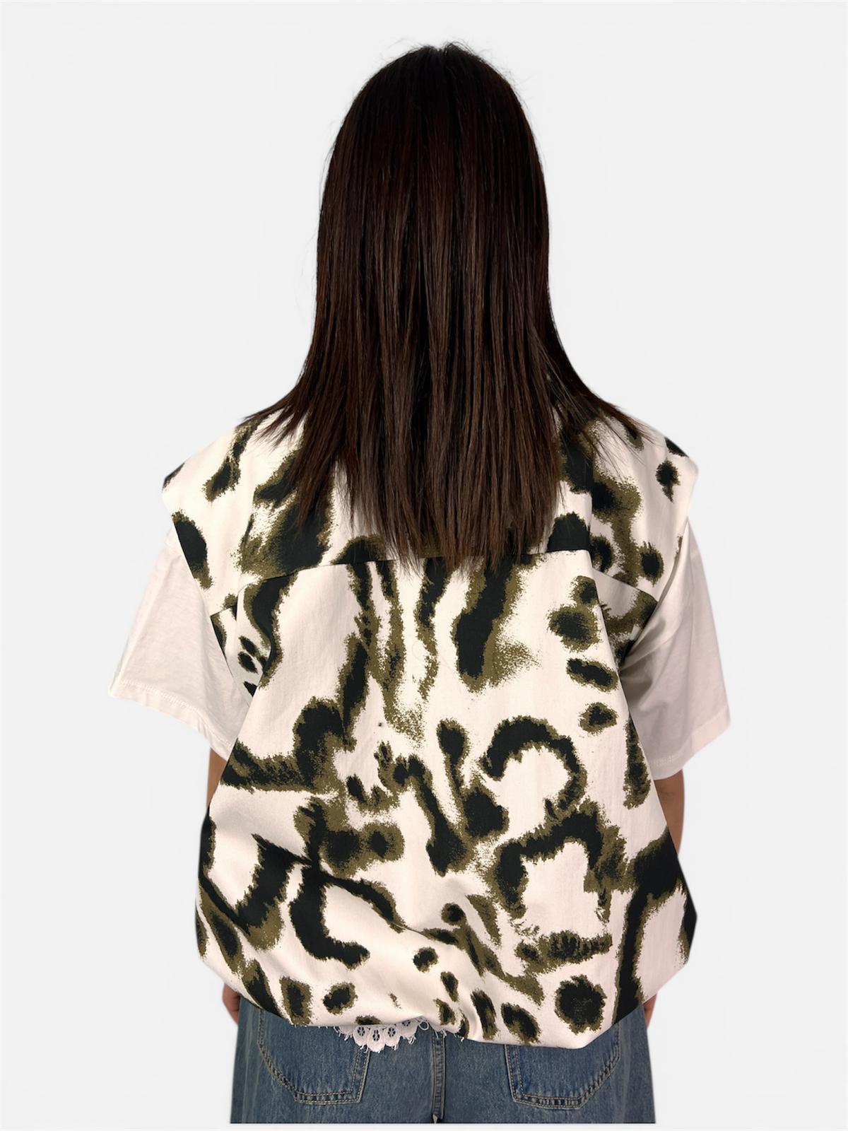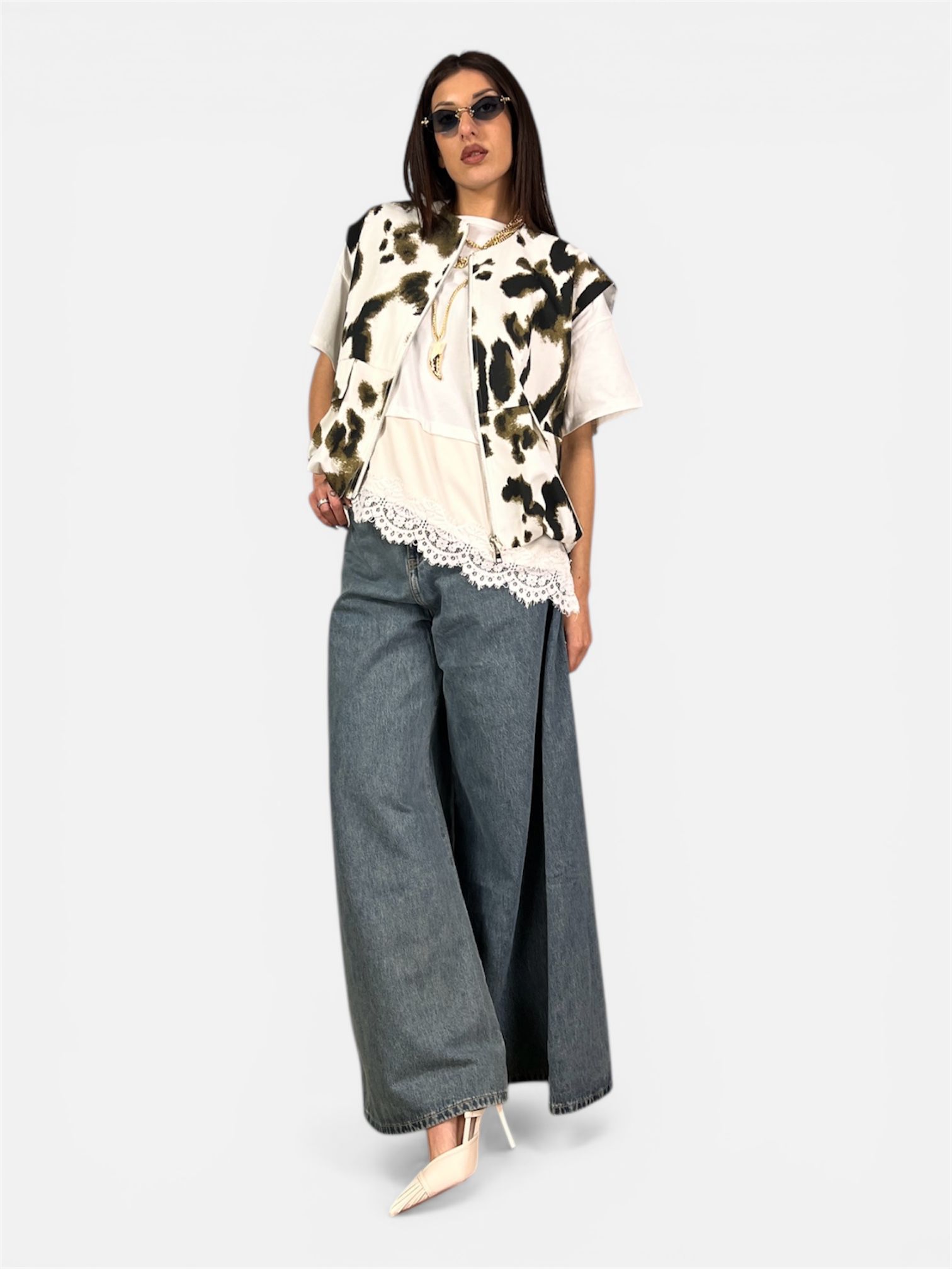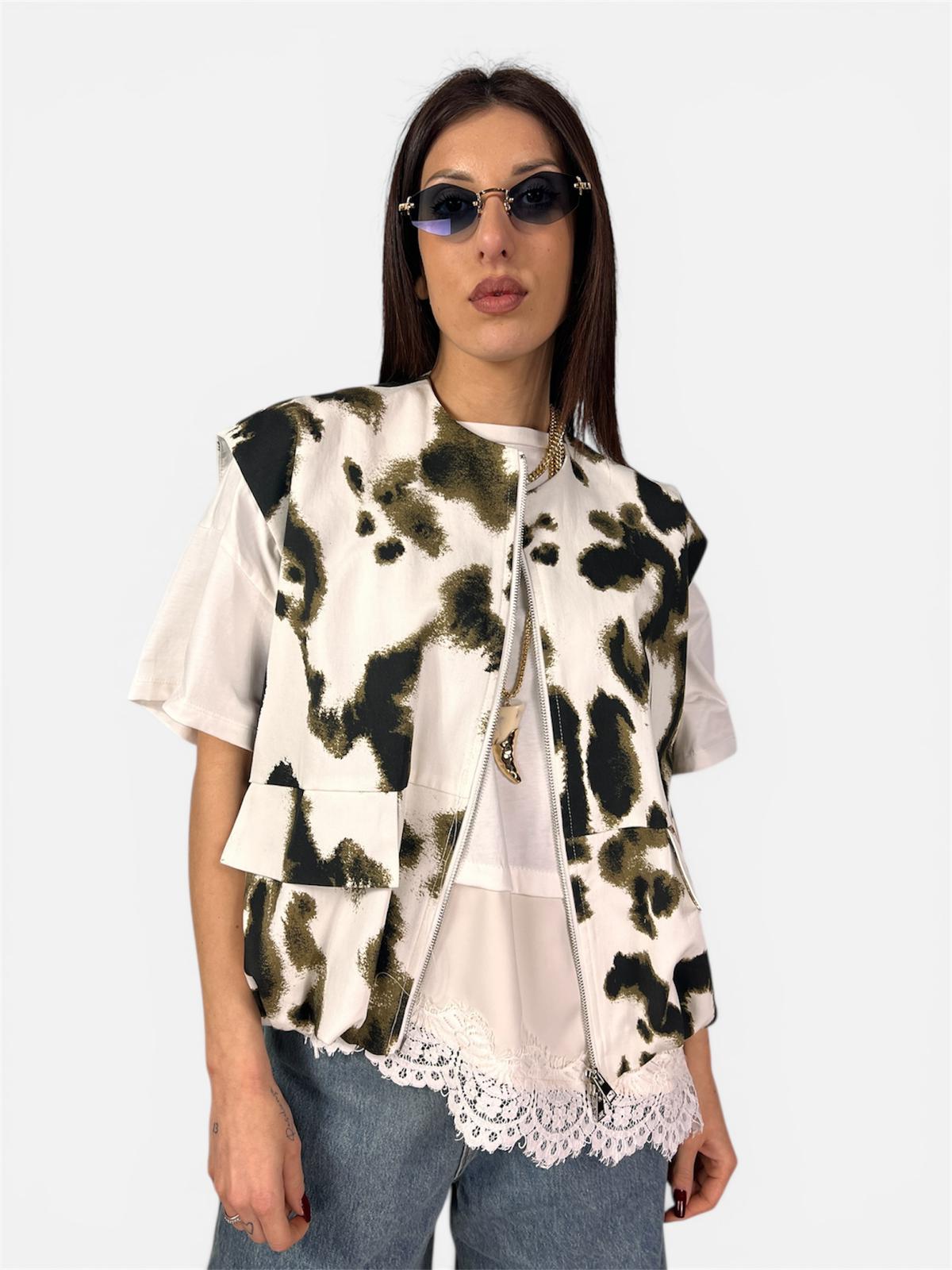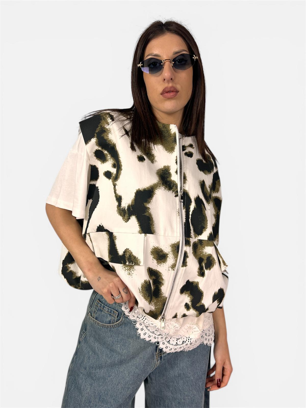Eleva il tuo street-style con questo bomber smanicato unico nel suo genere, che fonde l’estetica utility con un tocco romantico e sofisticato. Perfetto per chi non vuole passare inosservata, questo capo è un vero e proprio pezzo d’ispirazione “contemporary art”.