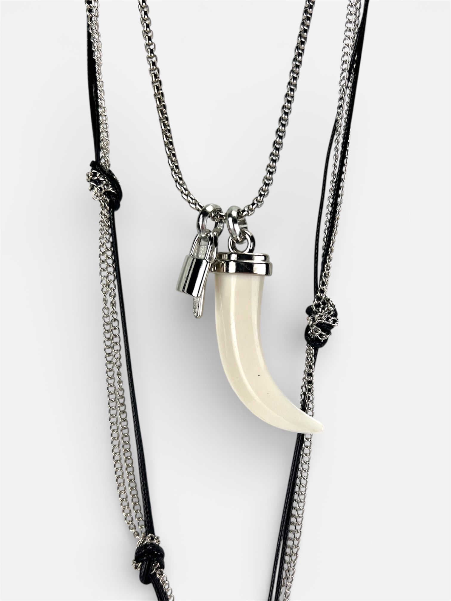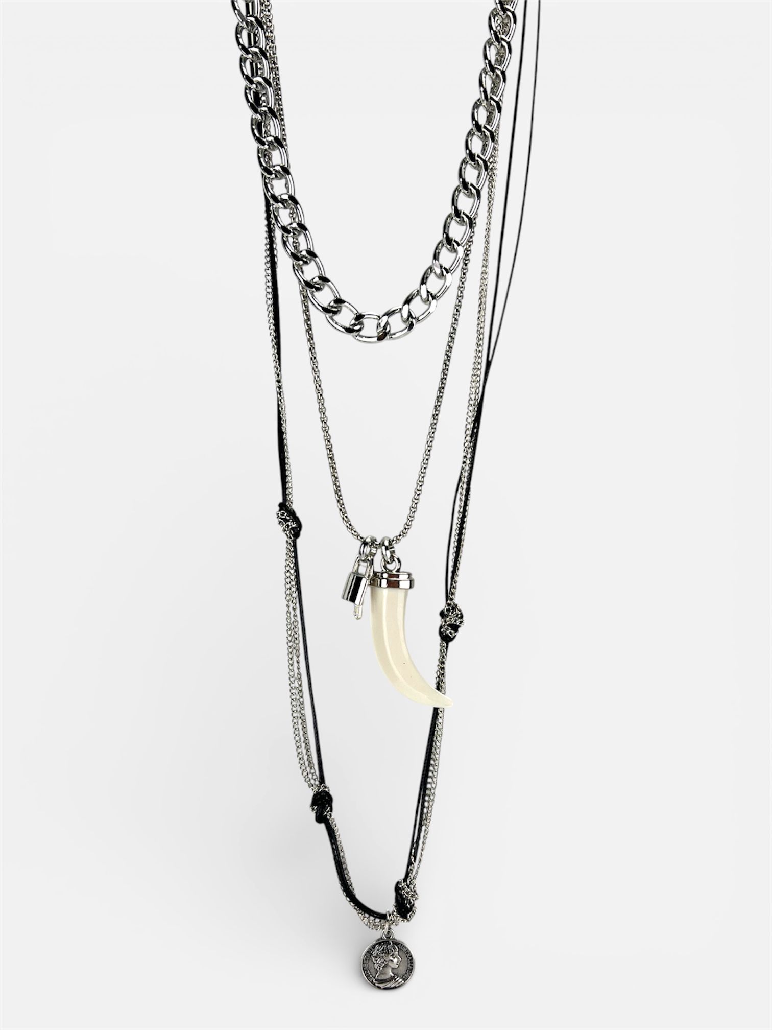 • Design Multi-Strato: Composta da una combinazione di catene a maglia differente e un filo in morbido caucciù nero, impreziosita da pendenti iconici: un corno portafortuna e una medaglia finemente incisa.
