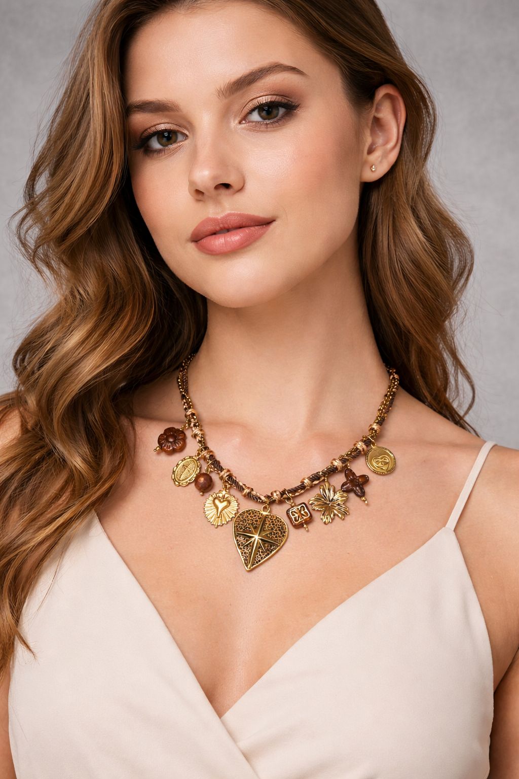 - Charms Simbolici: Al centro spicca un grande cuore traforato con stella, affiancato da un iconico Cuore Sacro, medagliette votive, fiori stilizzati e perle marroni.