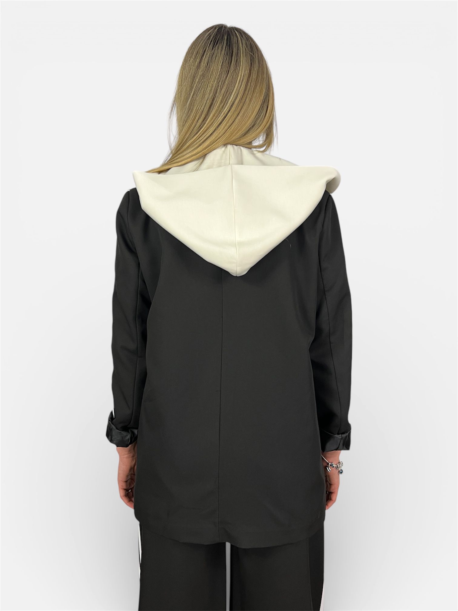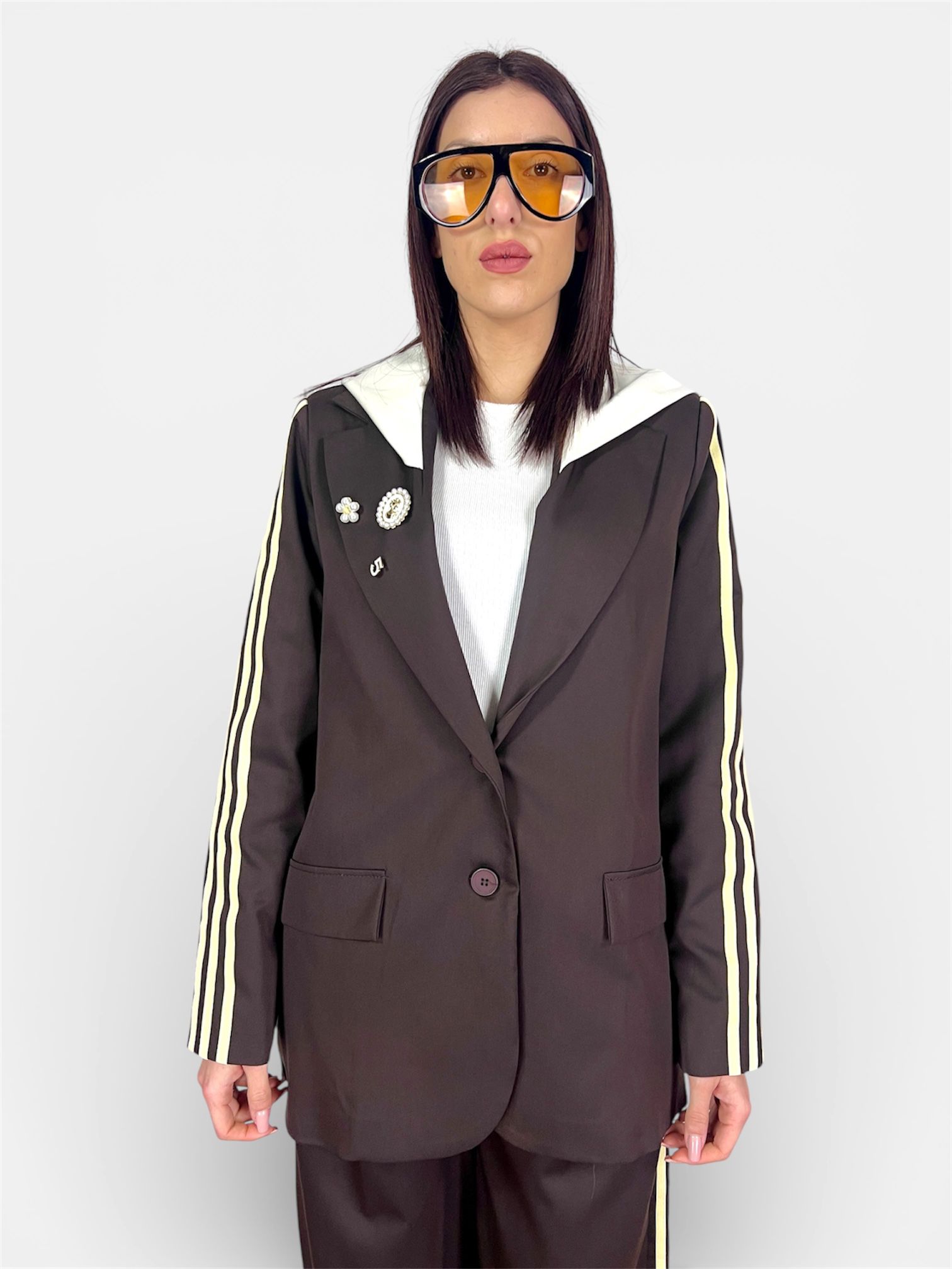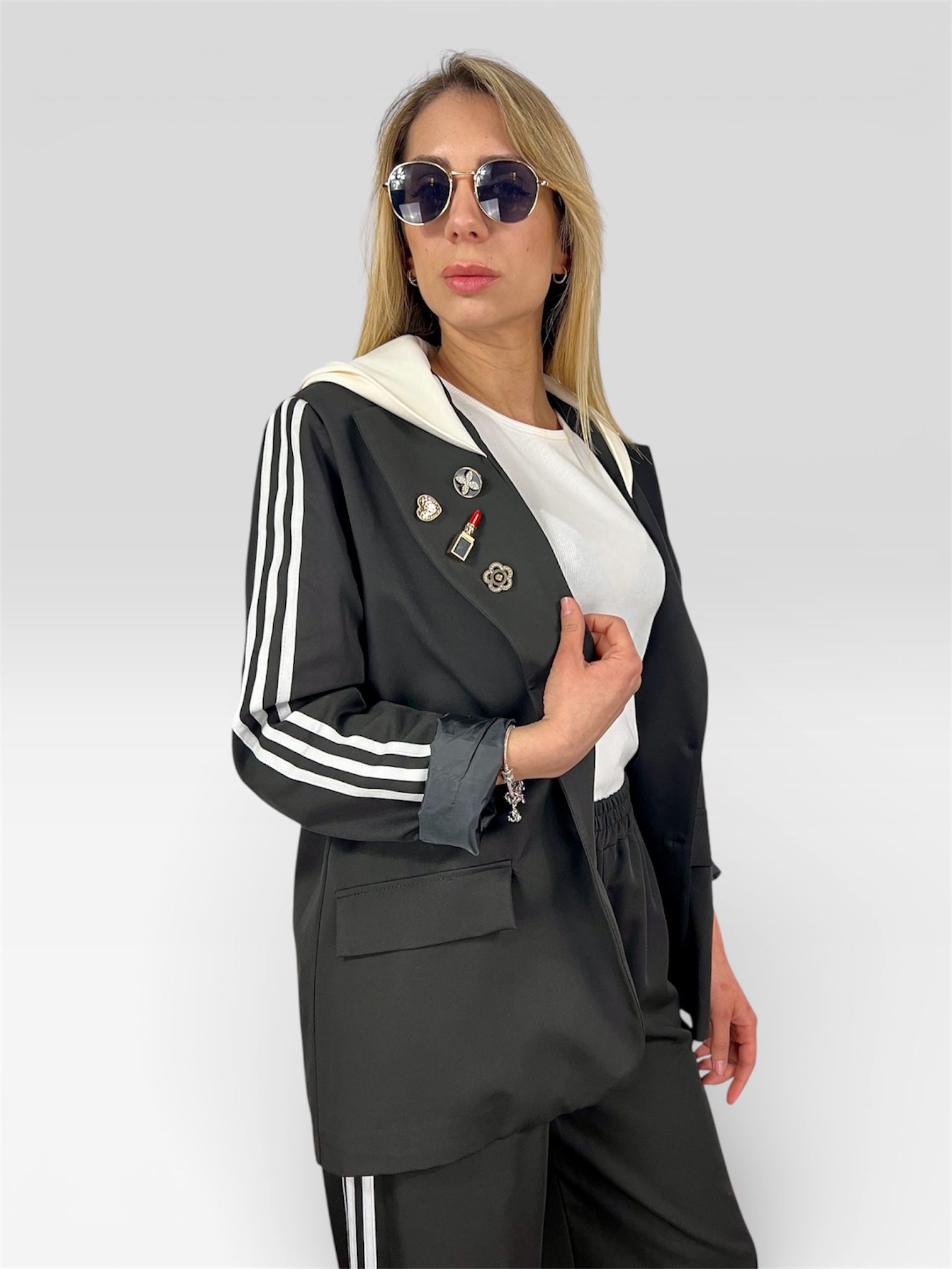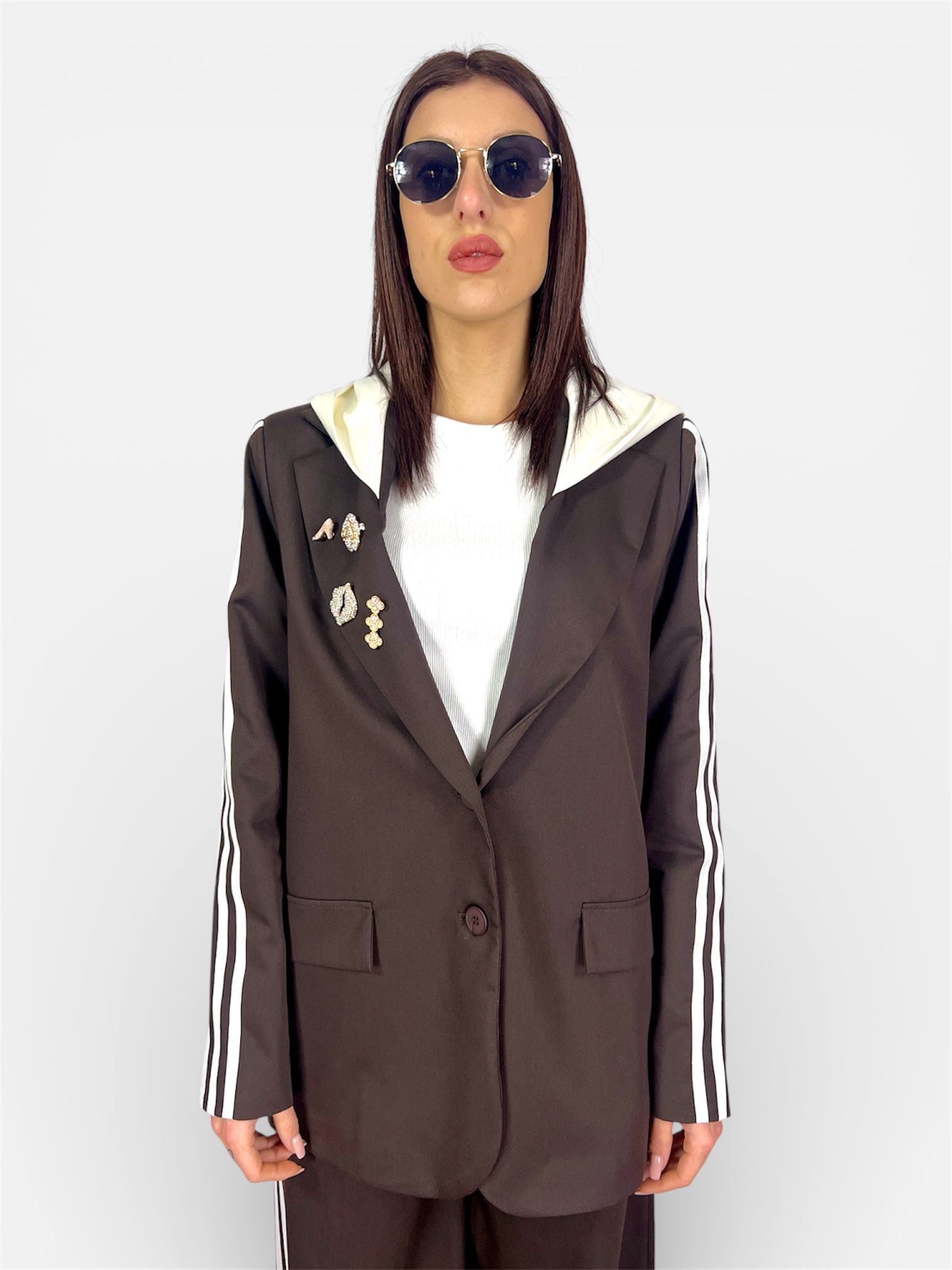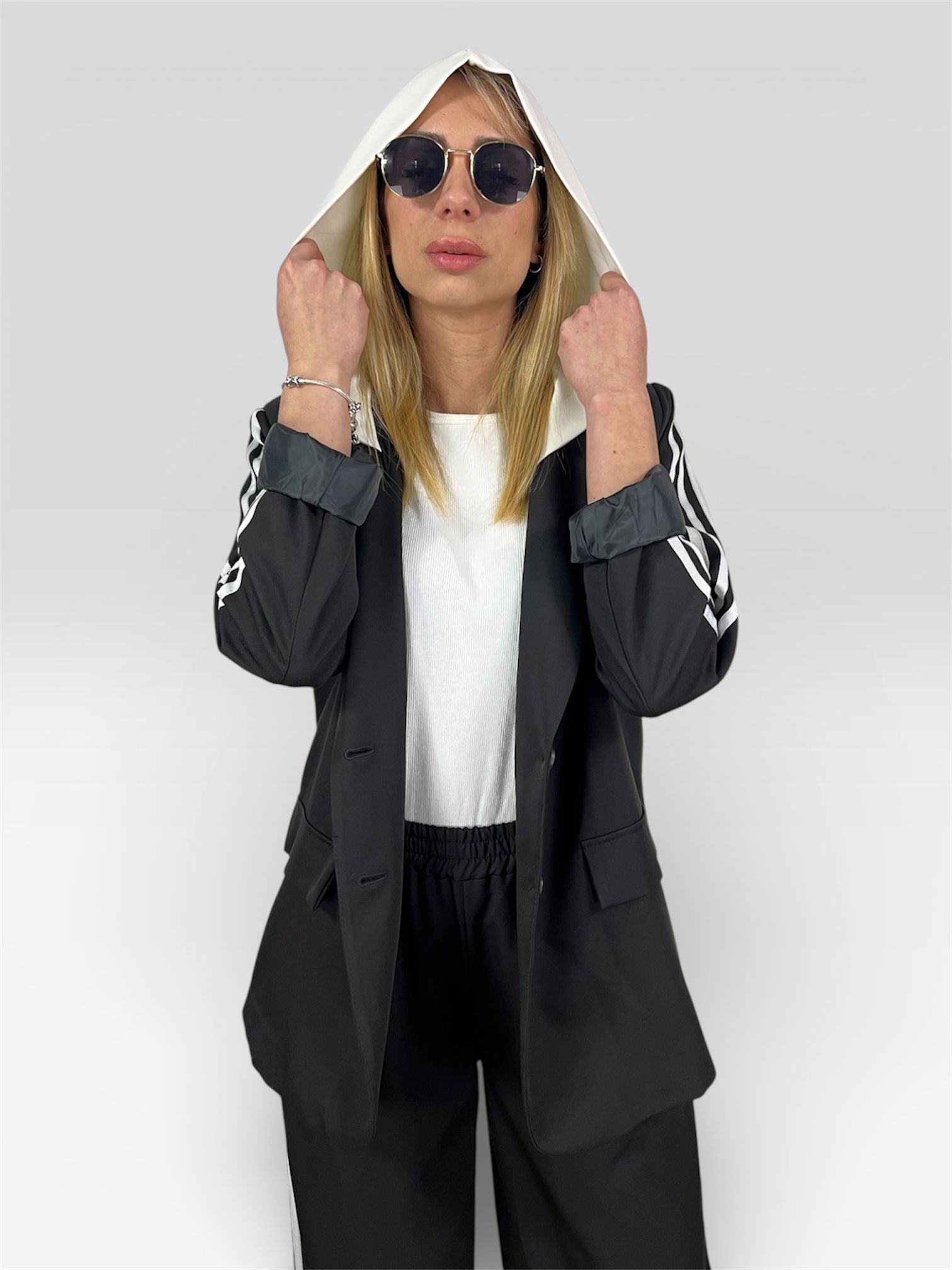 • completo streetwear giacca monopetto over con cappuccio e spille sul rever (removibili) banbe laterali pantalone largo con elastico in vita