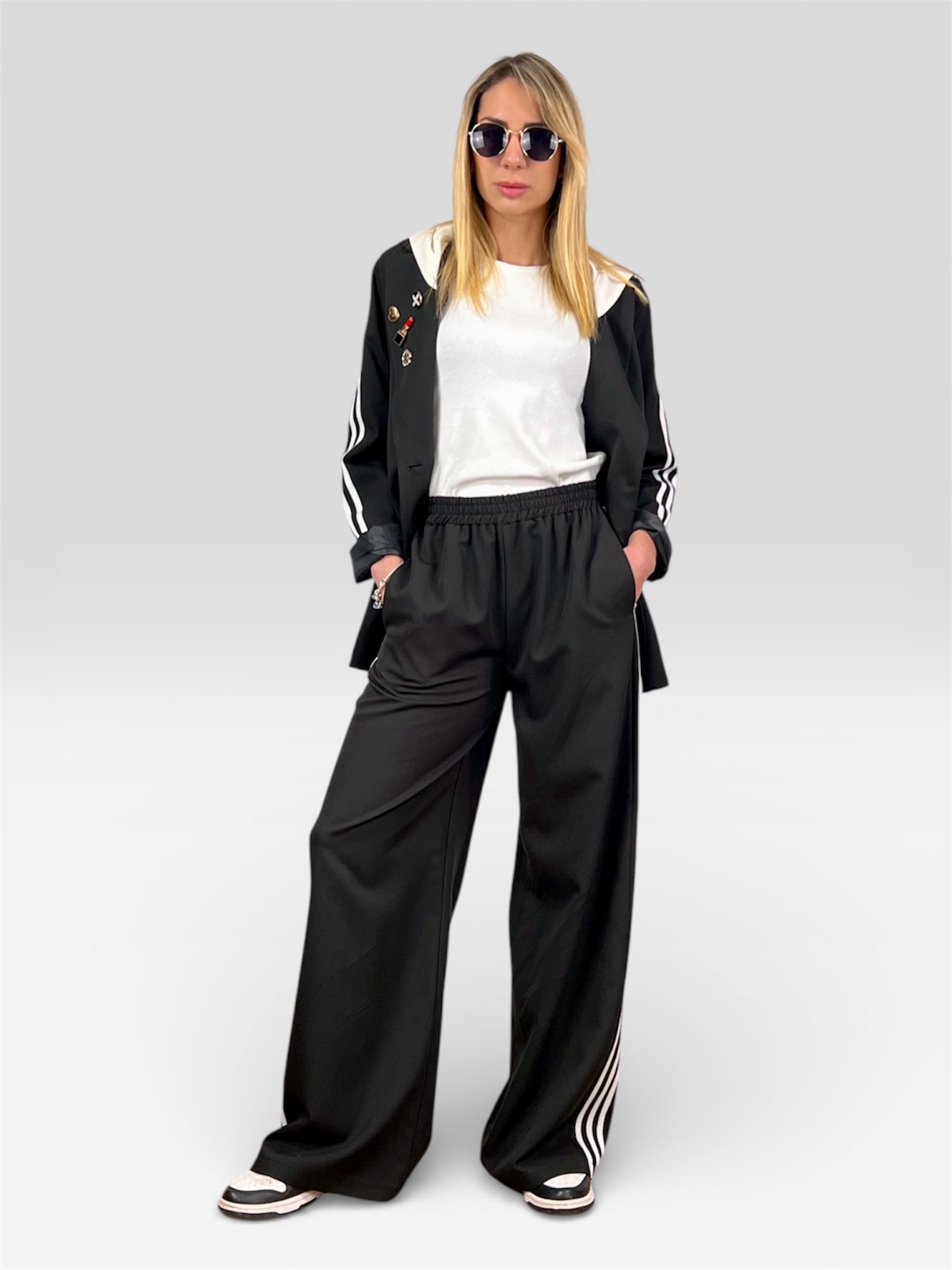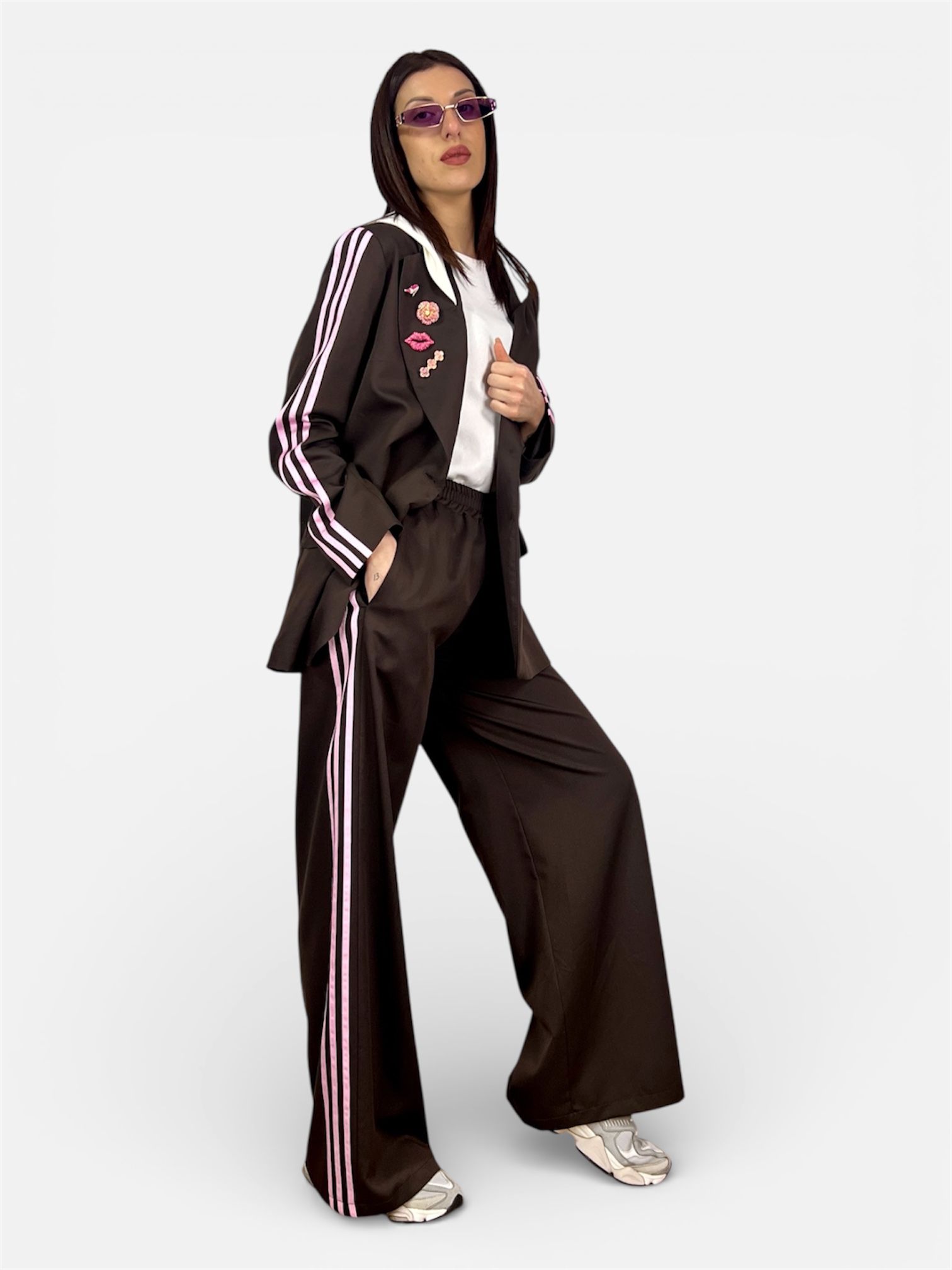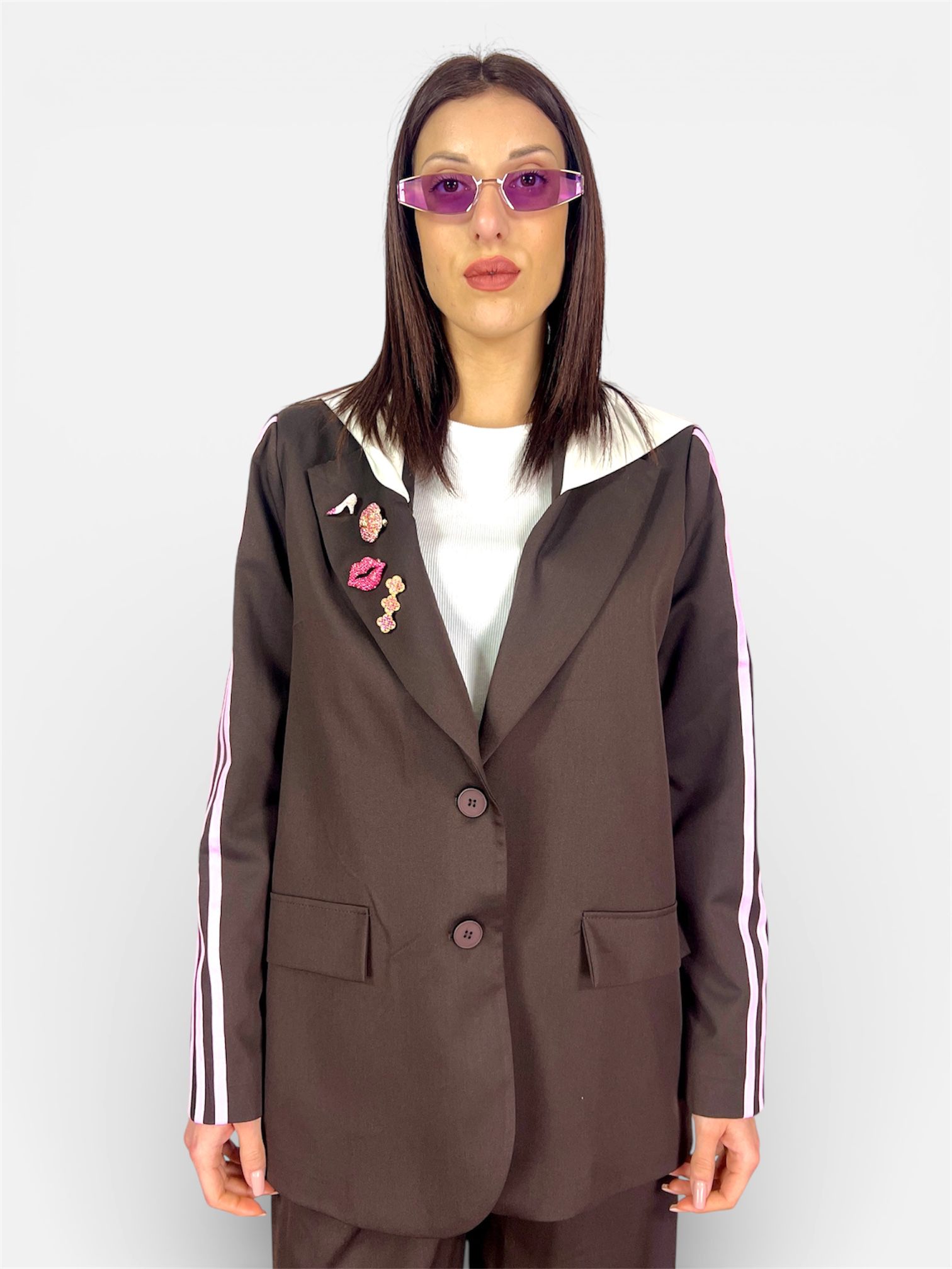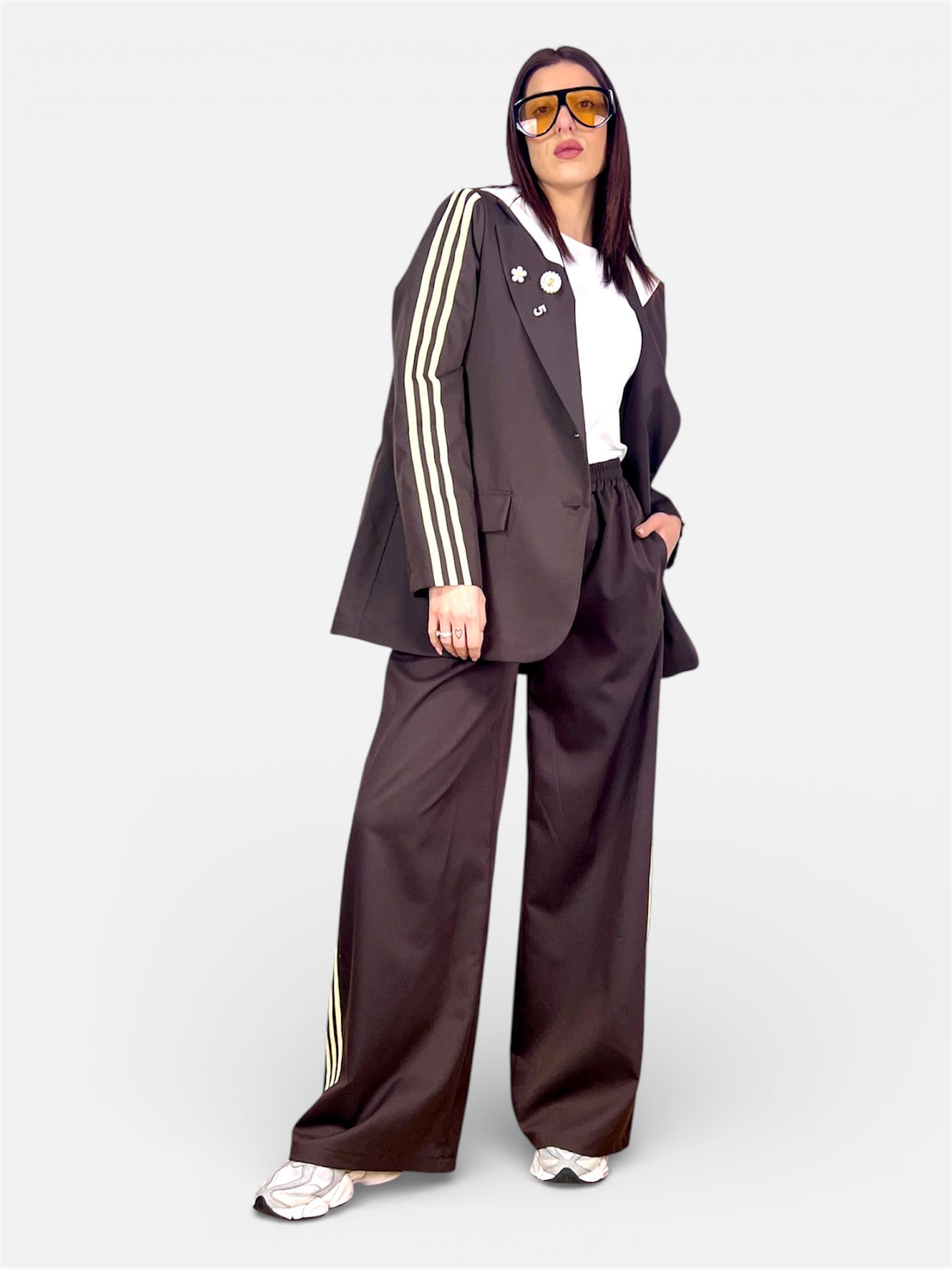 • completo streetwear giacca monopetto over con cappuccio e spille sul rever (removibili) banbe laterali pantalone largo con elastico in vita