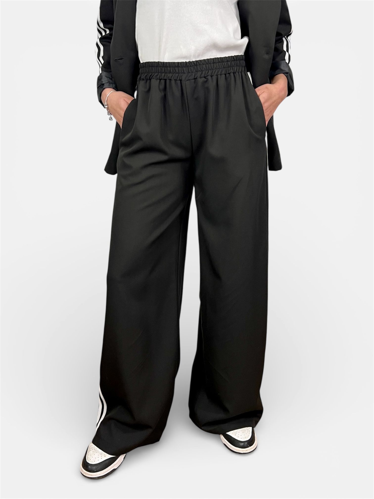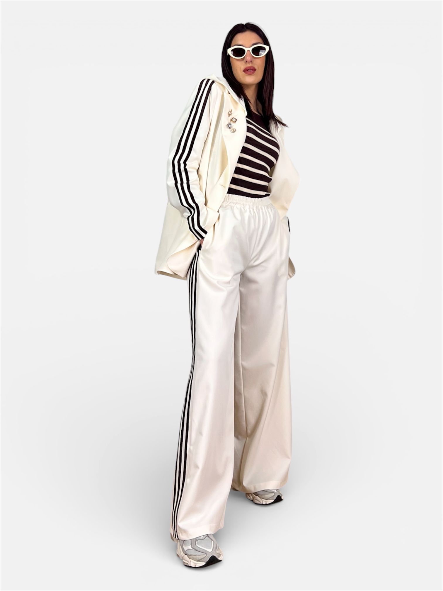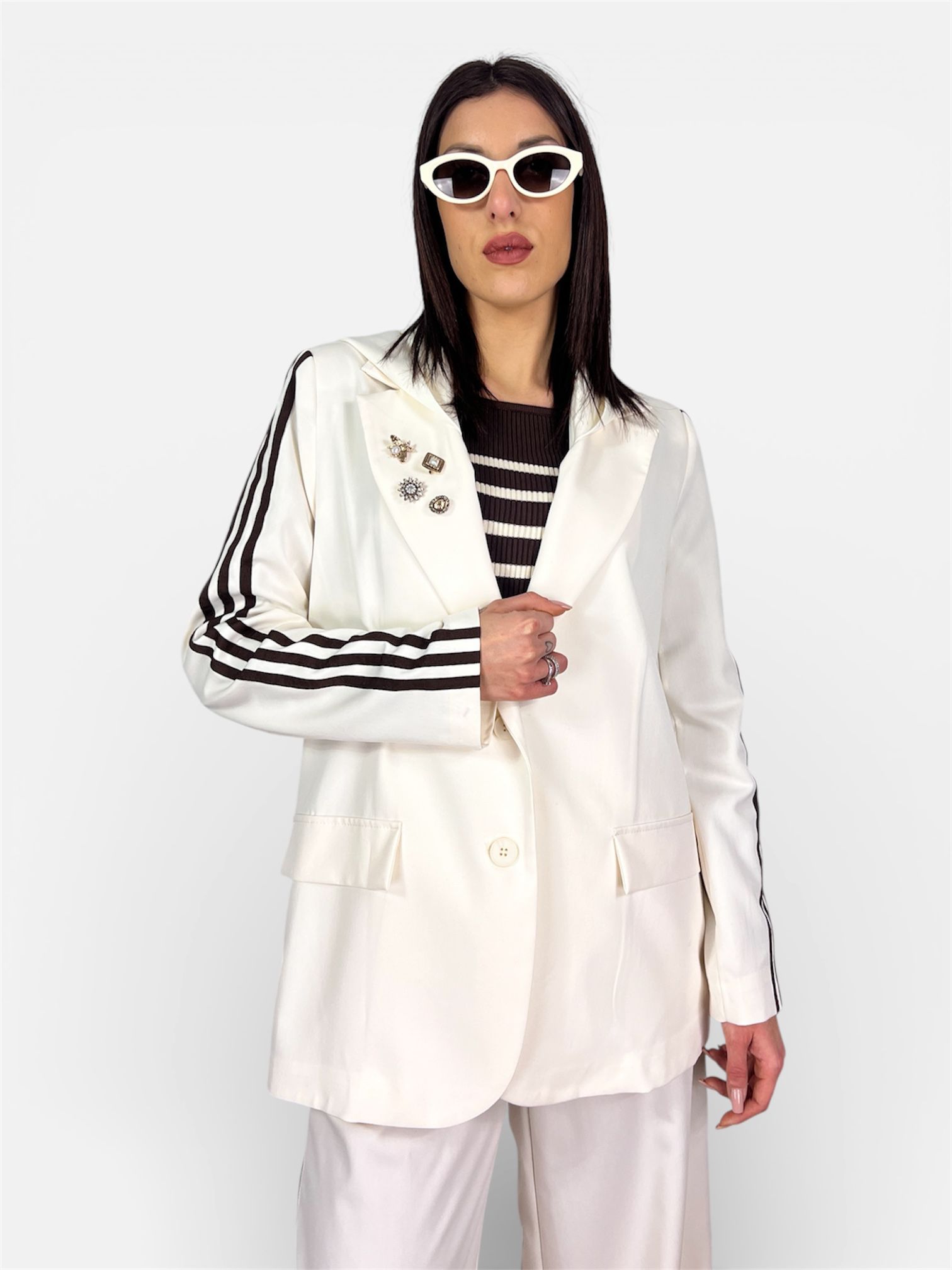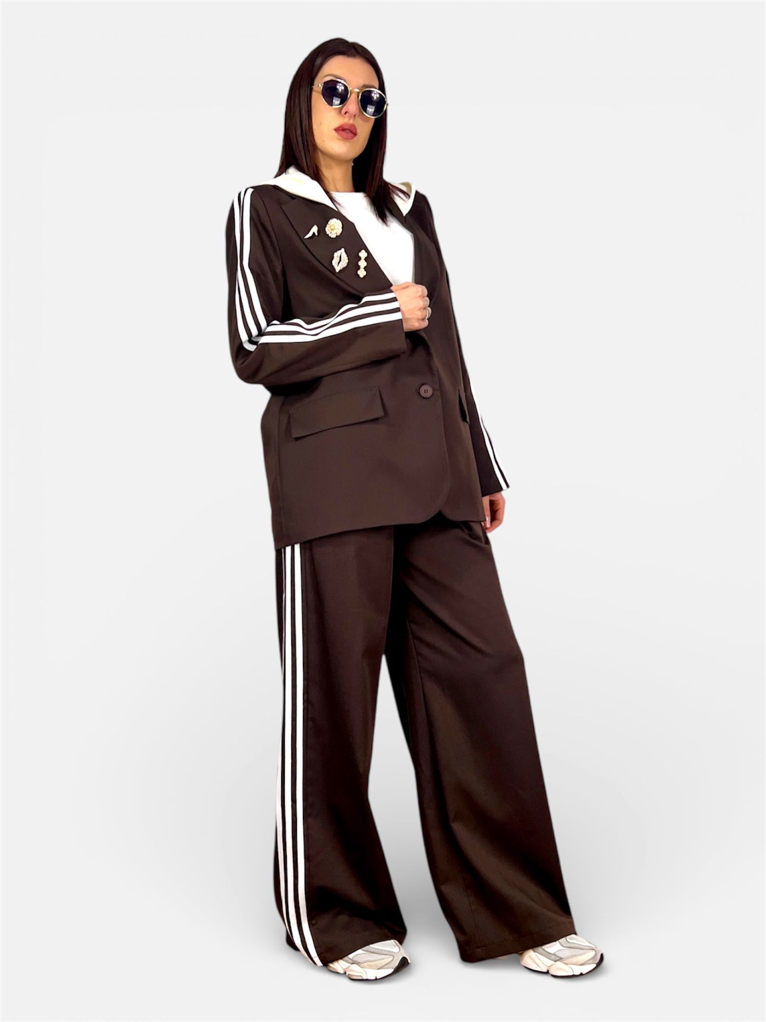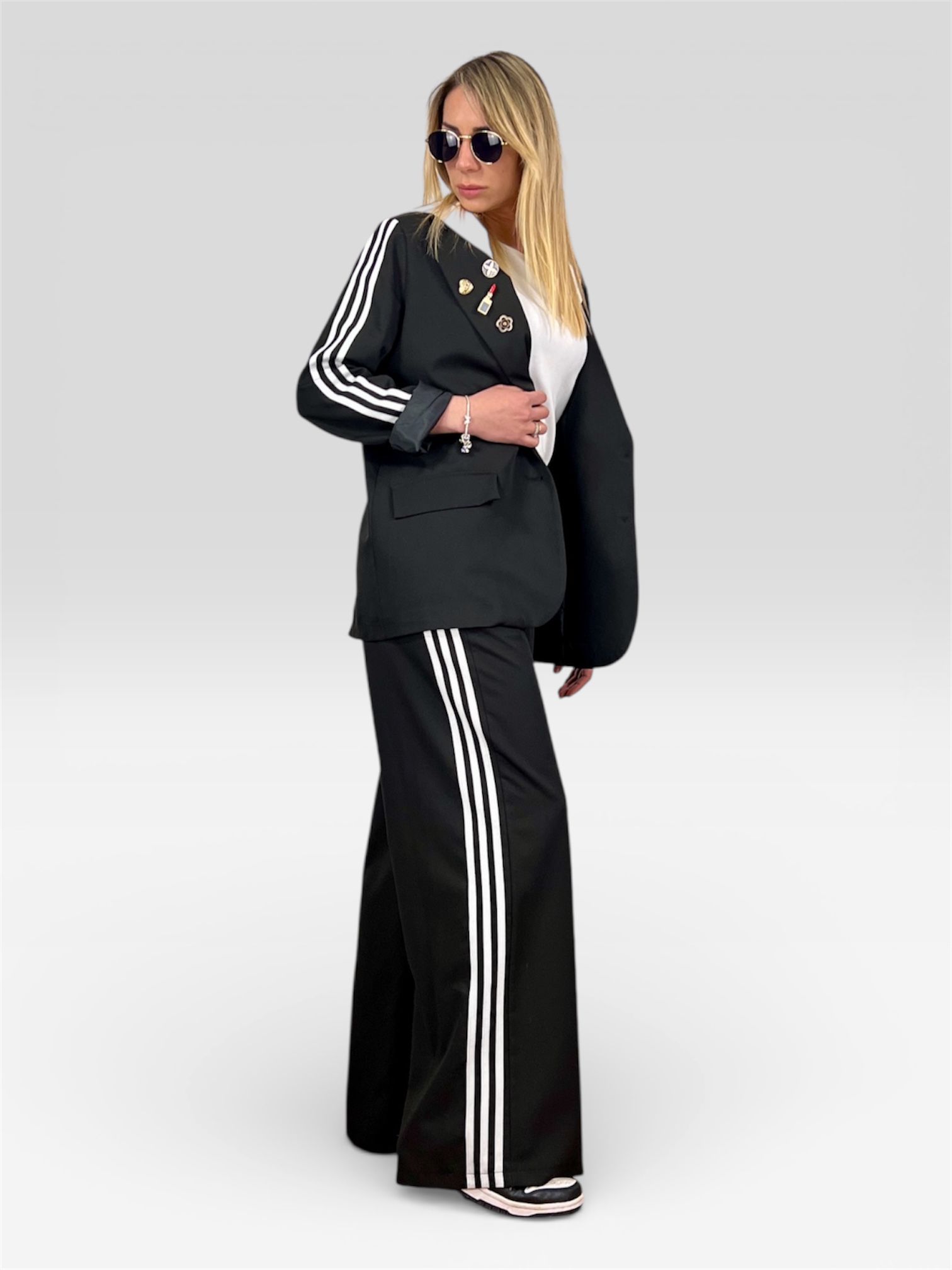 • completo streetwear giacca monopetto over con cappuccio e spille sul rever (removibili) banbe laterali pantalone largo con elastico in vita