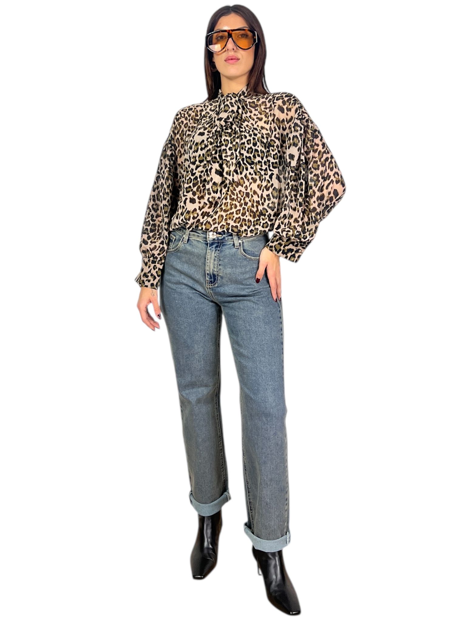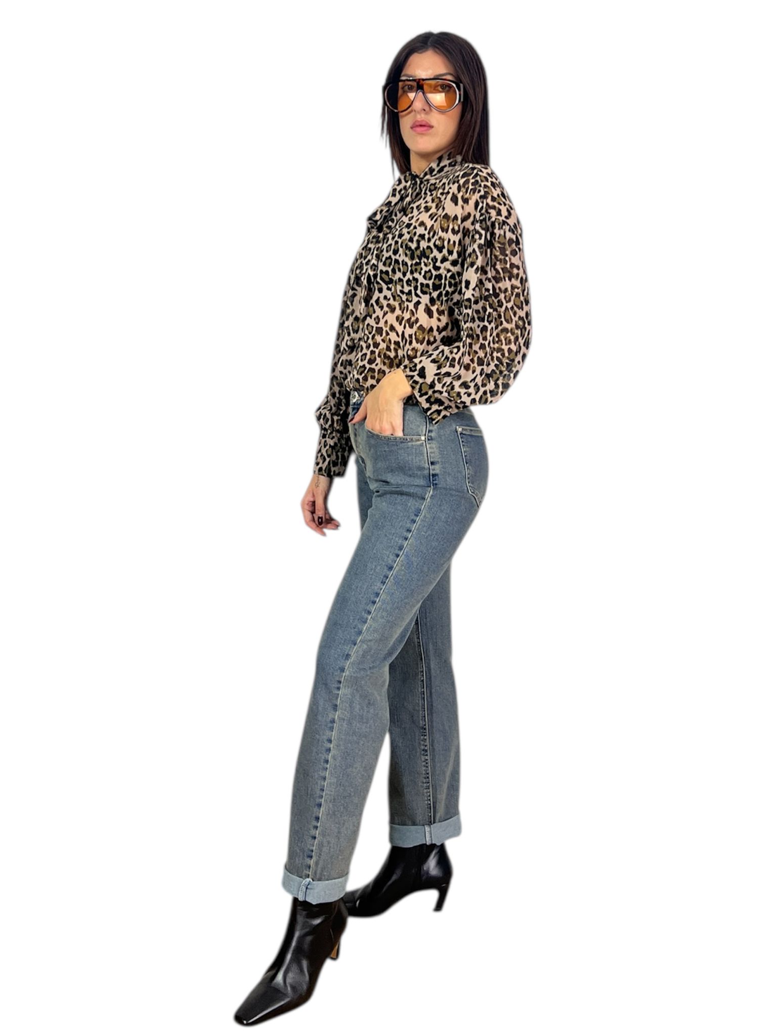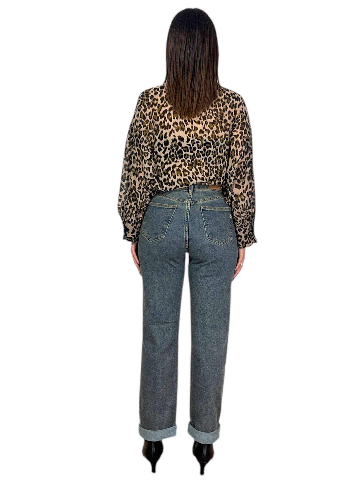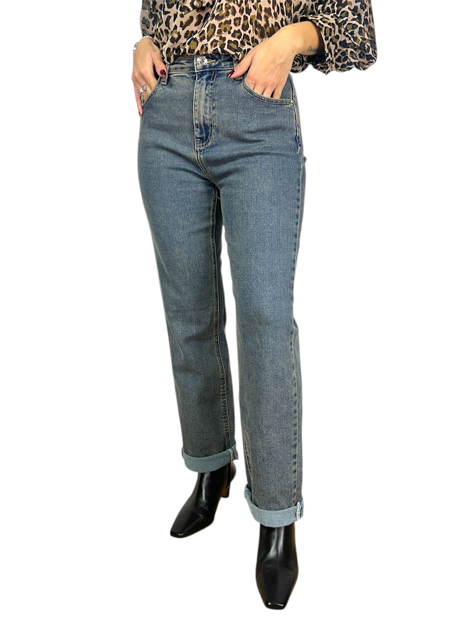 - modello pantalone effetto vintage denim chiaro con zip bottone