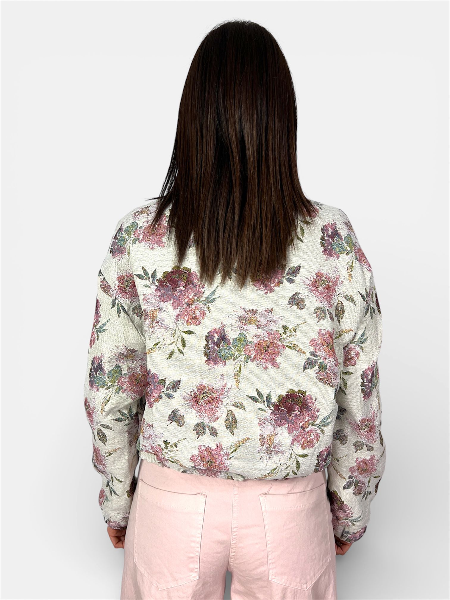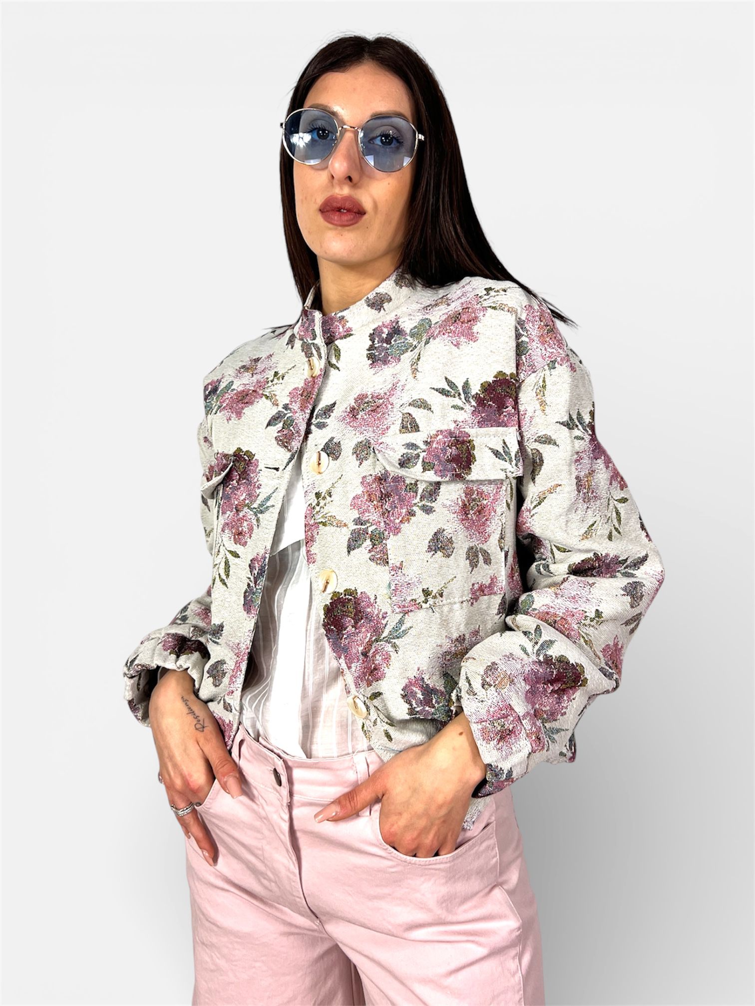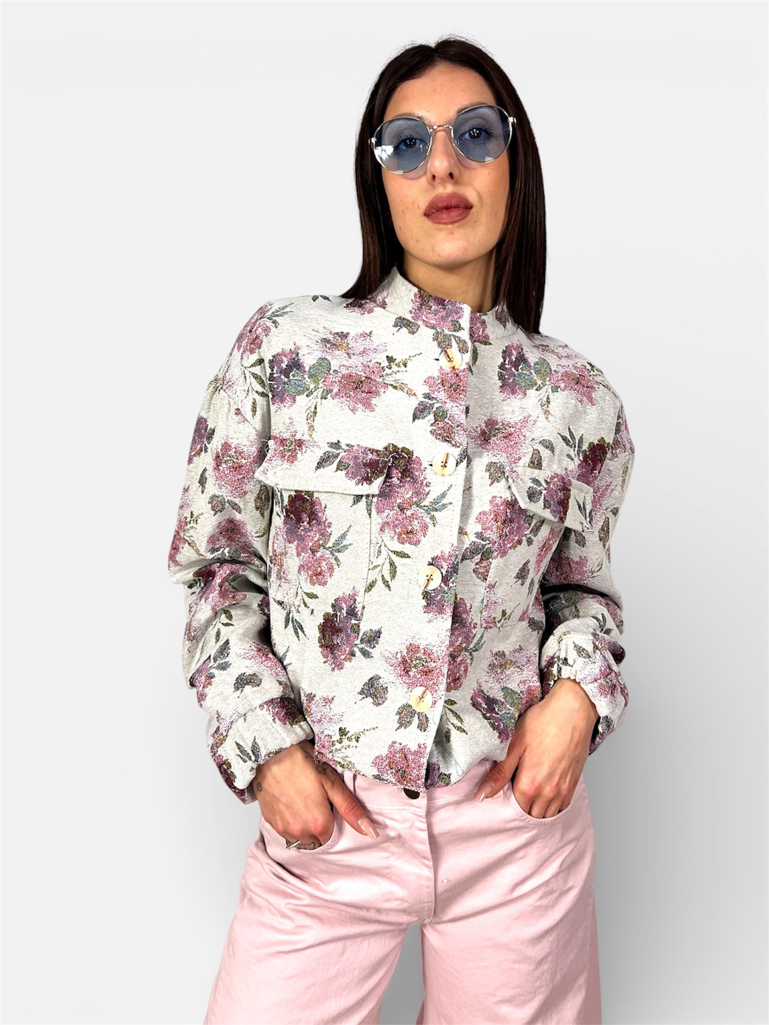 Eleva il tuo stile quotidiano con questo bomber unico, dove l’ispirazione floreale incontra un design moderno e strutturato. Un capo versatile che aggiunge una nota romantica e ricercata a ogni outfit.