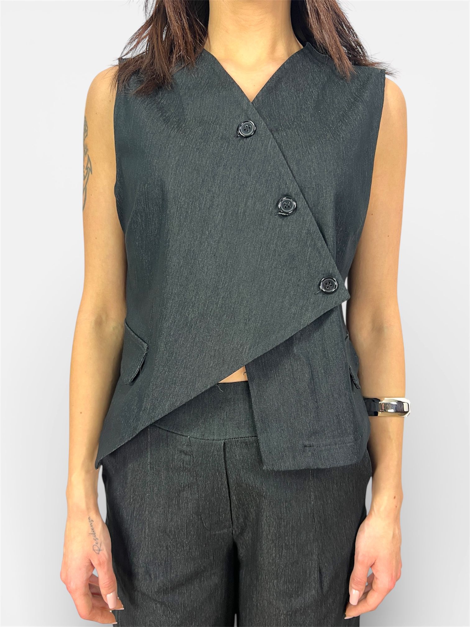 - modello gilet in bengalian fiammato con chiusura frontale asimmetrica