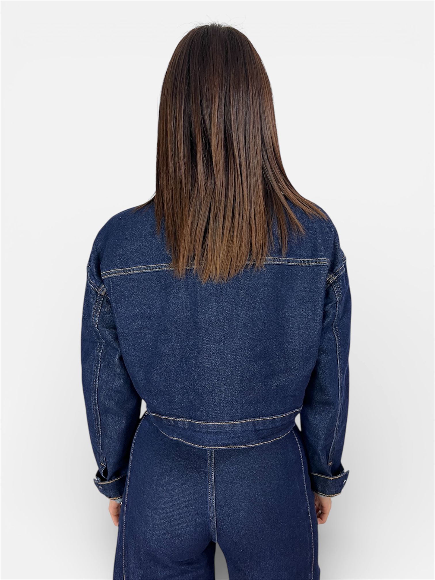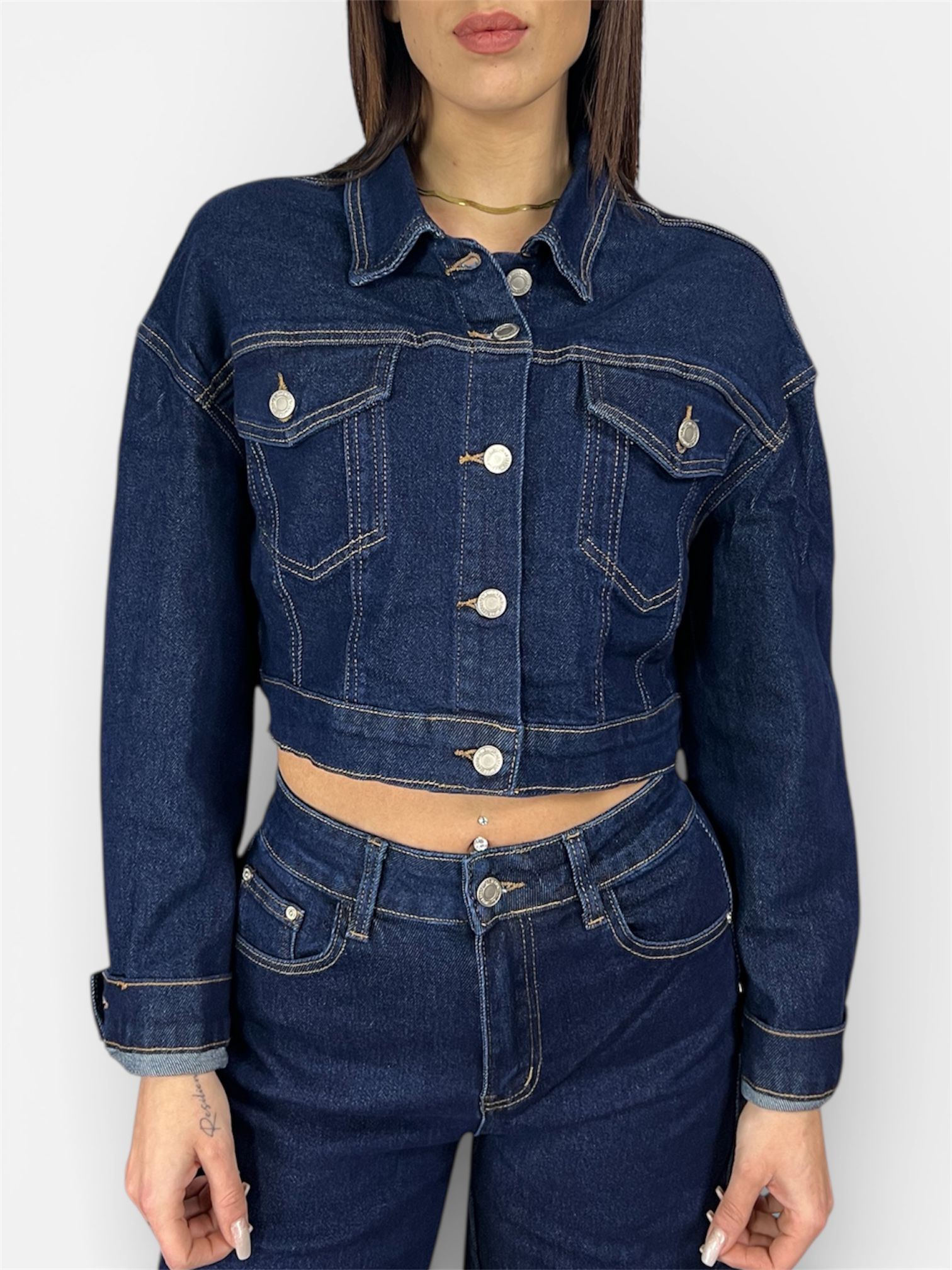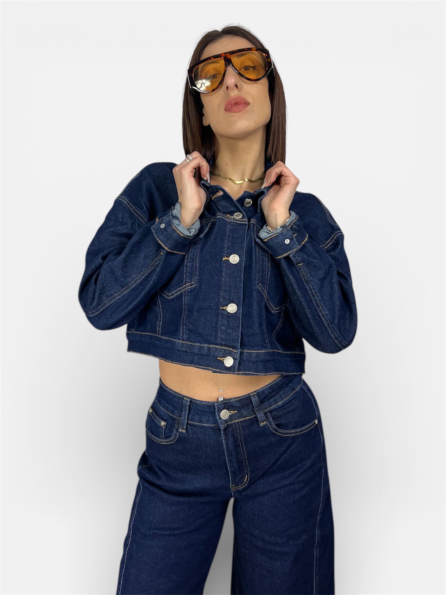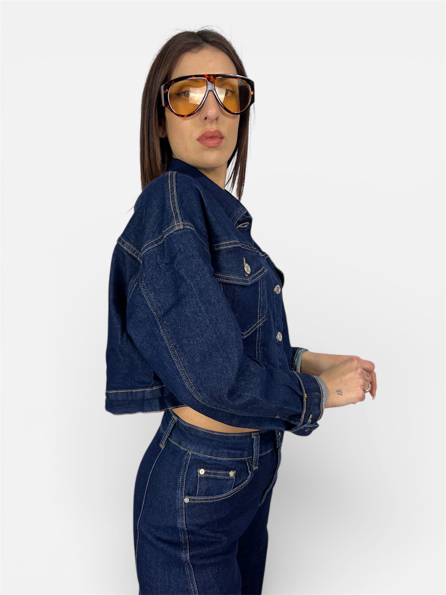 • modello giubbino crop in jeans colletto chiusura bottoni