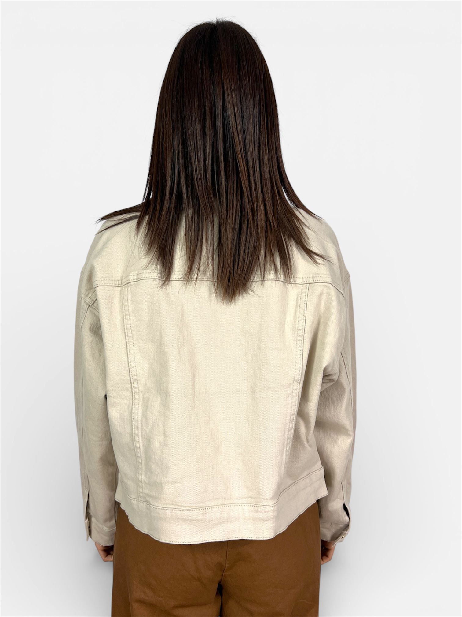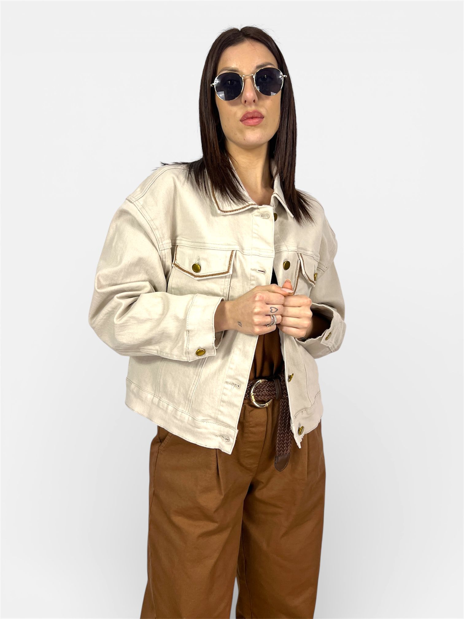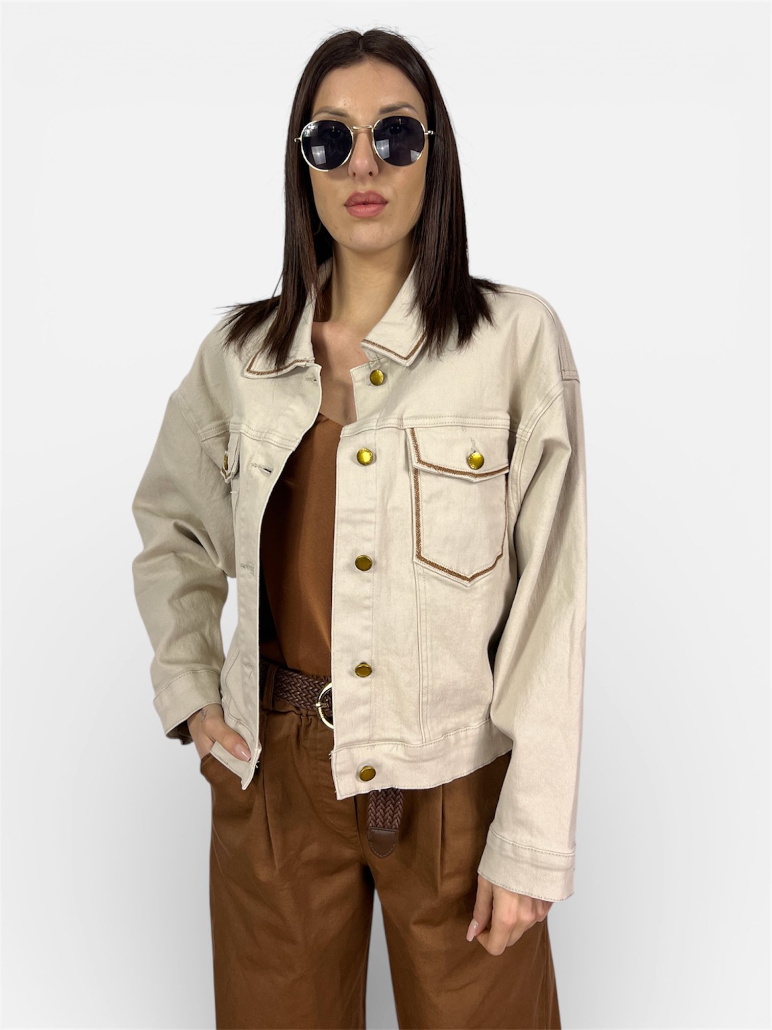 - Modello: Giubbino in denim beige con tasche frontali rifiniture a contrasto