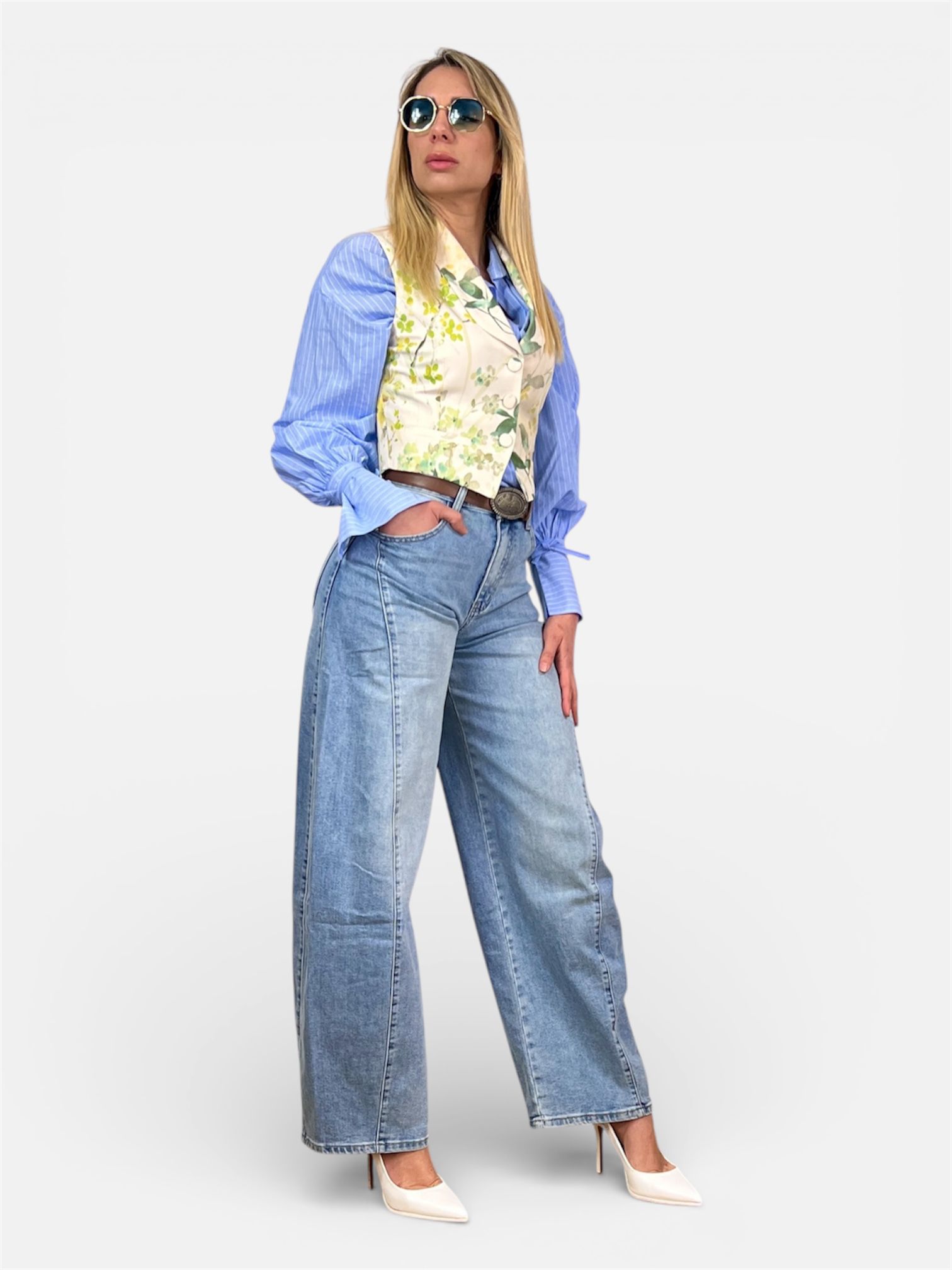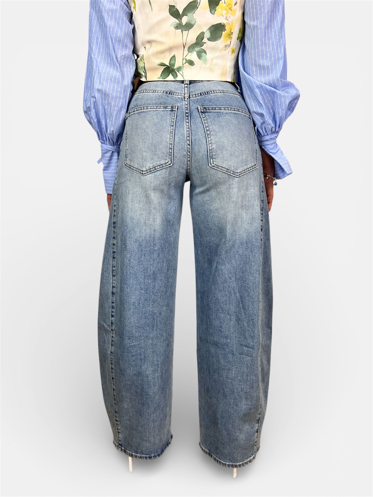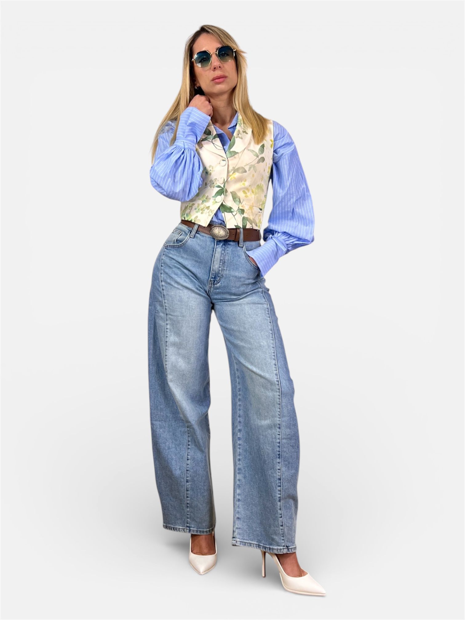 • Modello jeans balloon cinque tasche lavaggio medio chiusura zip e bottone con cinta