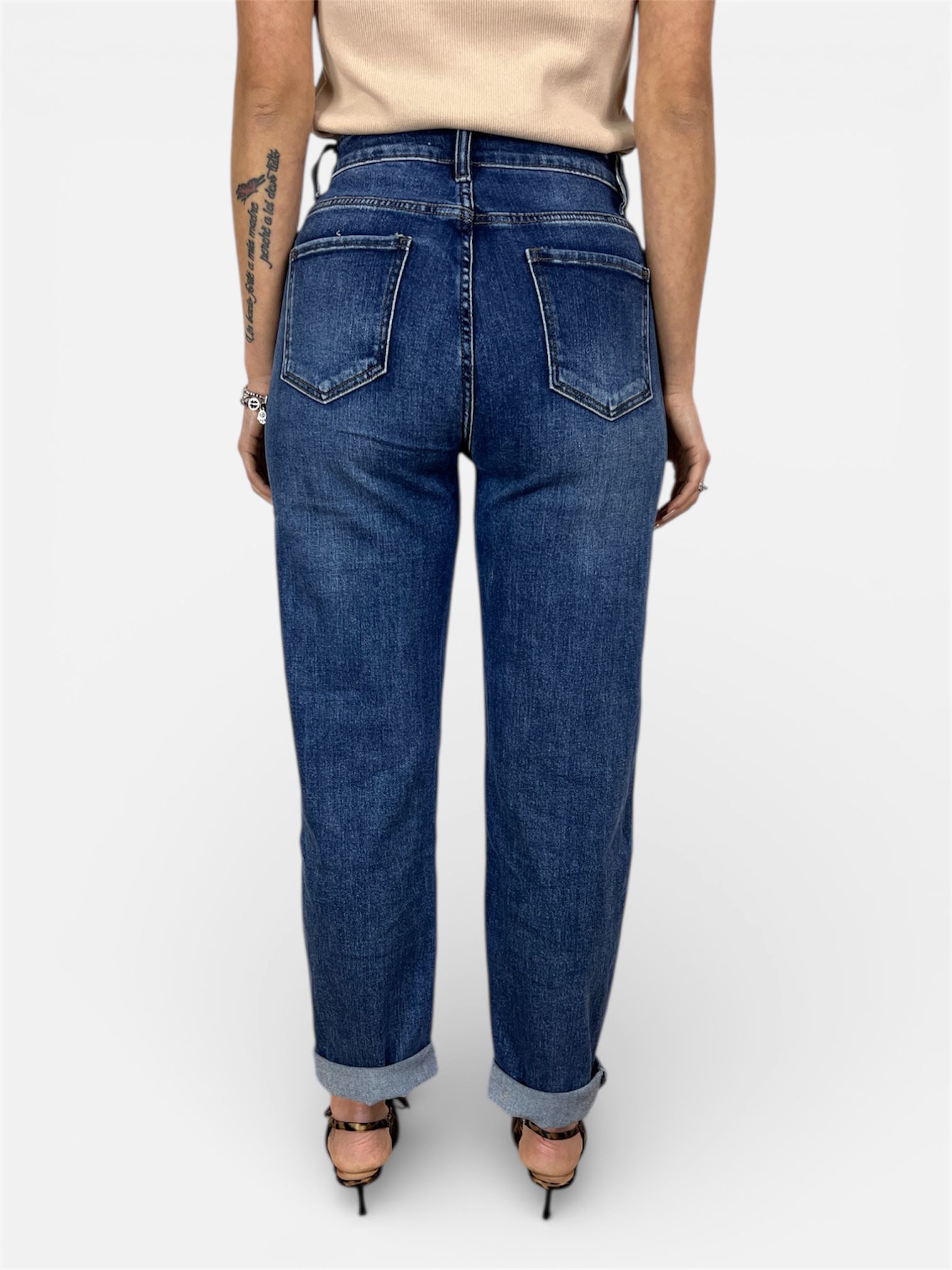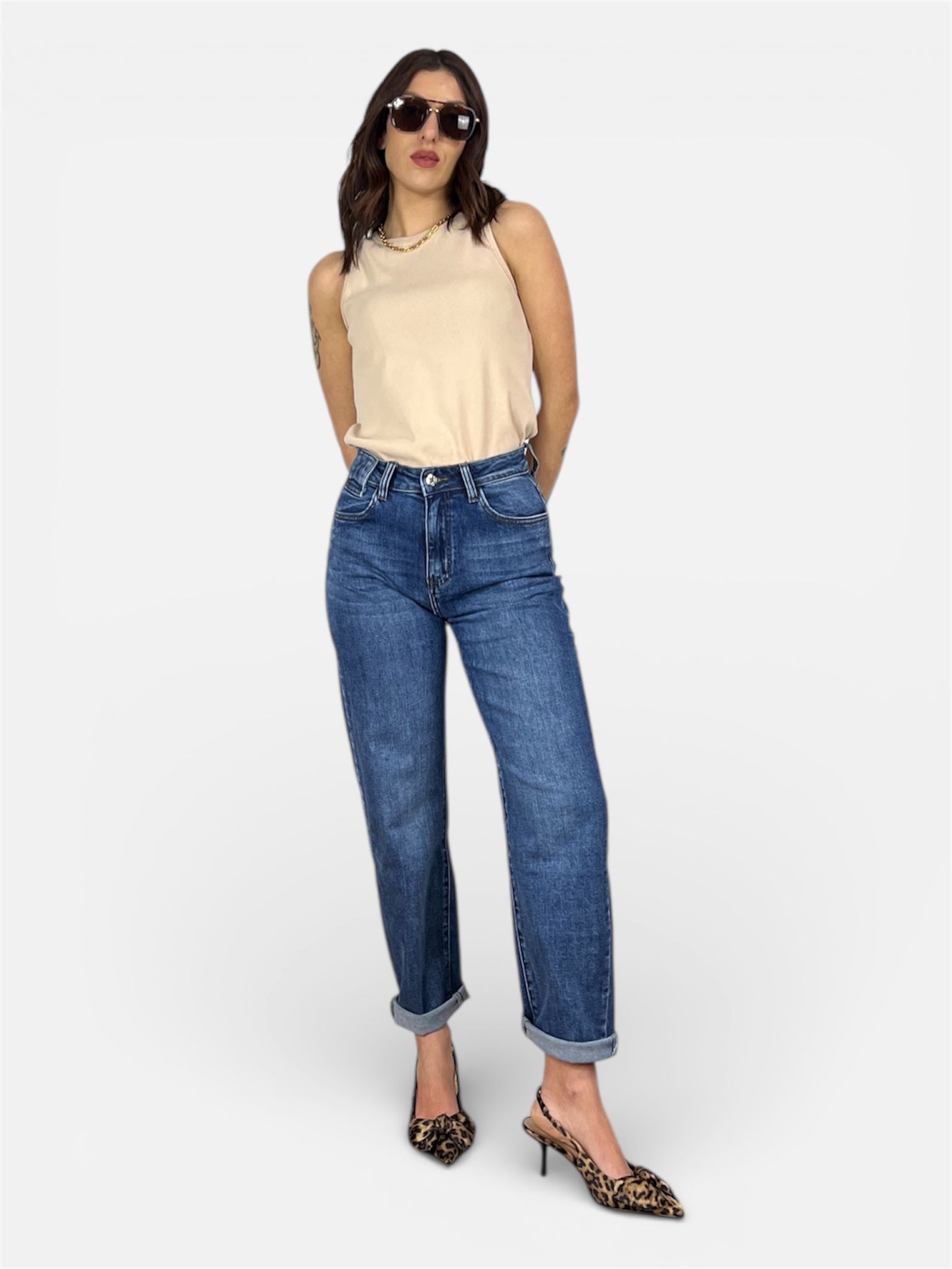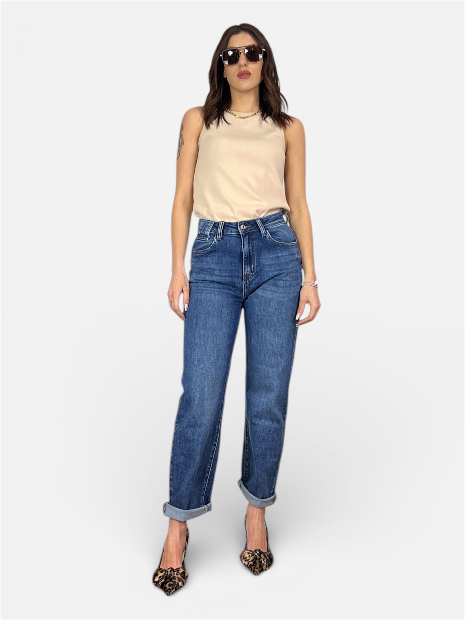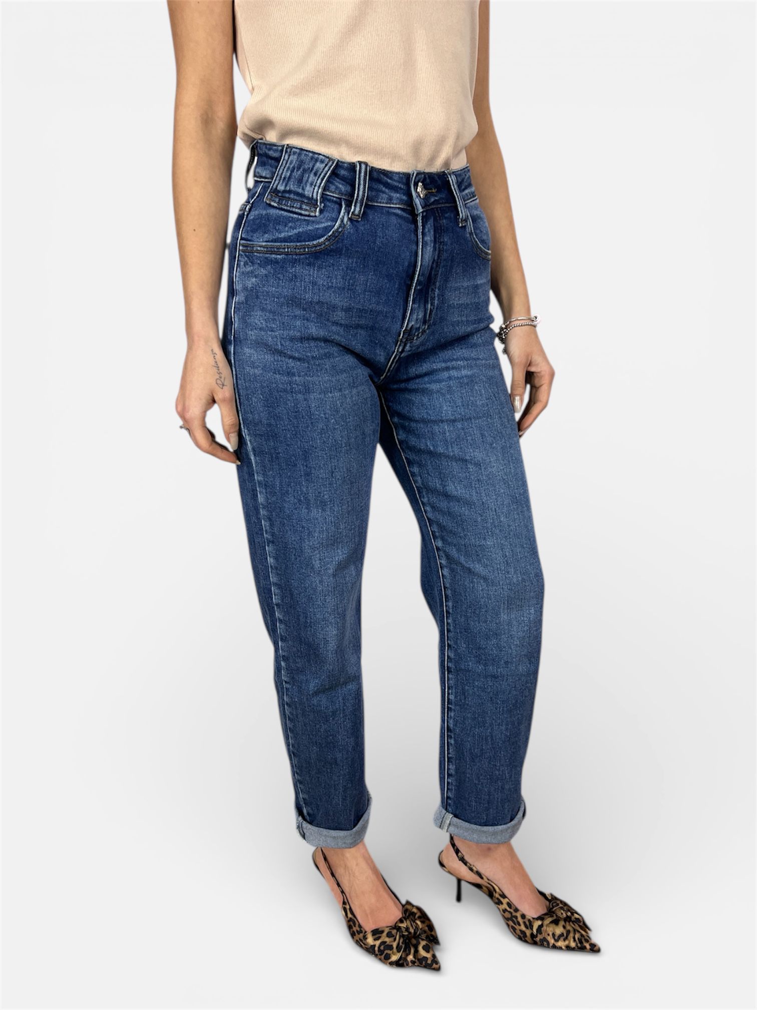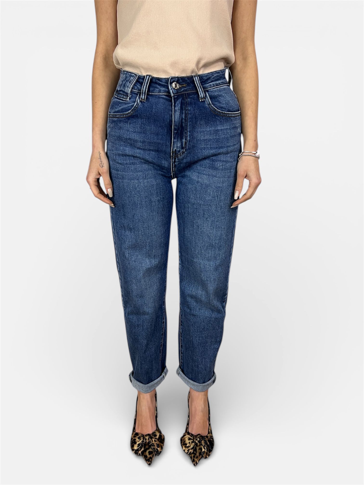 - modello jeans mom-fit lavaggio medio 5tasche e chiusura zip e bottone