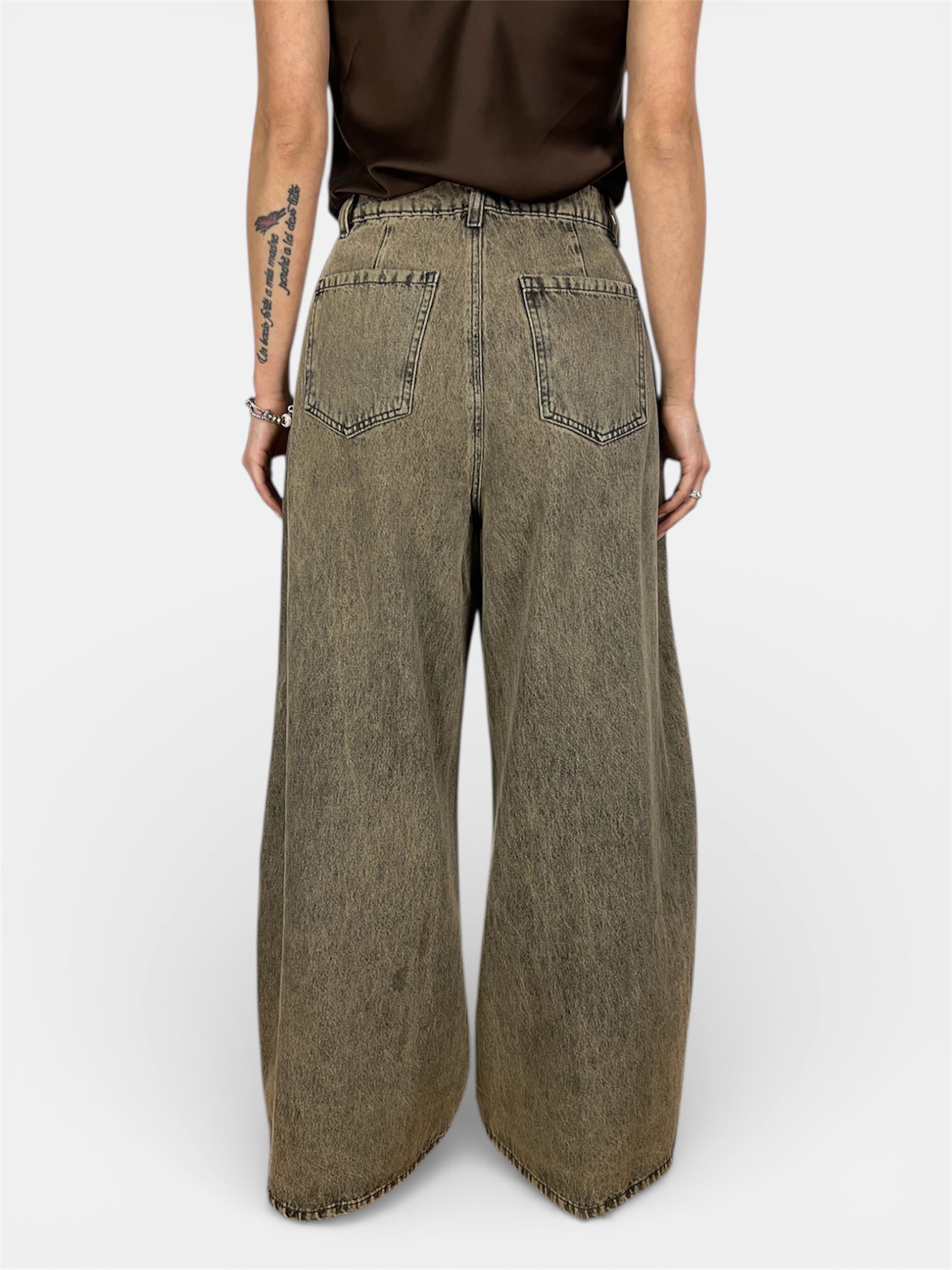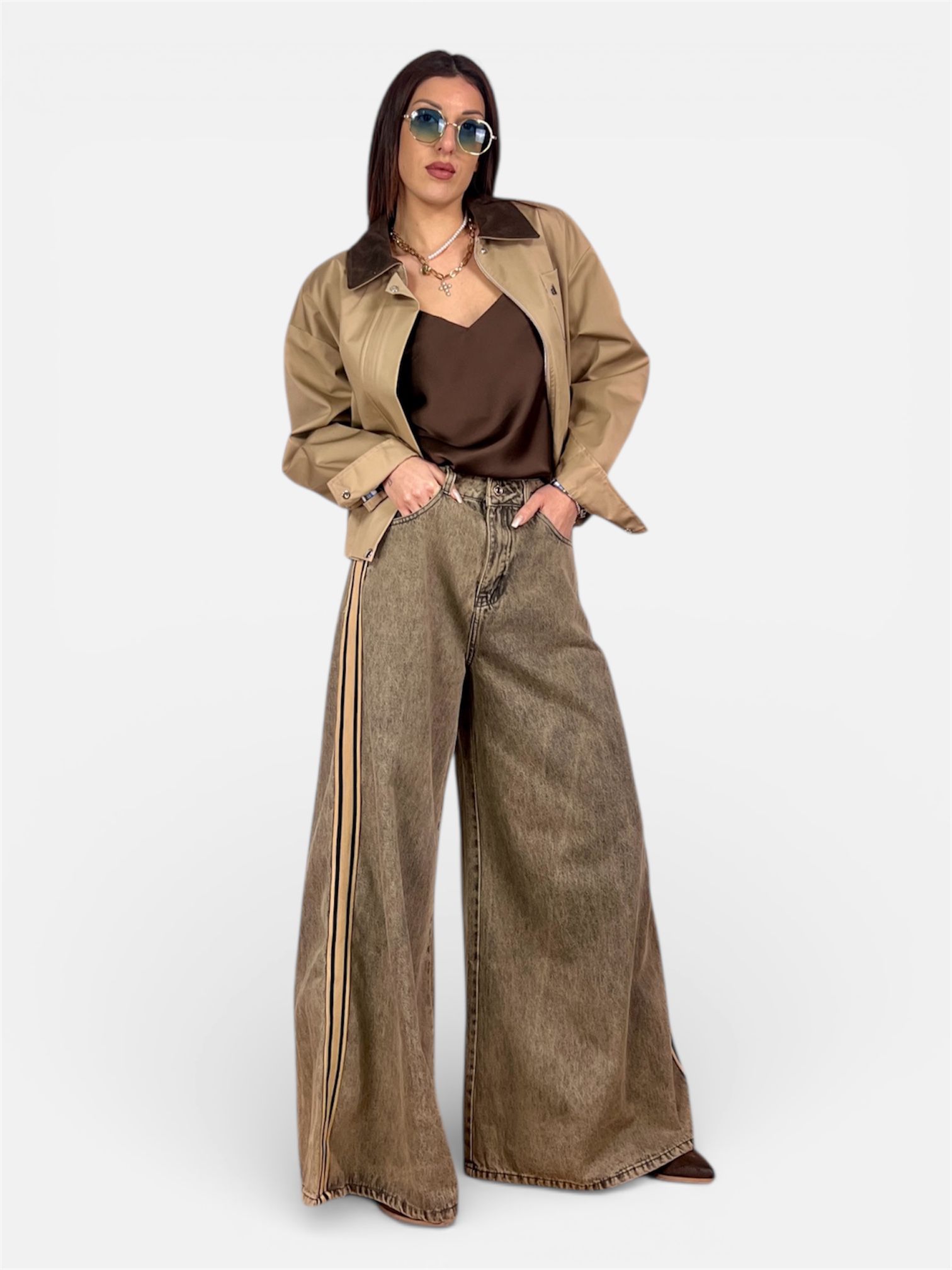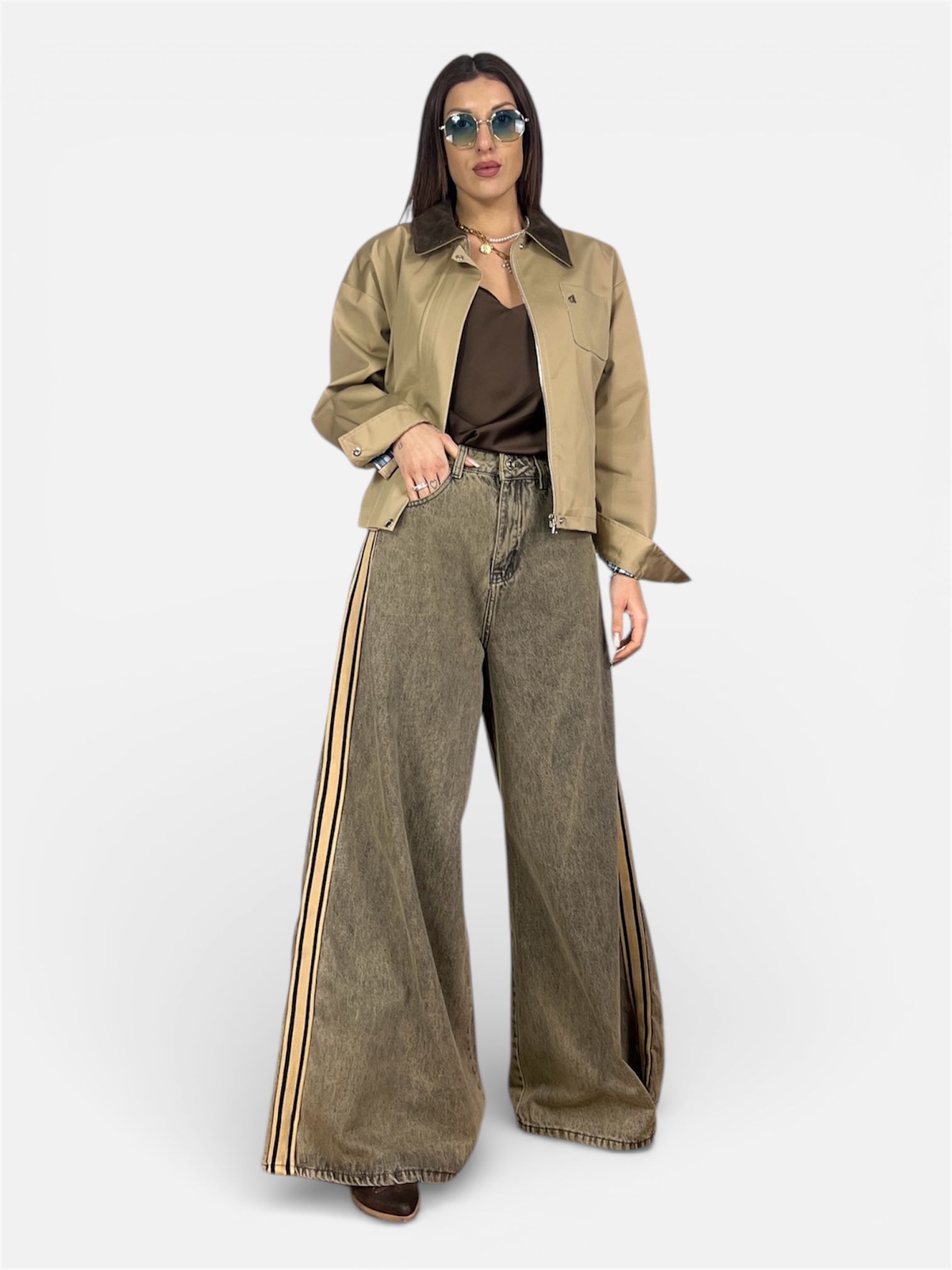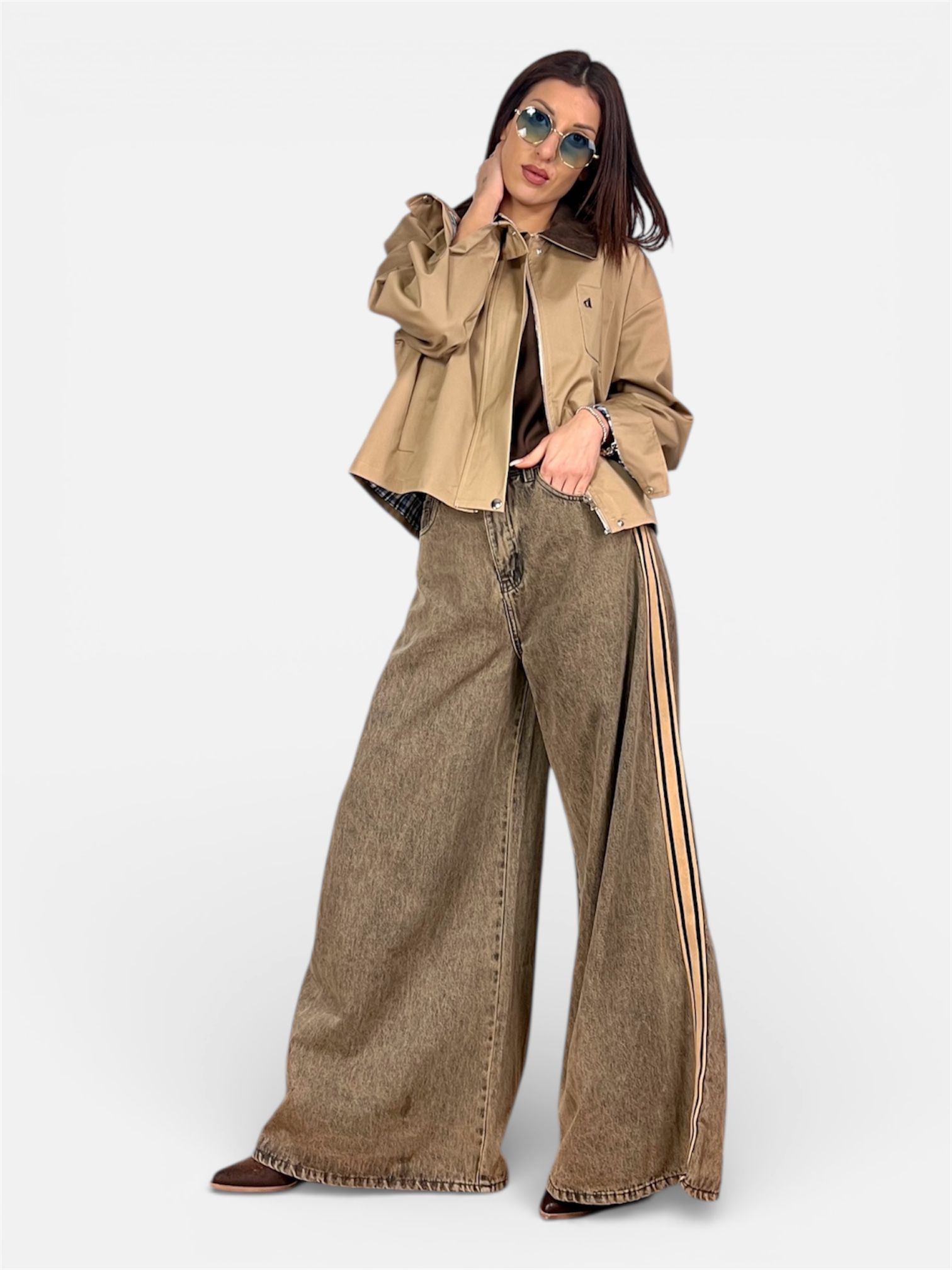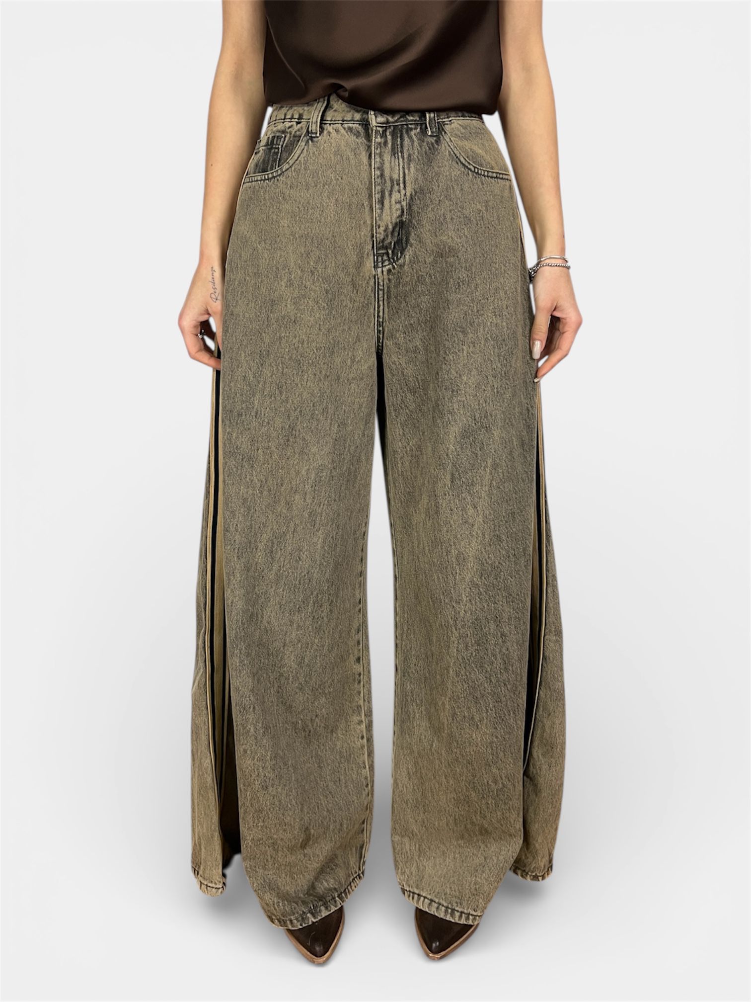 • modello jeans con banda laterale,palazzo ampio sulla gamba e sul fondo