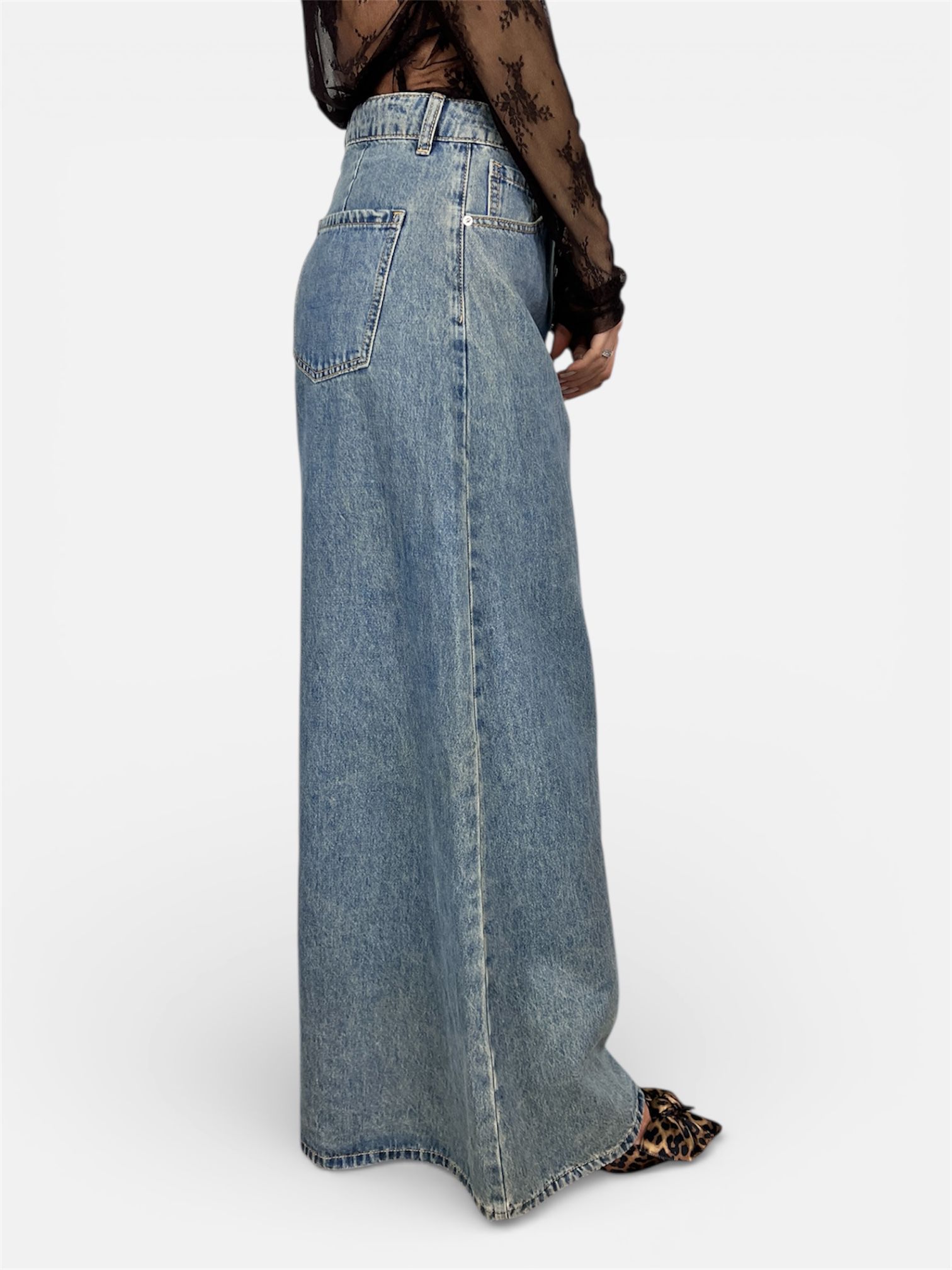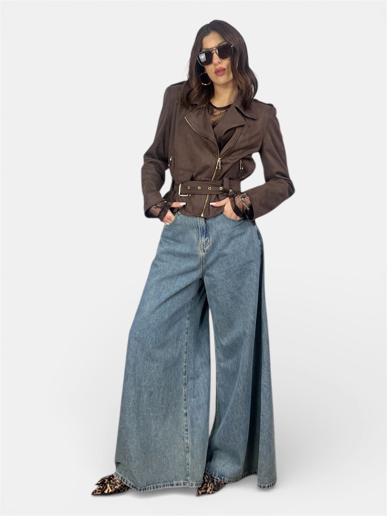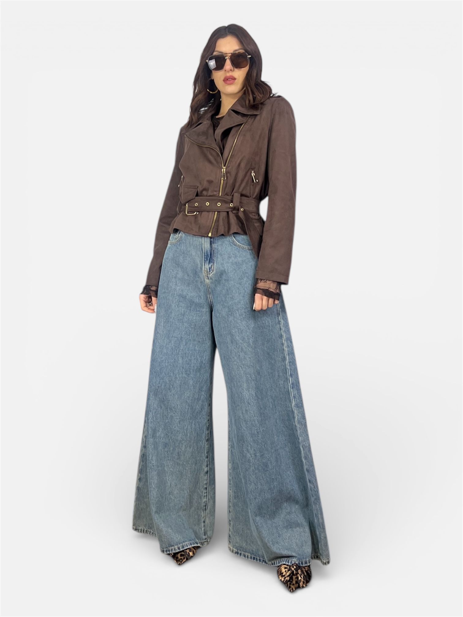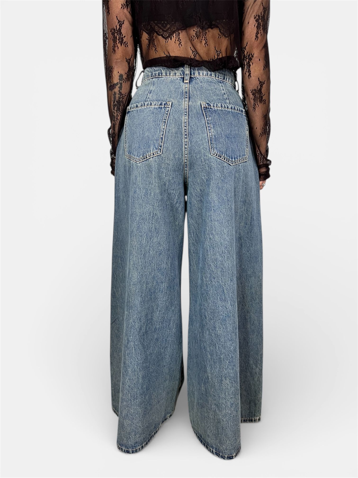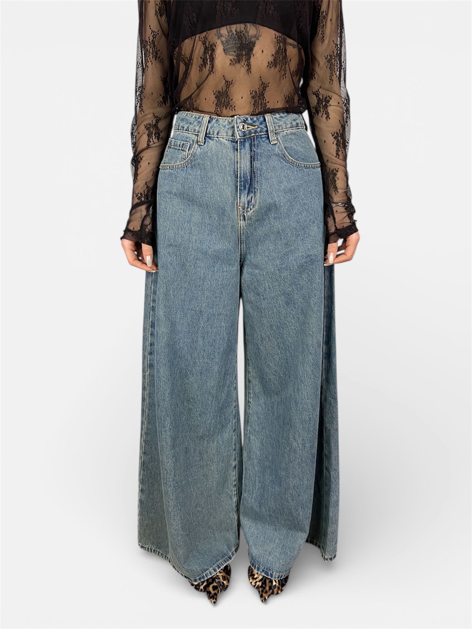 - modello jeans palazzo ampio,gamba larga vita alta,chiusura zip e bottone
