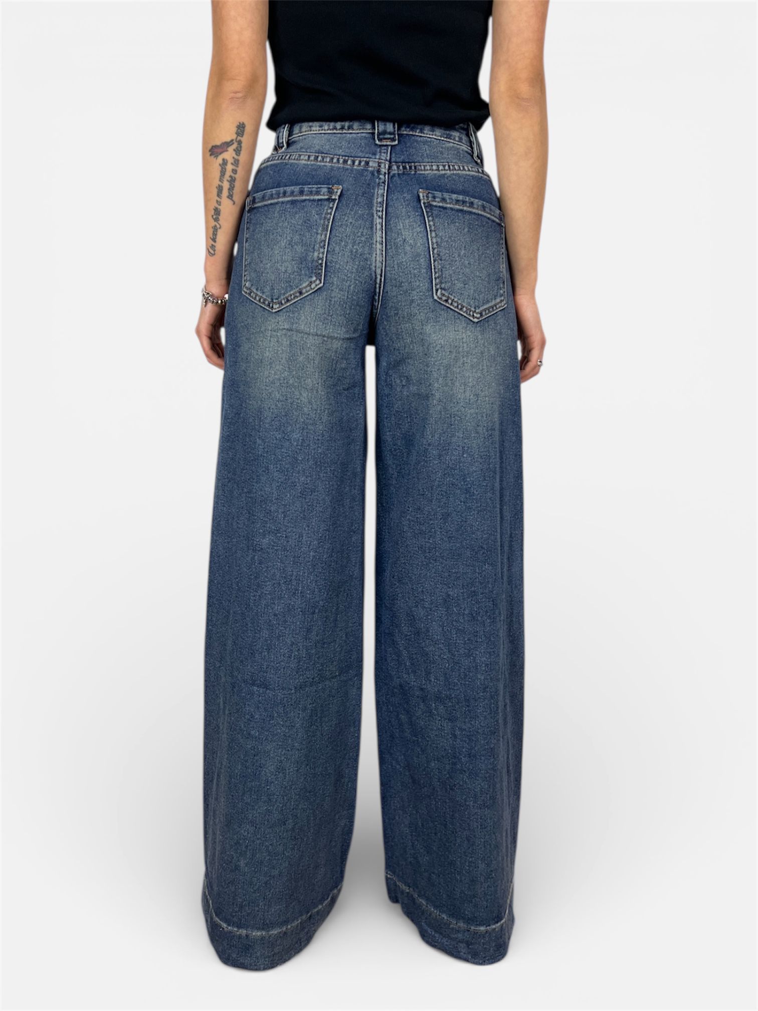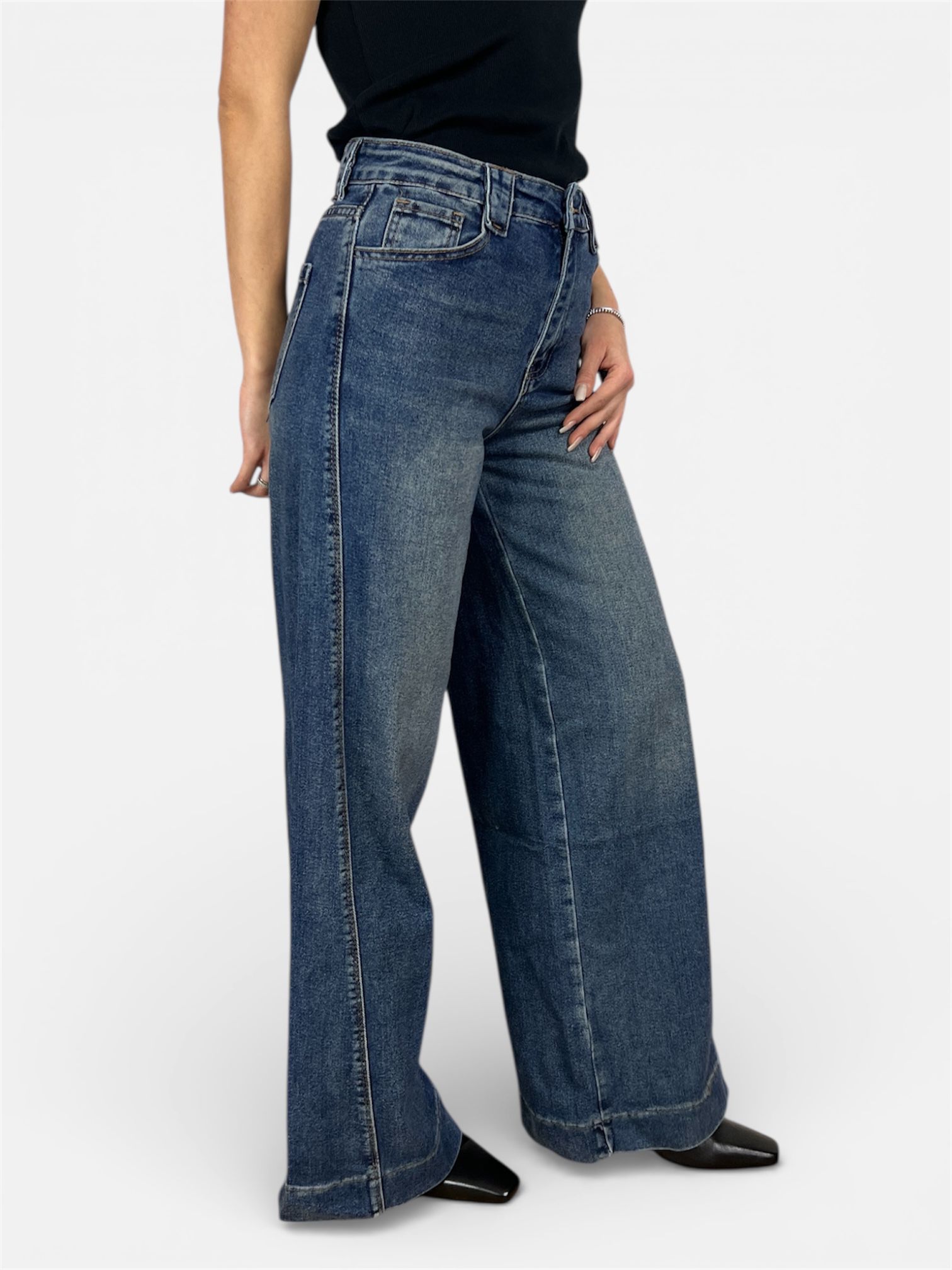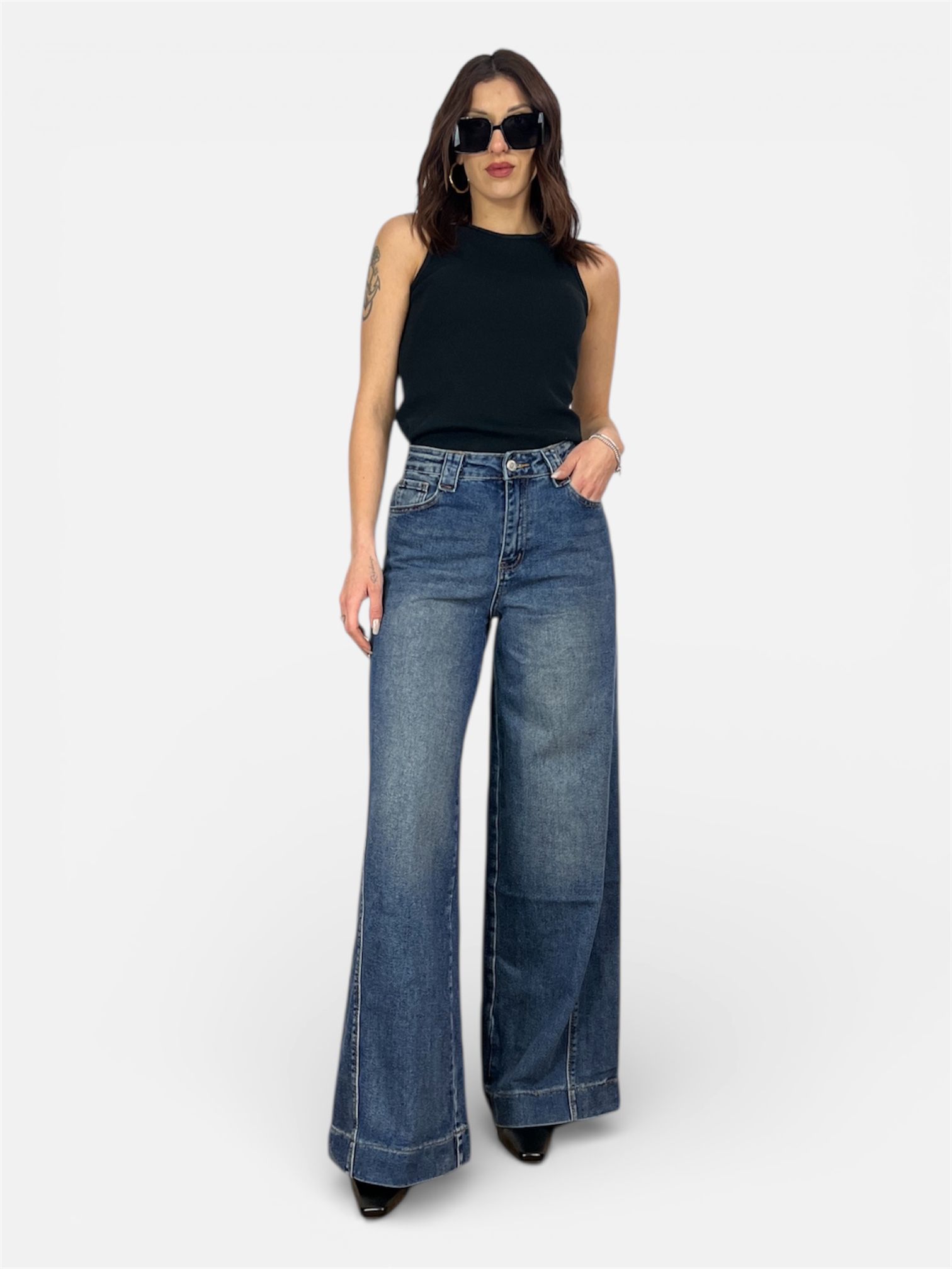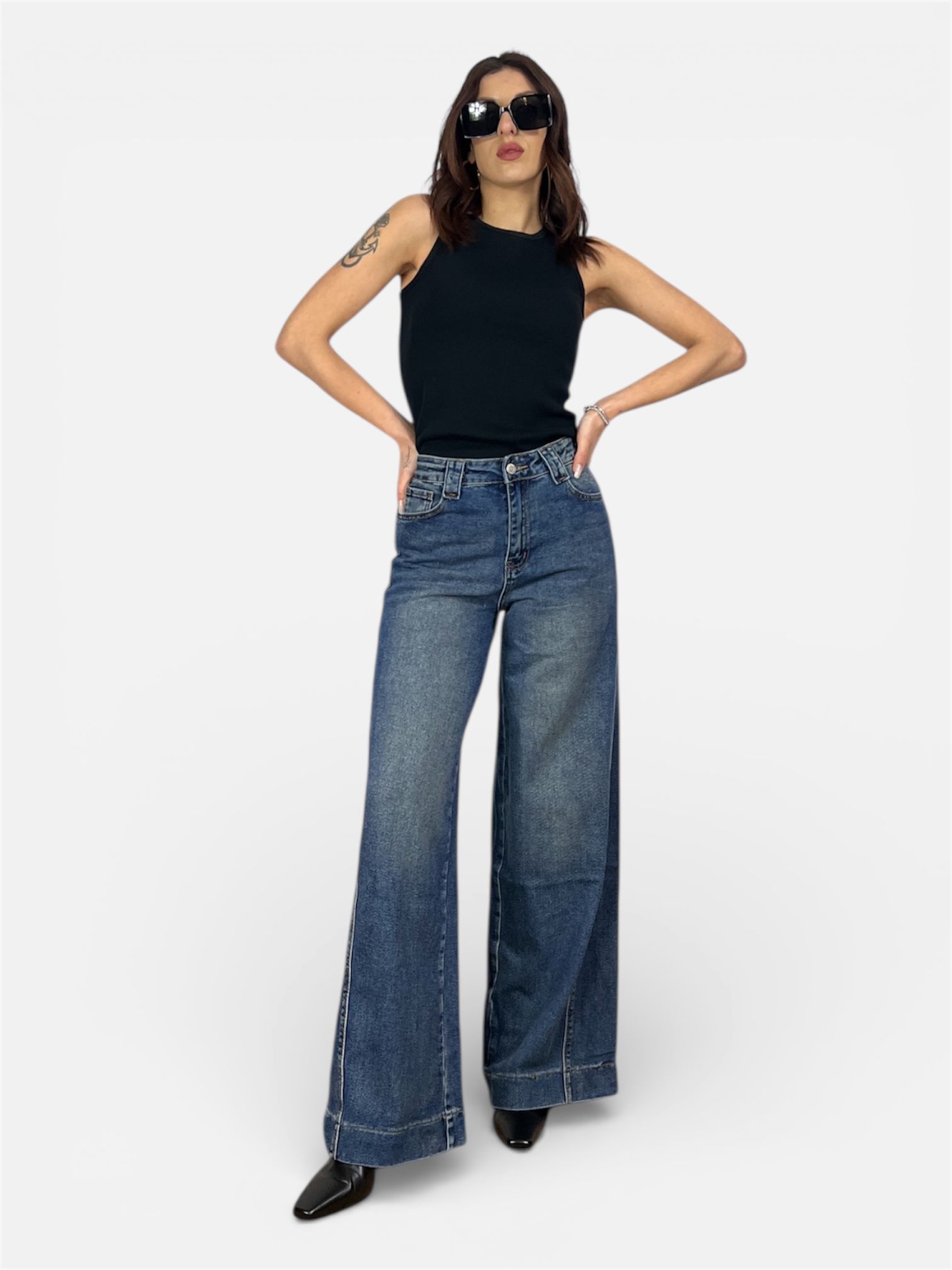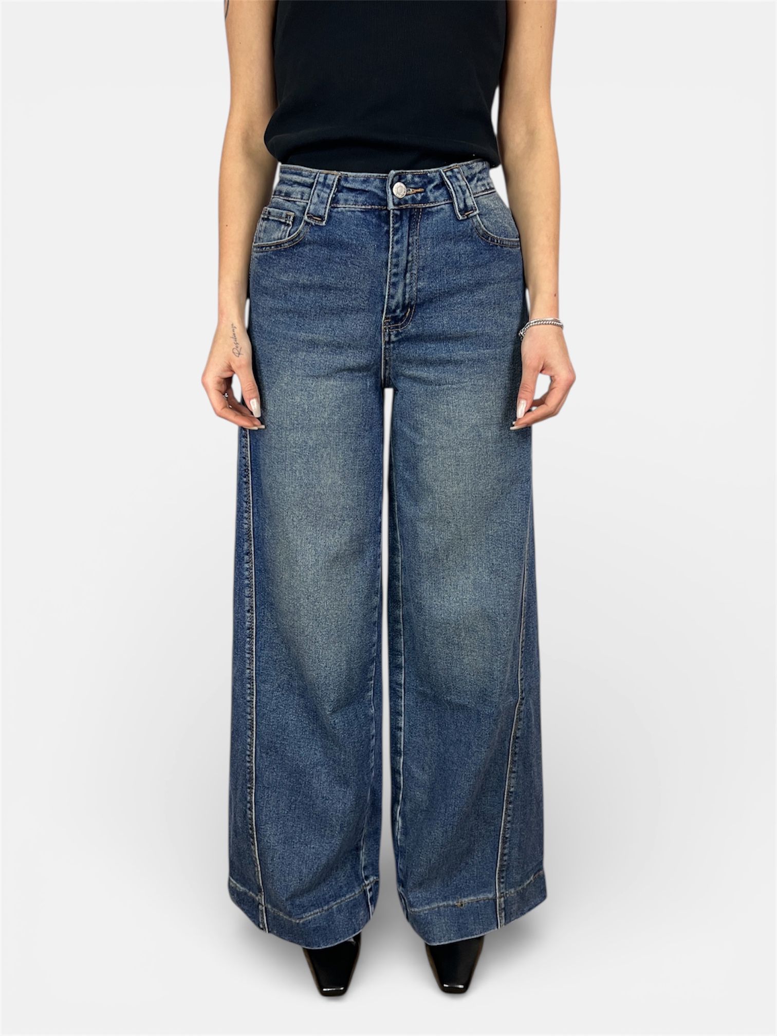 • modello jeans palazzo con dettaglio cucitura laterale e sul fondo,chiusura zip e bottone