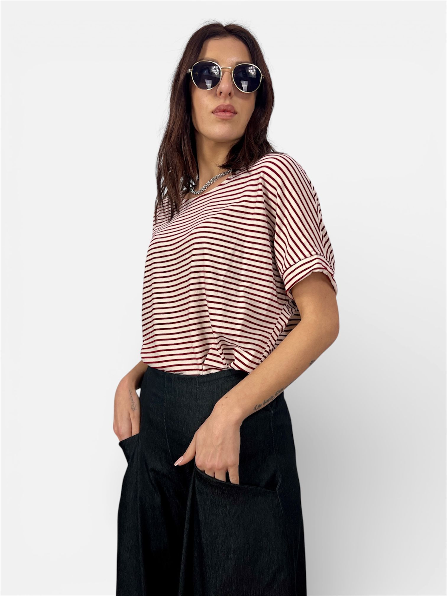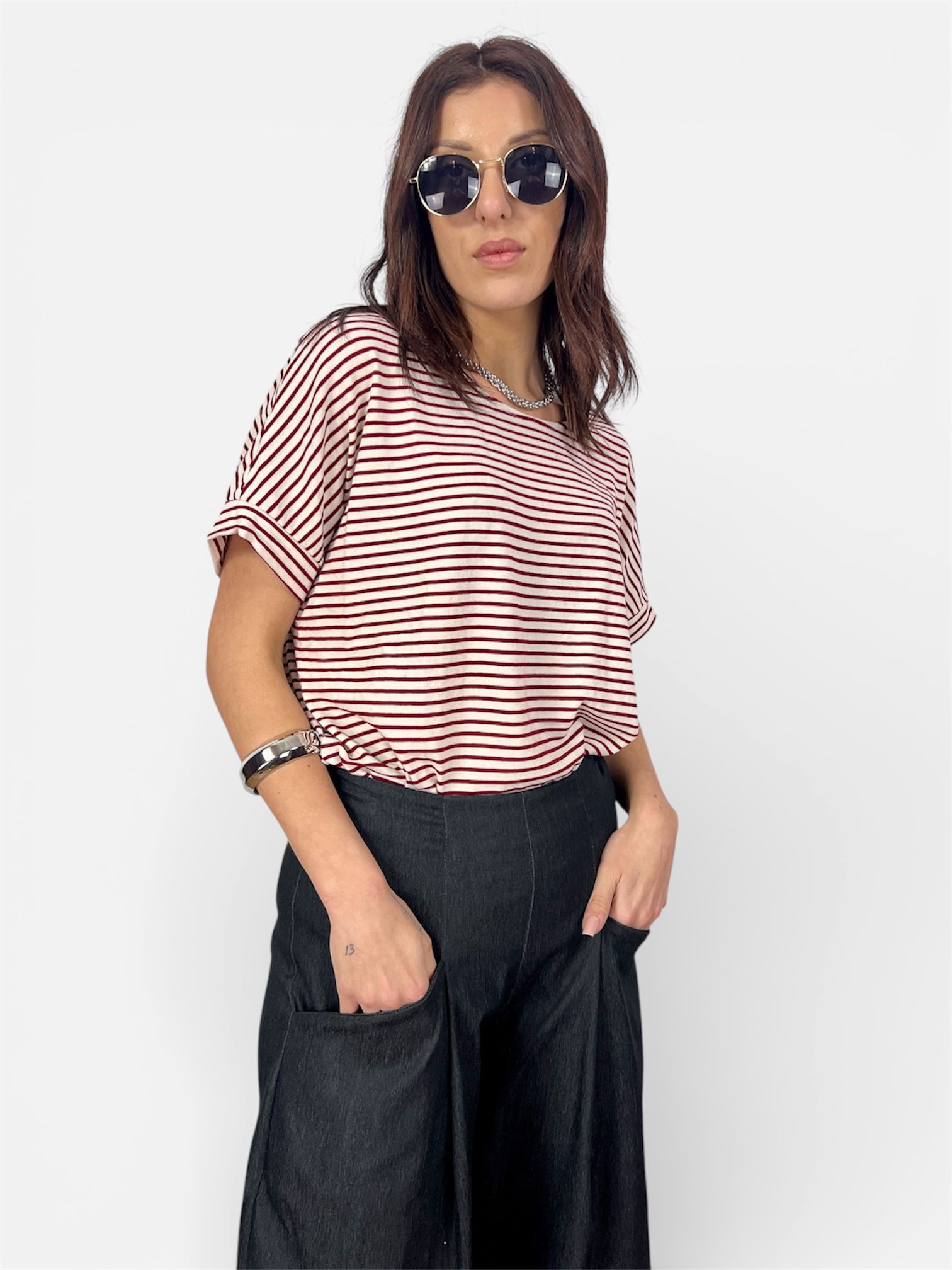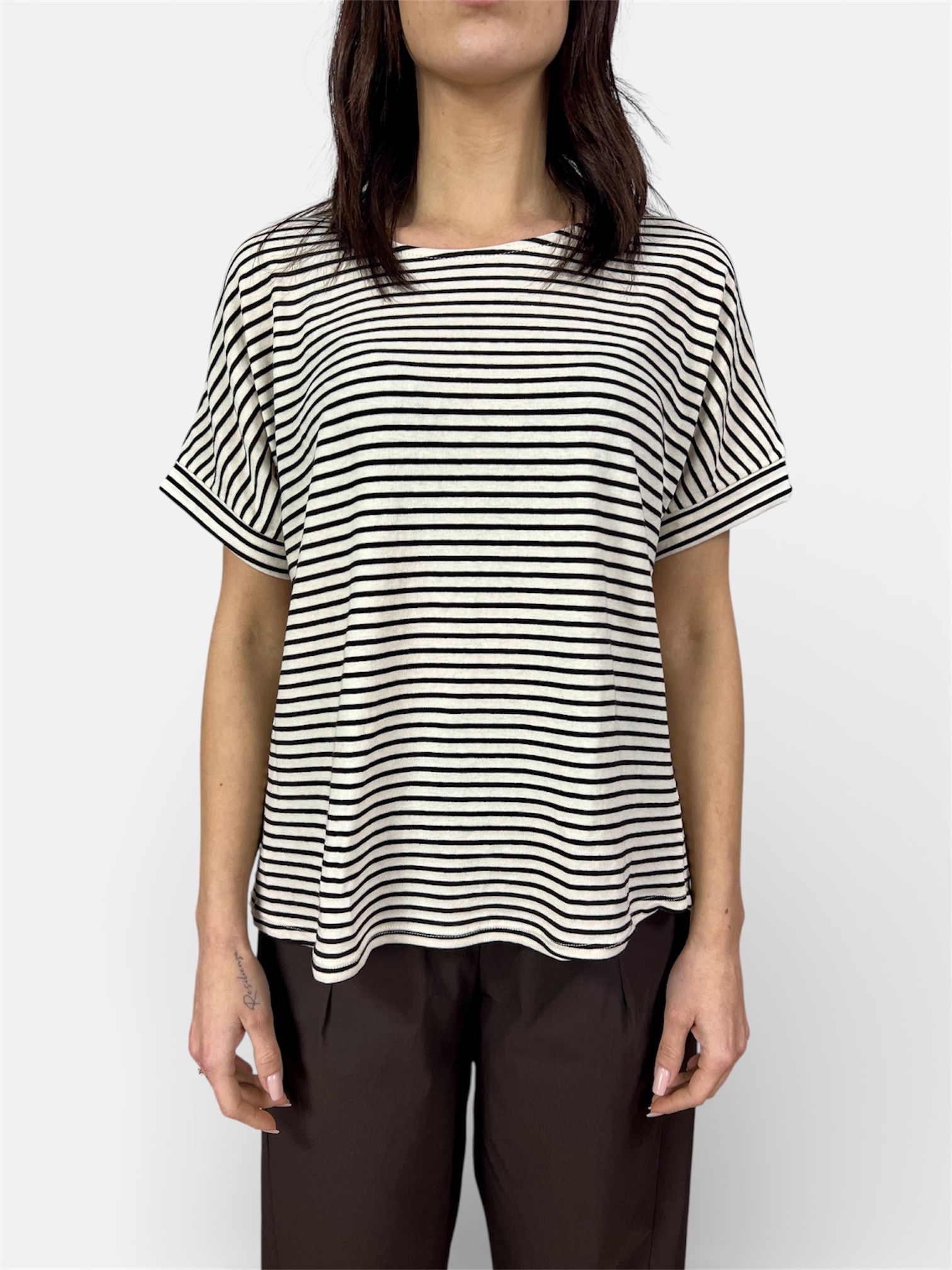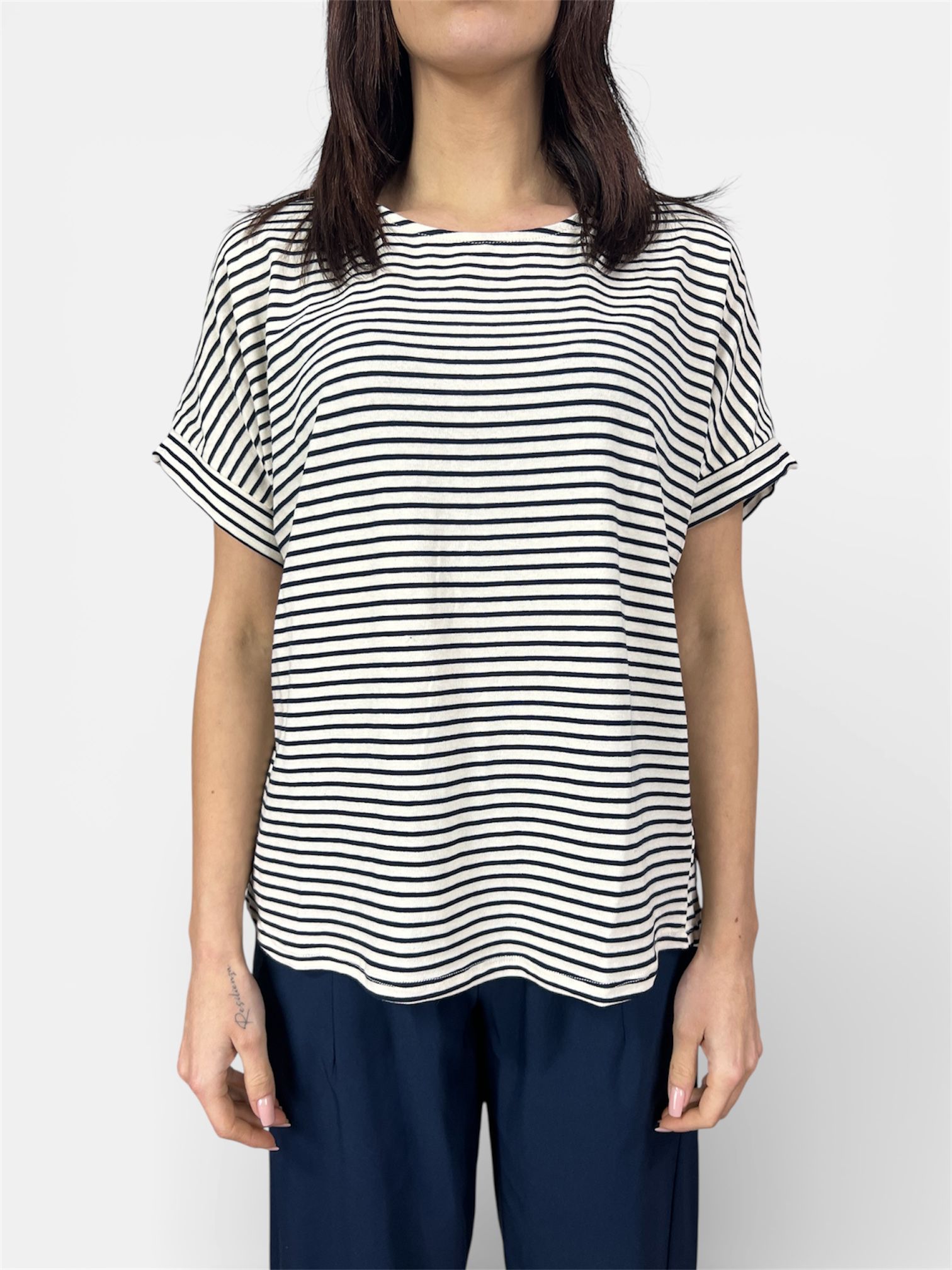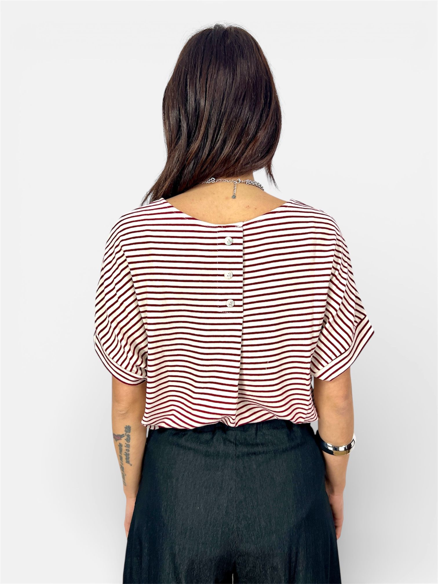 - maglia t-shirt rigata ampia con bottoni dietro e risvoltino sulla manica