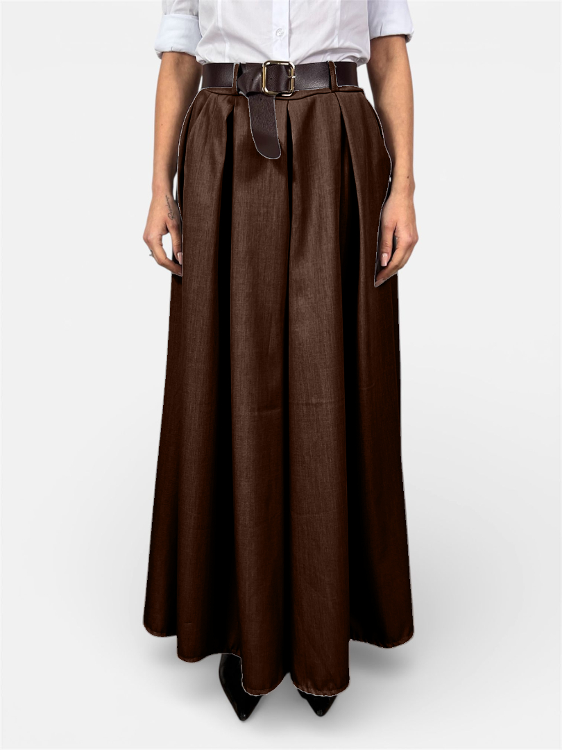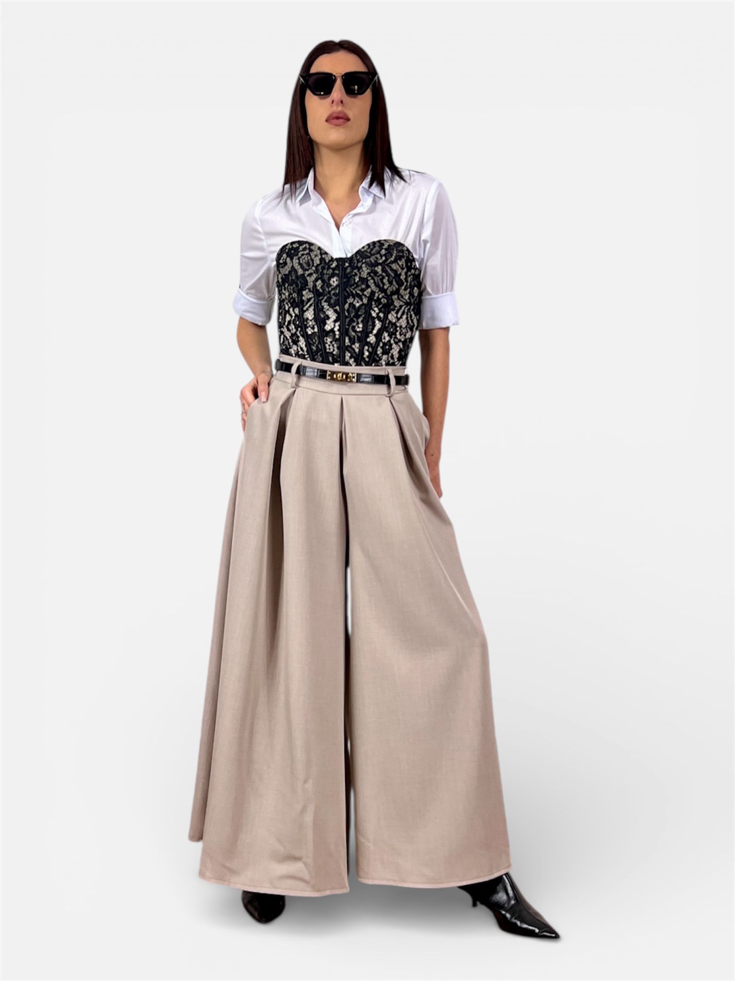- modello pantalone coulotte con pences vita alta con elastico posteriore cinta in simil pelle marrone