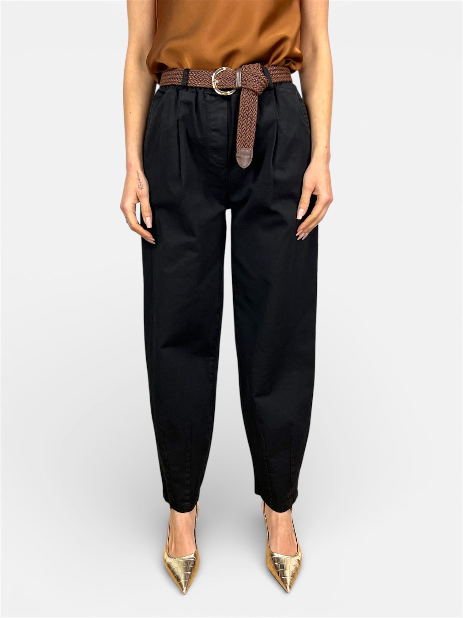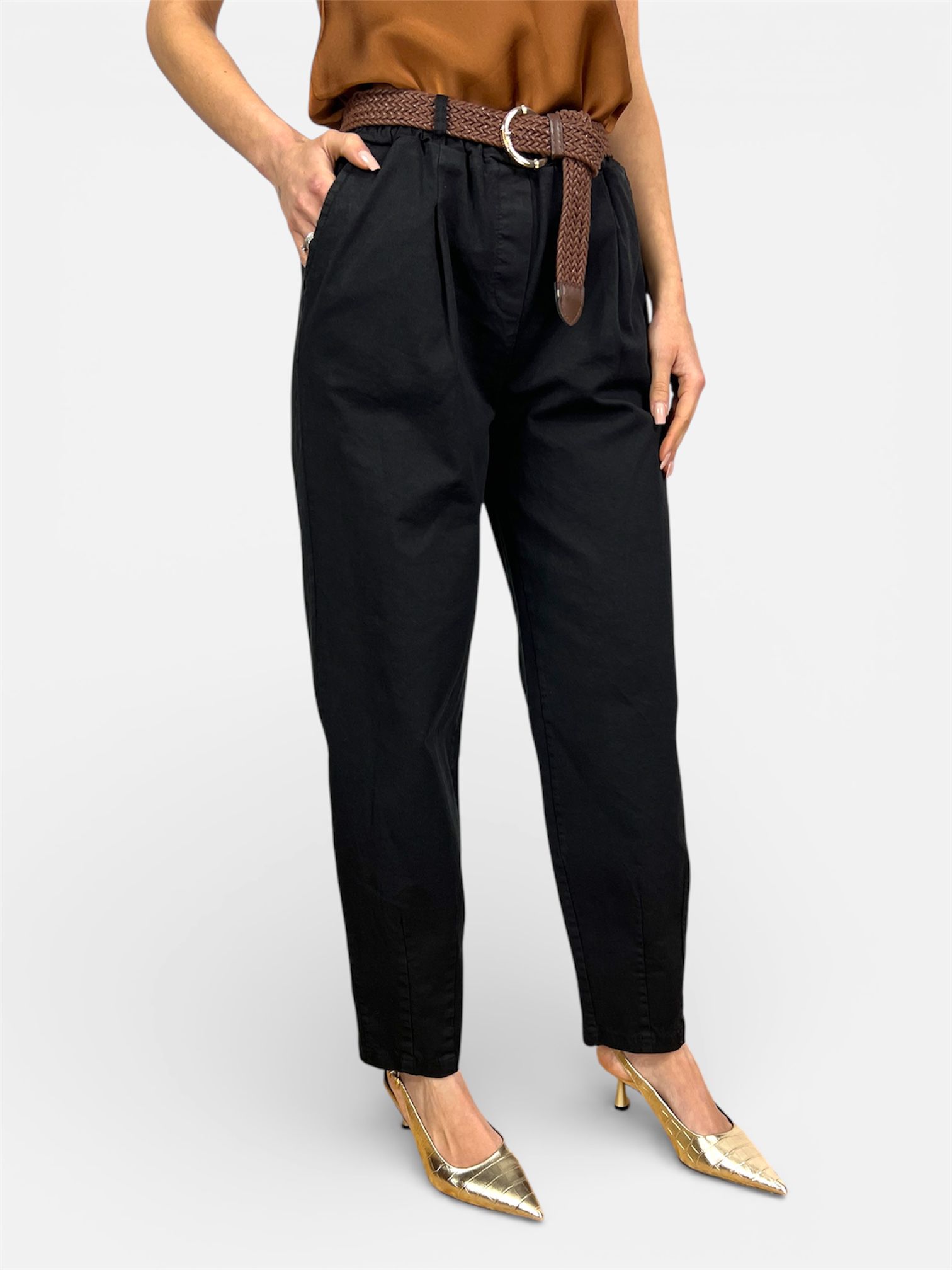 pantalone carrot cotone nero,tabacco by MYRA