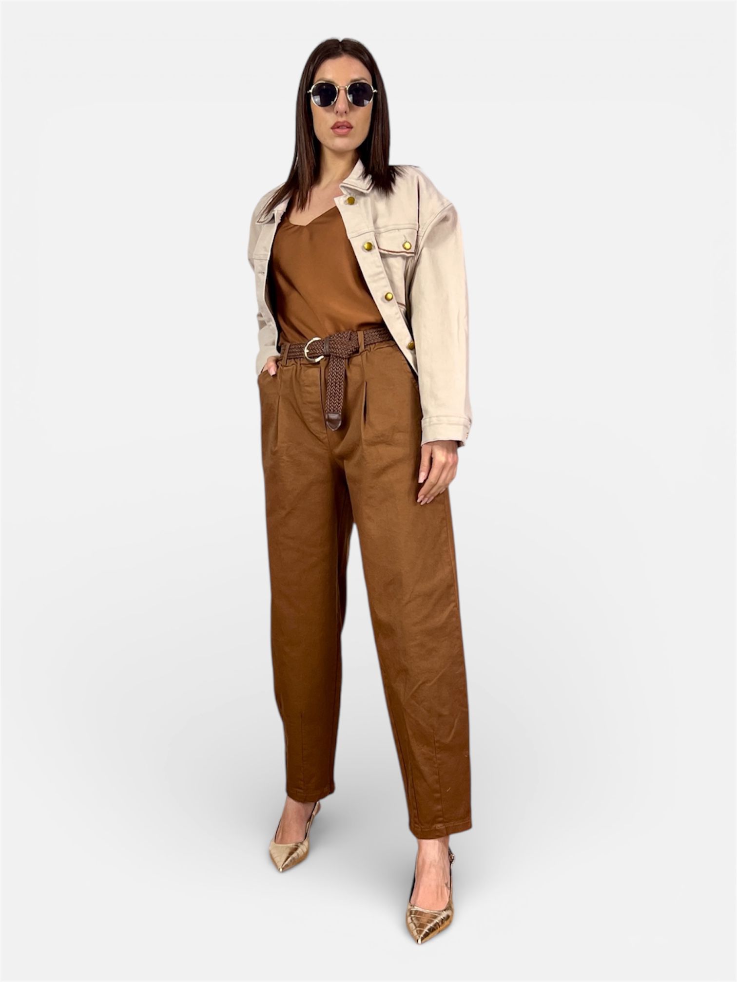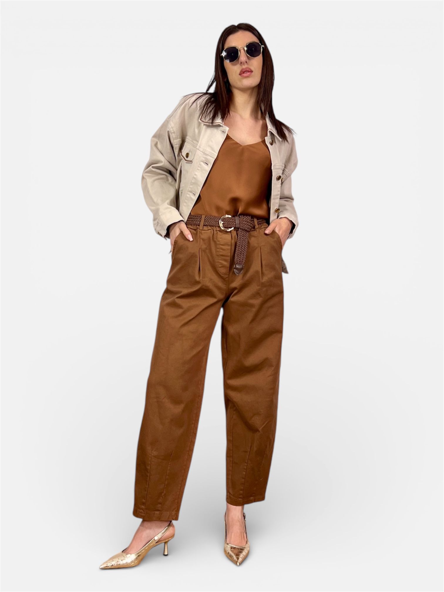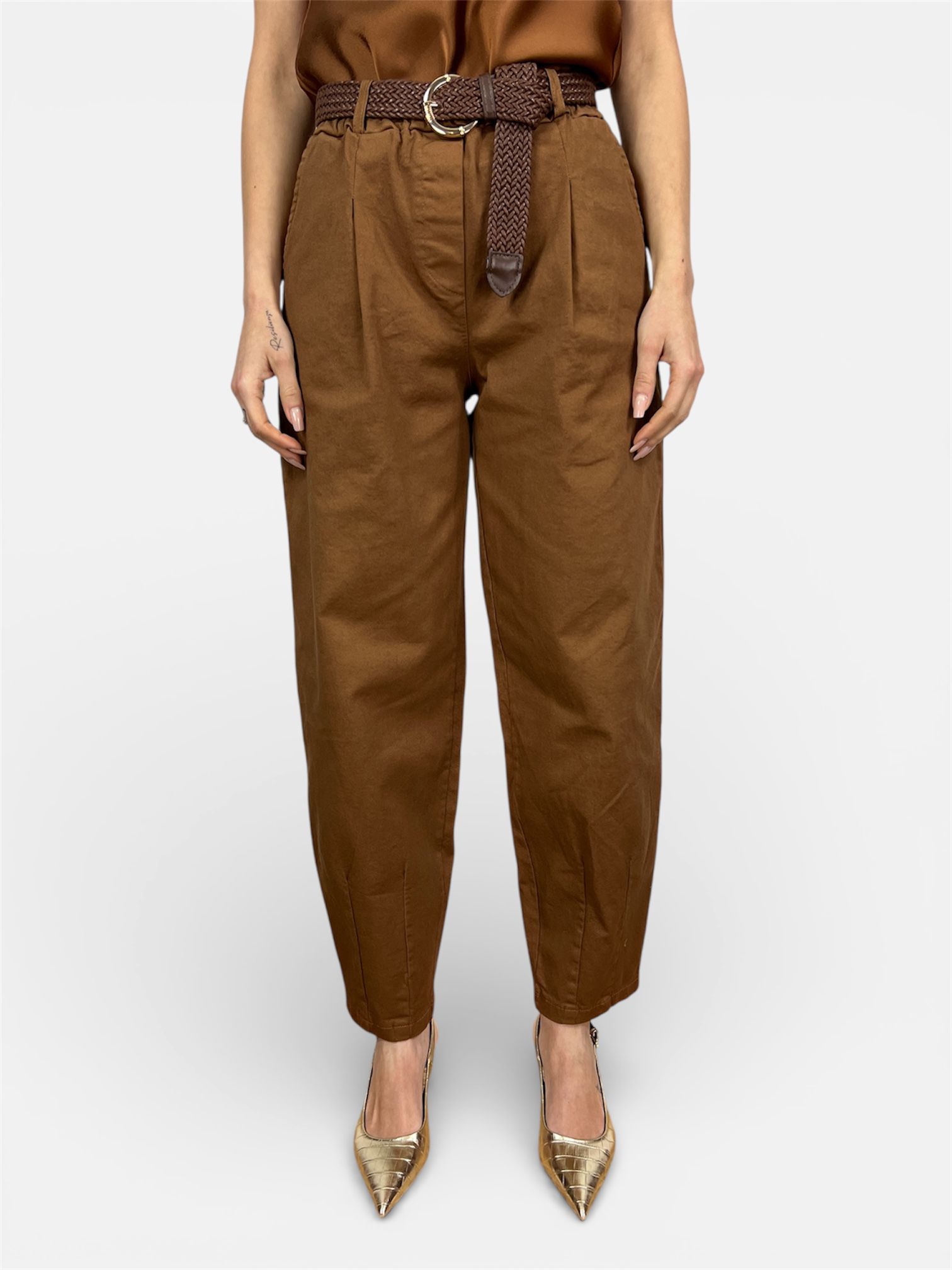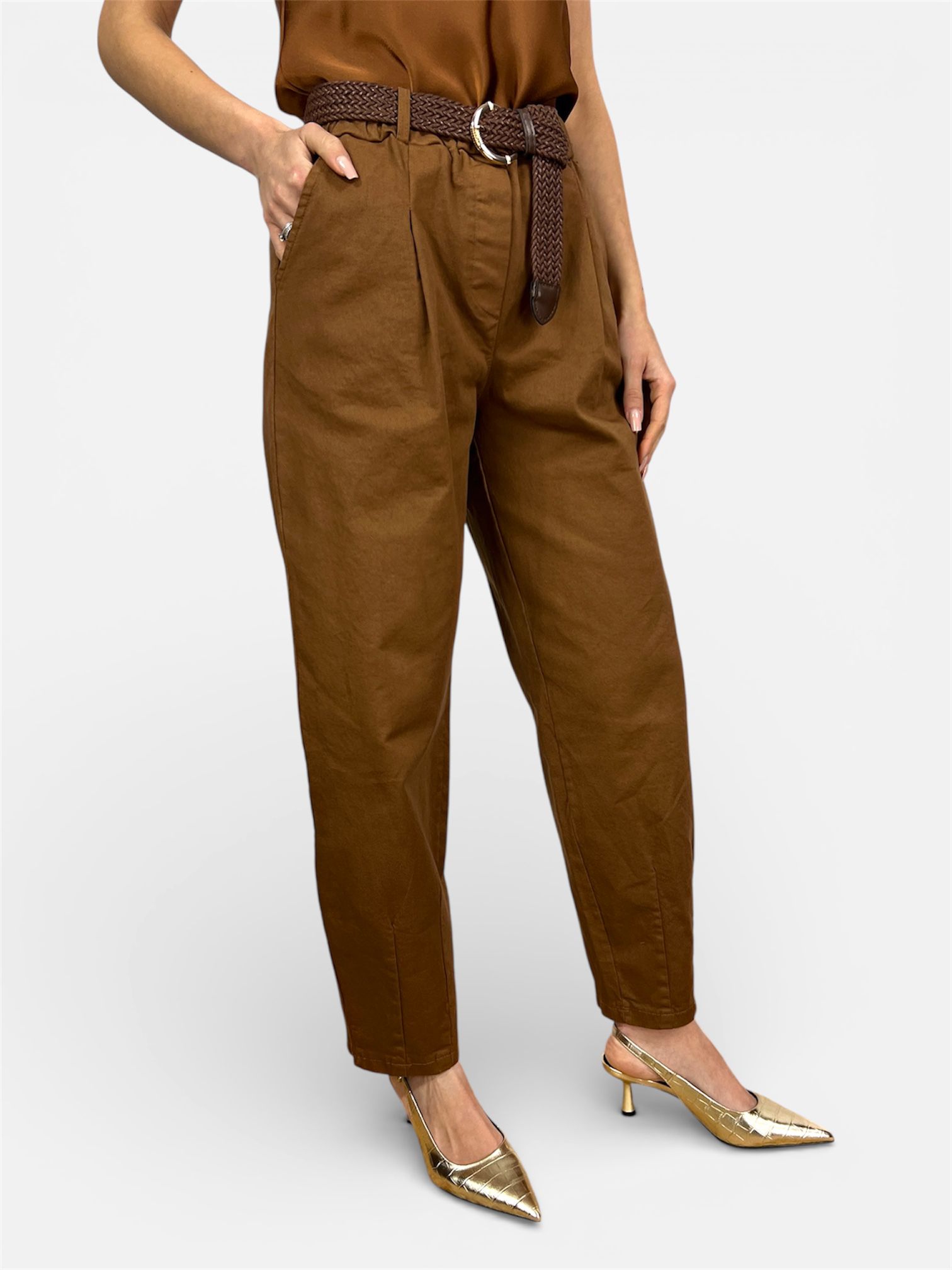 - Modello: Pantalone cotone carrot vita alta,pences frontali,elastico in vita tasche a filo,cinta removibile