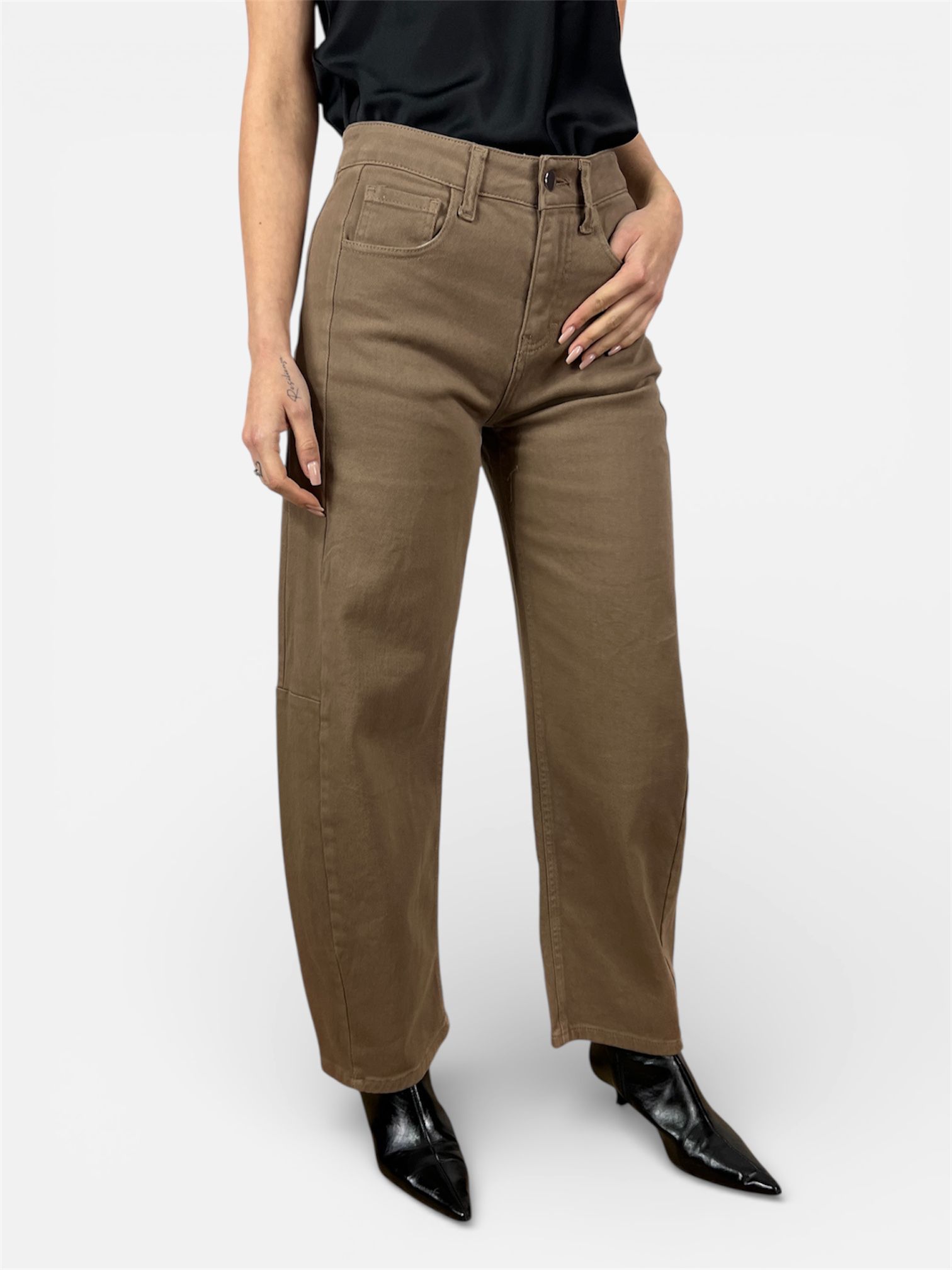 - modello pantalone balloon in denim,elasticizzato chiusura zip e bottone