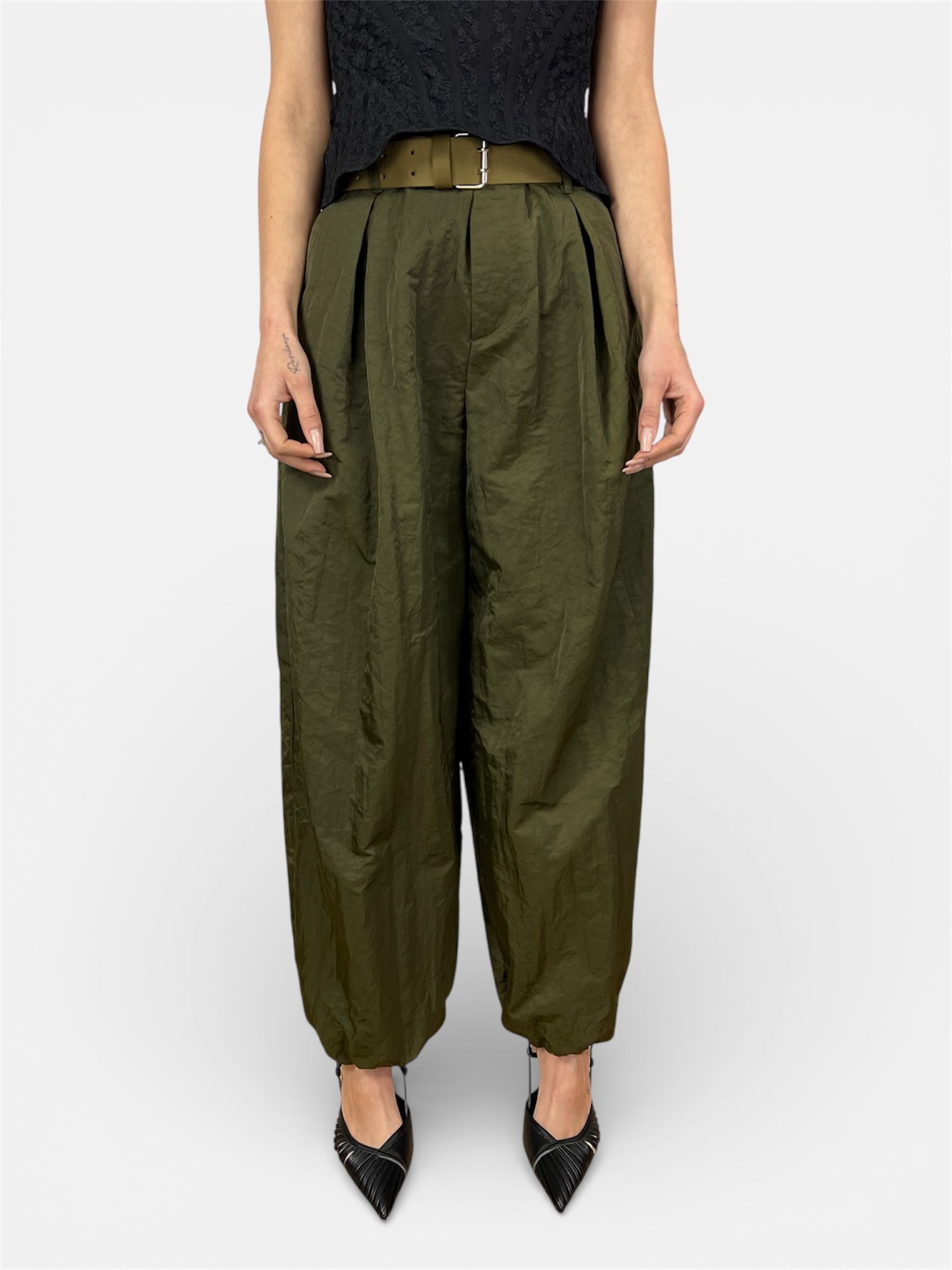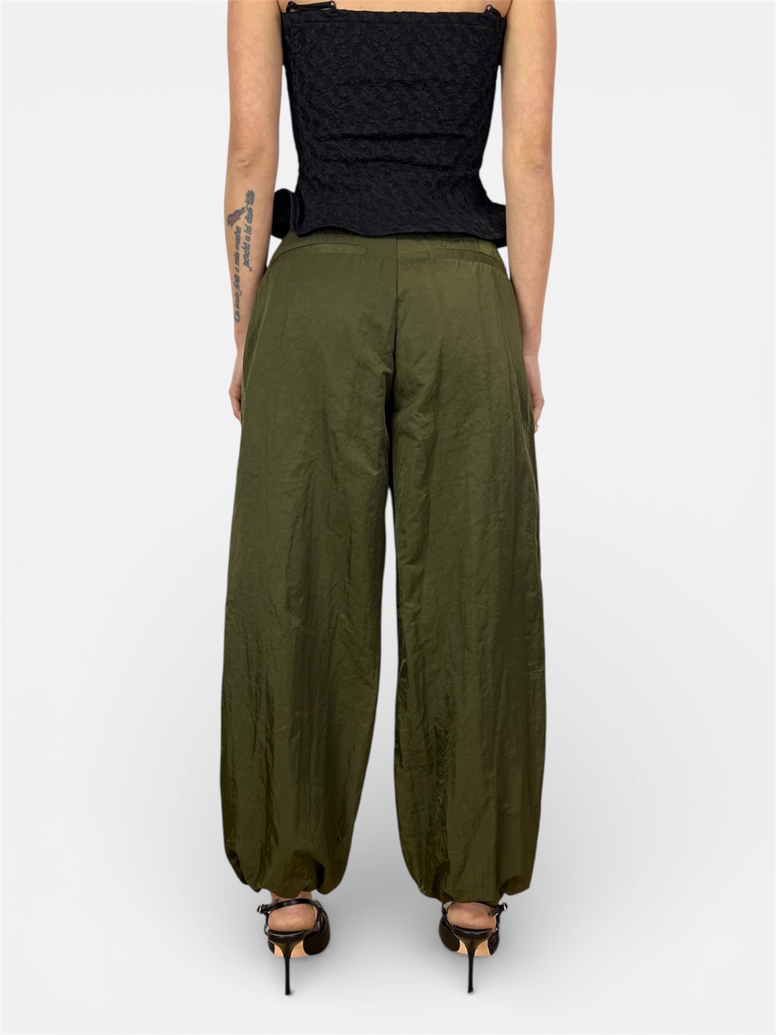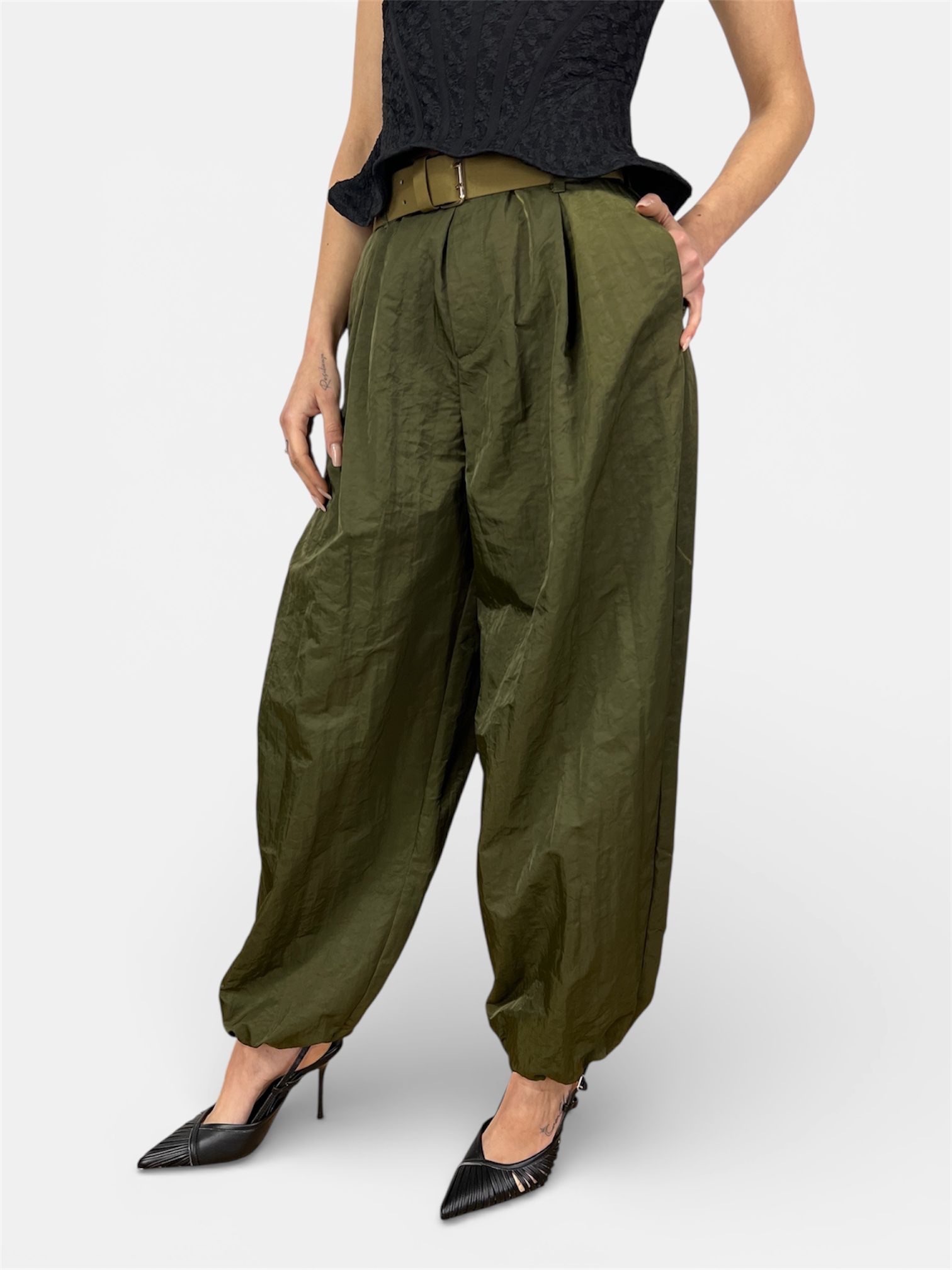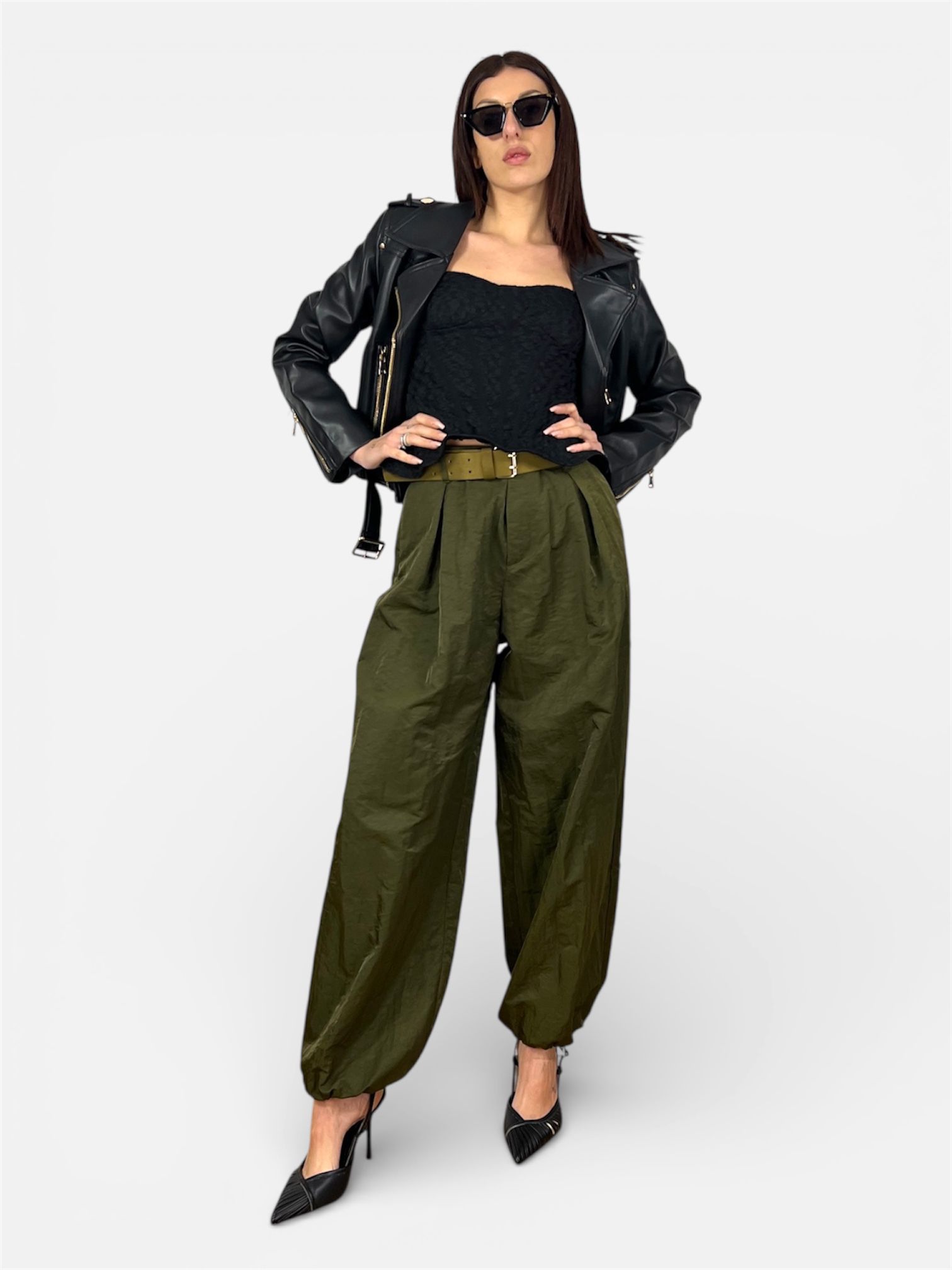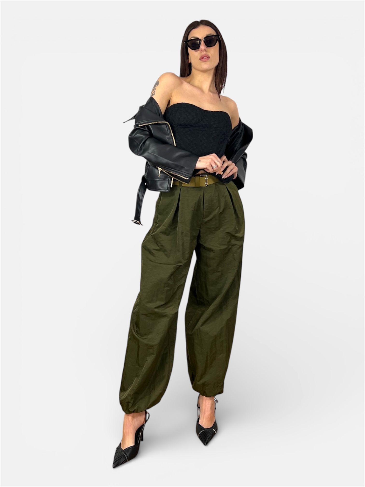- Dettagli: Vita alta, pinces profonde, tasche laterali a scomparsa, elastico alle caviglie.