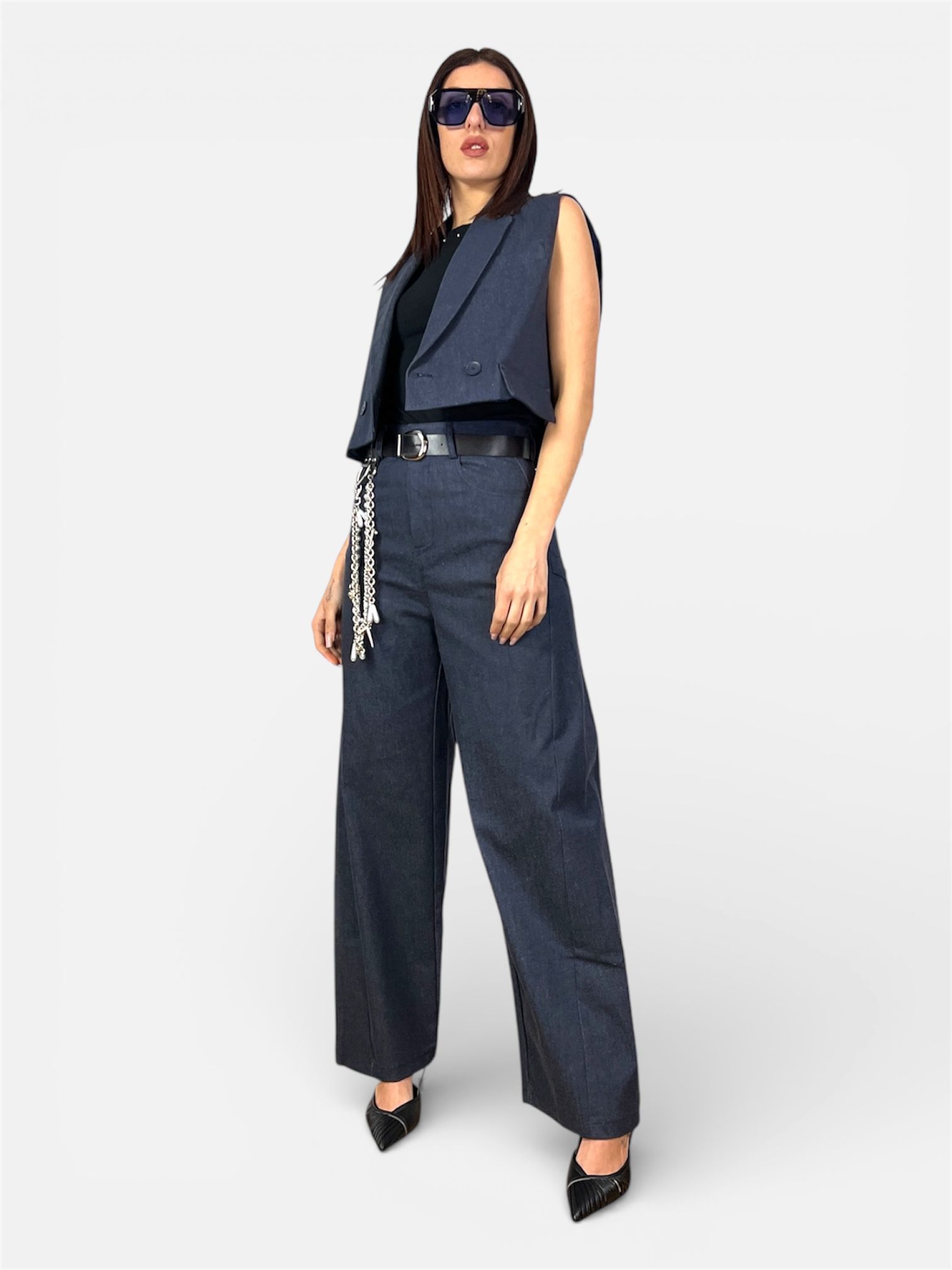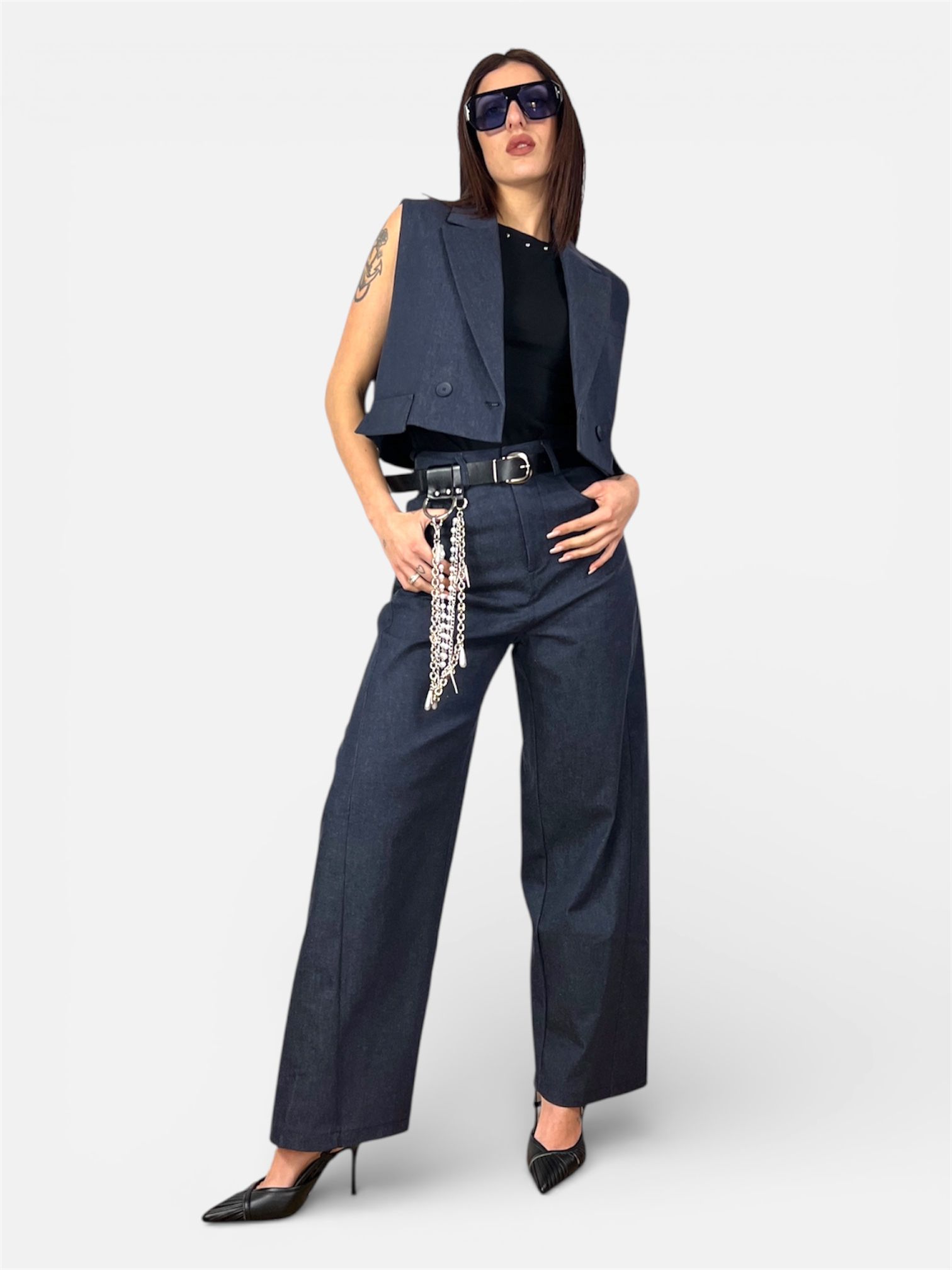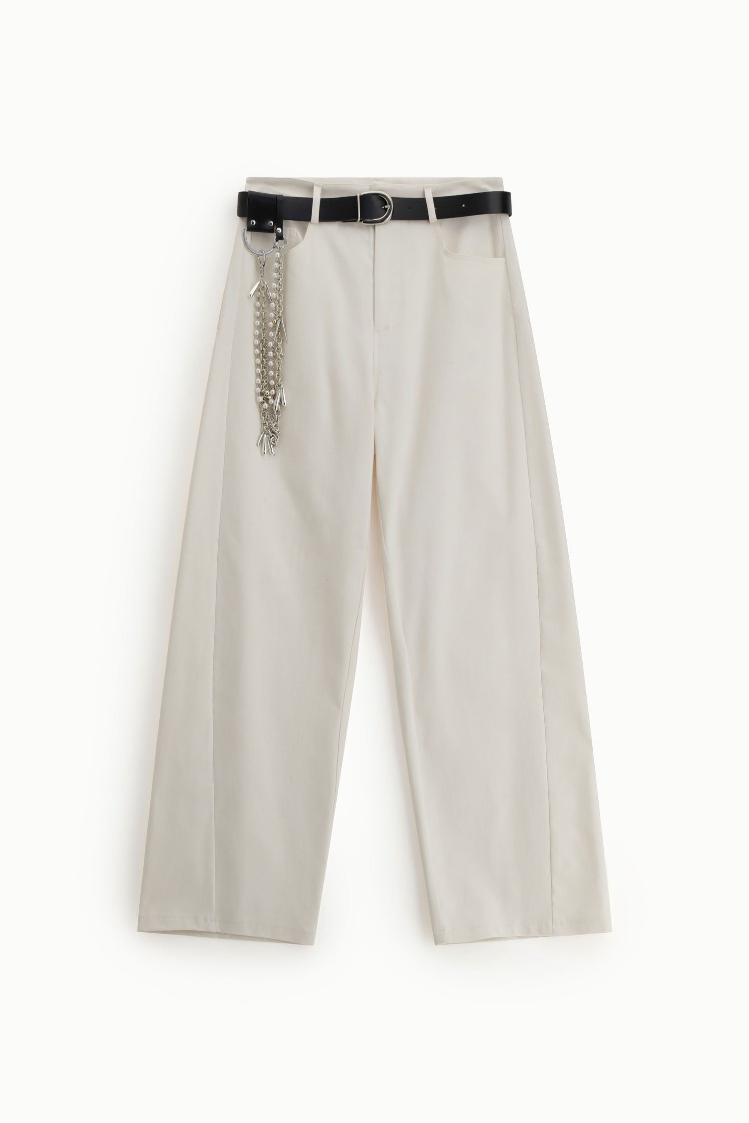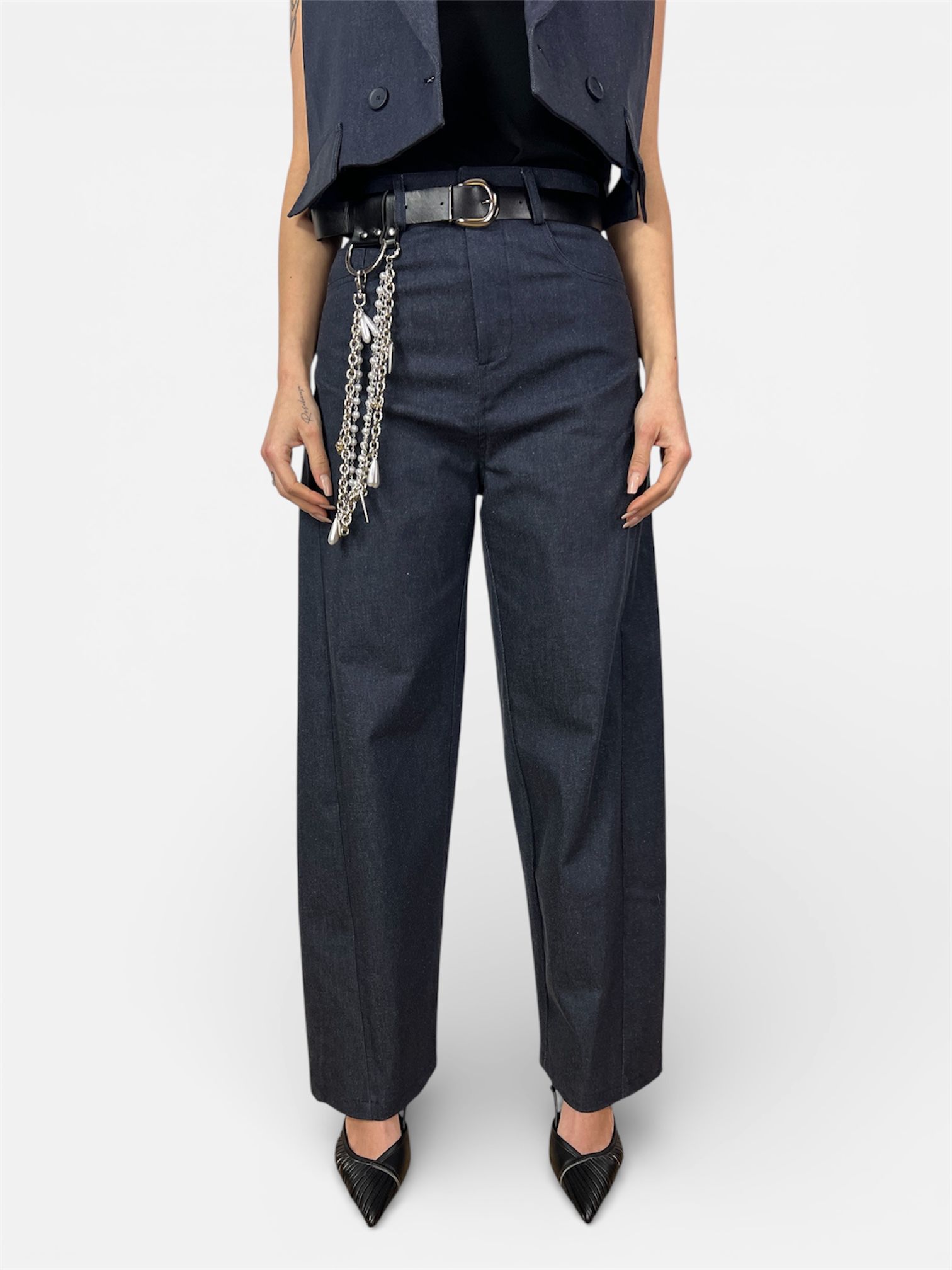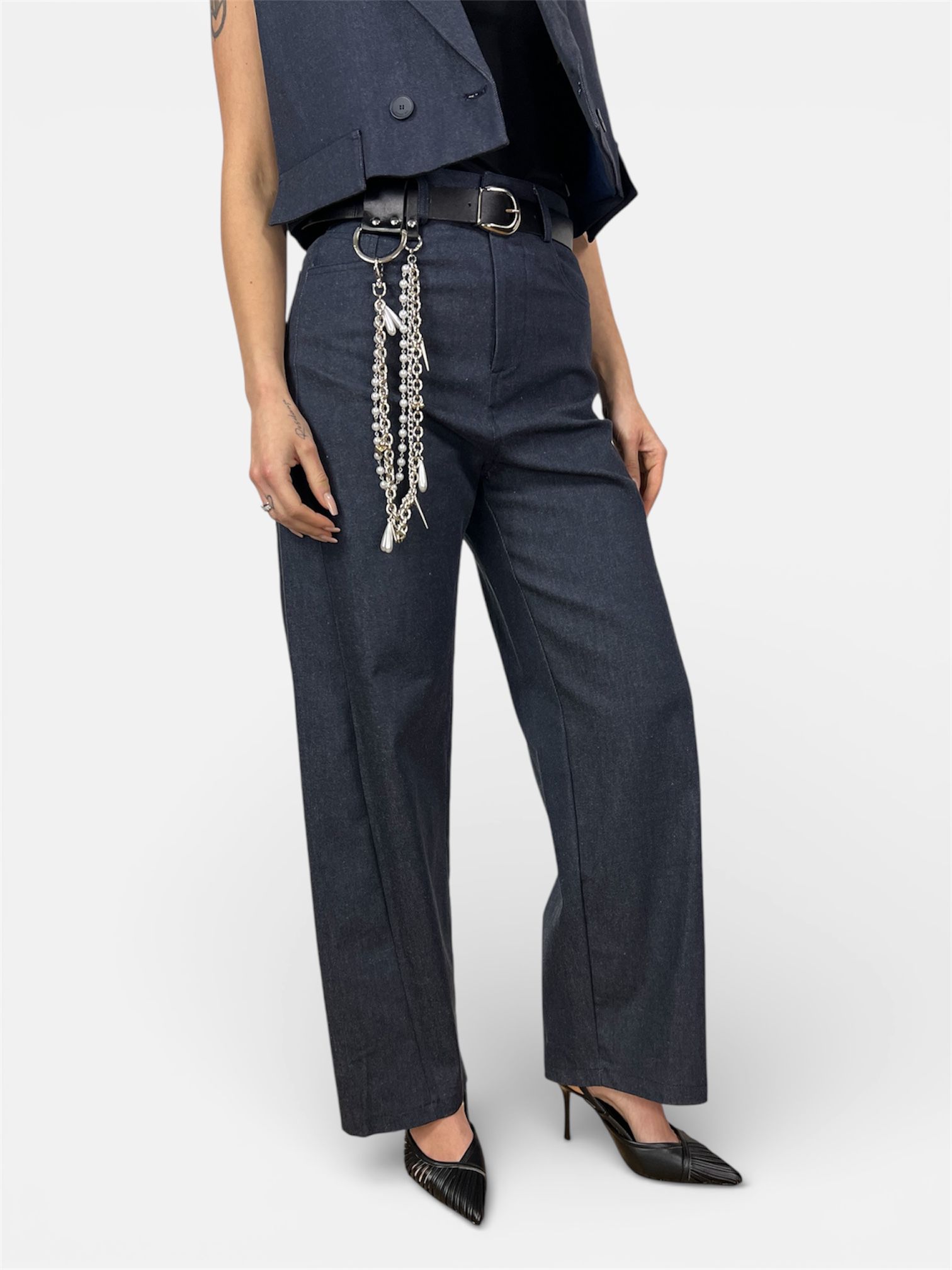 - Kit Accessori Incluso: Il pantalone è venduto completo di una cintura in ecopelle nera con fibbia metallica e di un set di catene multifilo rimovibili con ciondoli, ideali per personalizzare il tuo stile.