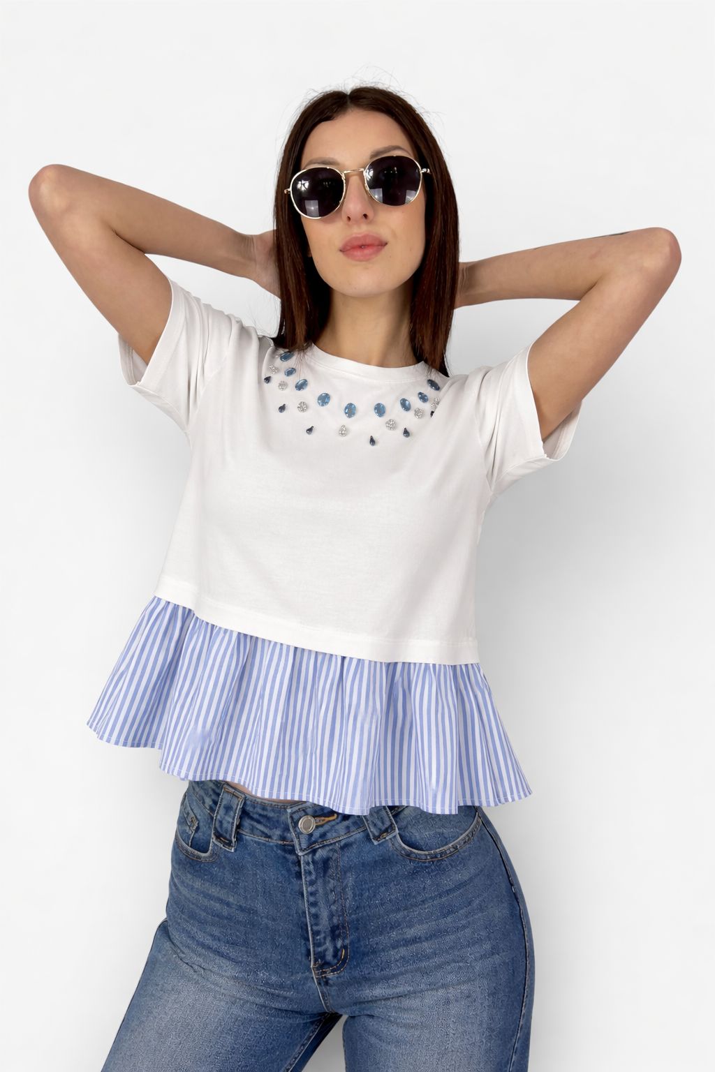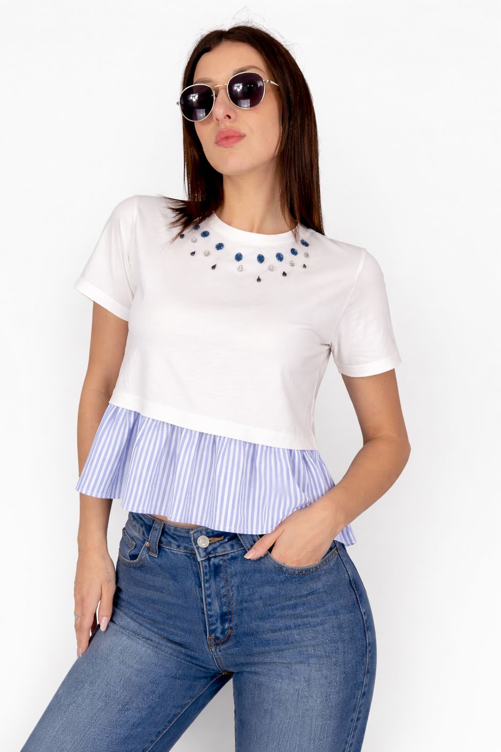 Rendi speciale l’outfit quotidiano con questa t-shirt dal design unico “due-in-uno”. Realizzata in morbido cotone 100%, questa maglia offre una silhouette contemporanea caratterizzata da una costruzione a strati: la parte superiore in cotone bianco latte incontra una balza inferiore in popeline a righe azzurre e bianche, creando un effetto sbarazzino e chic.
