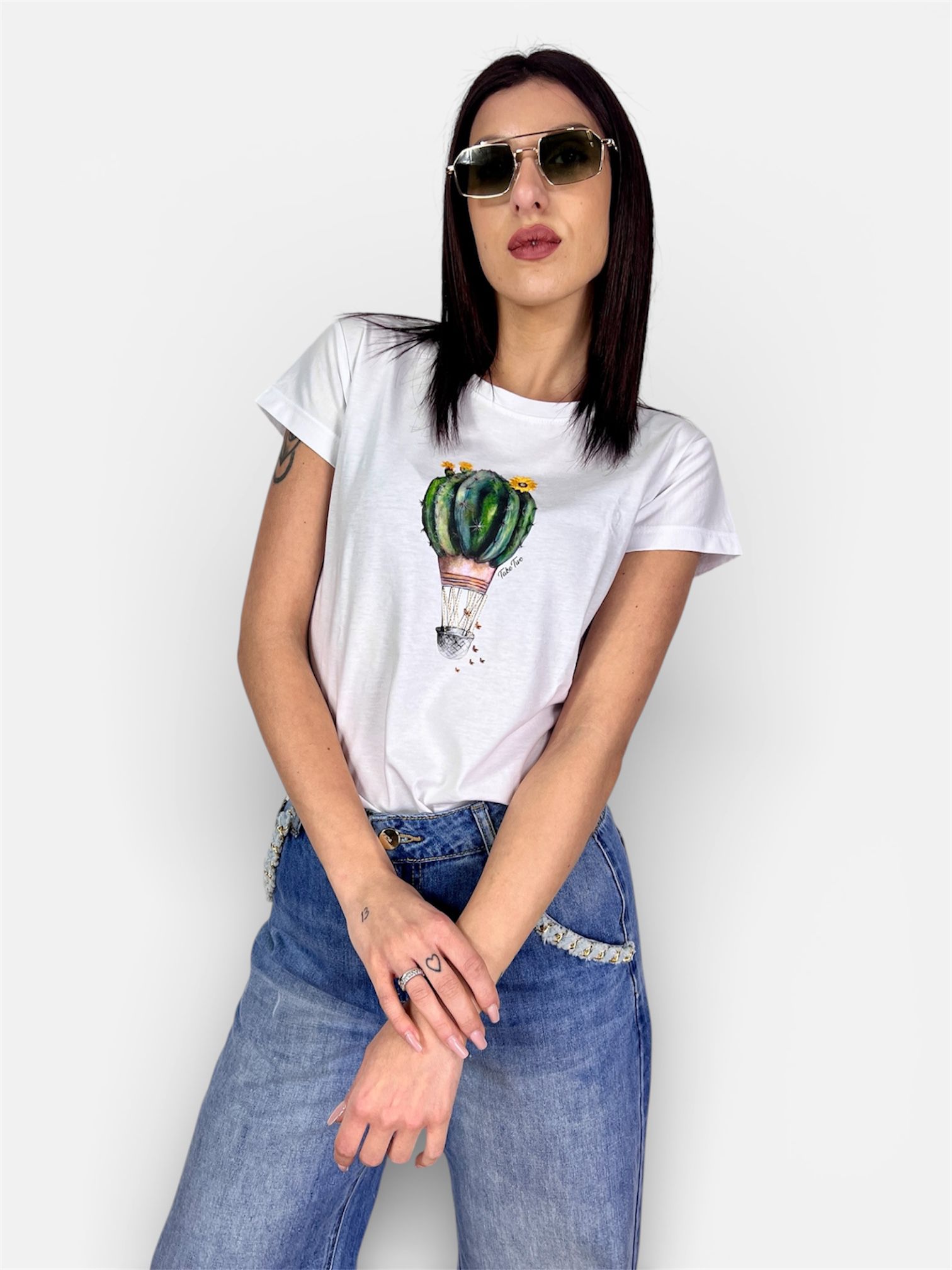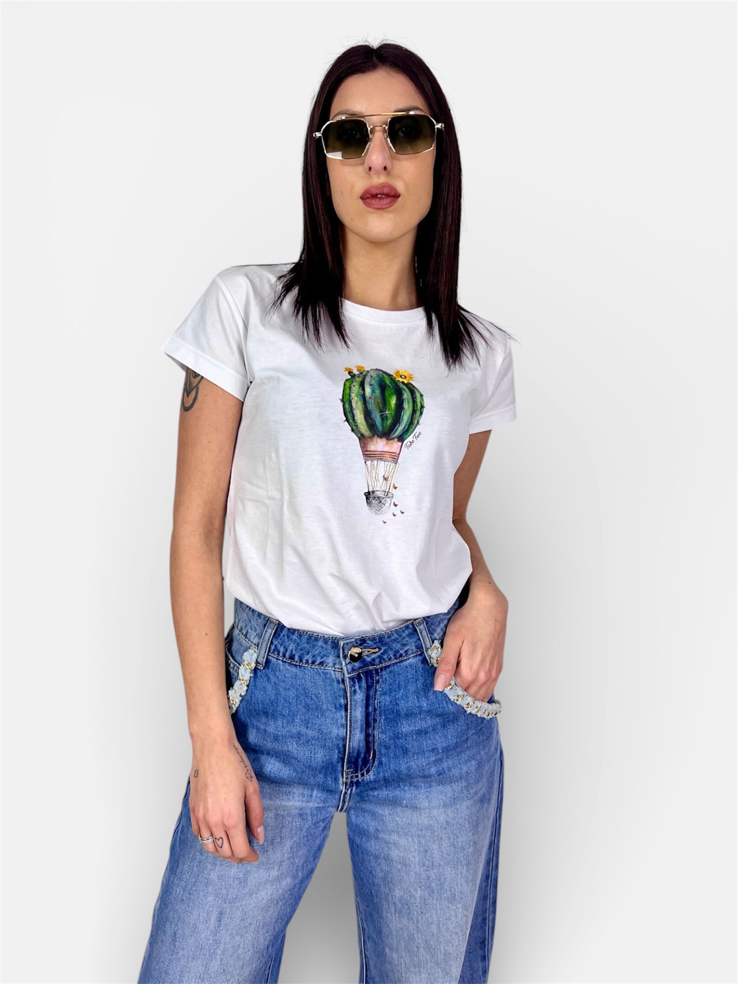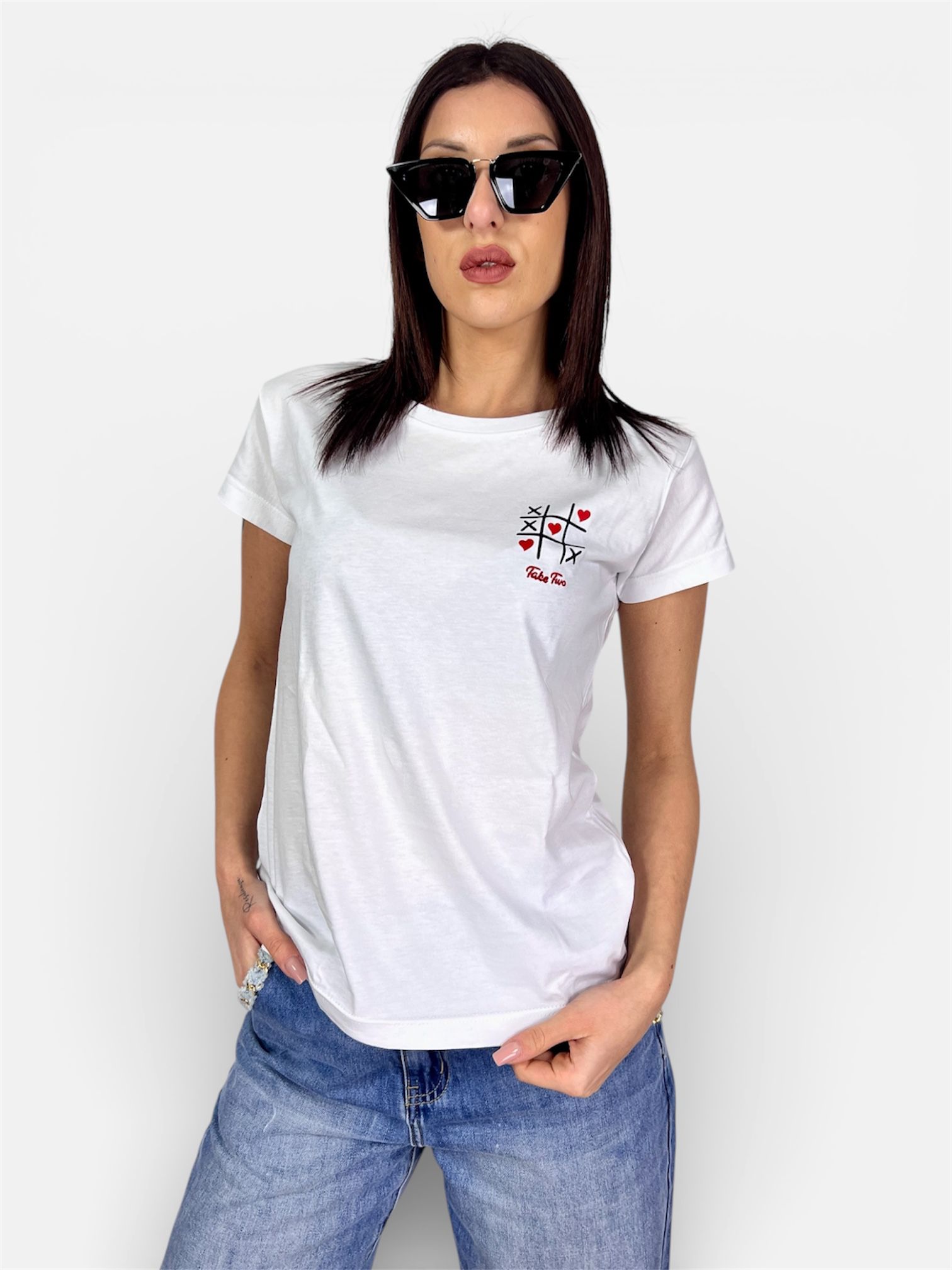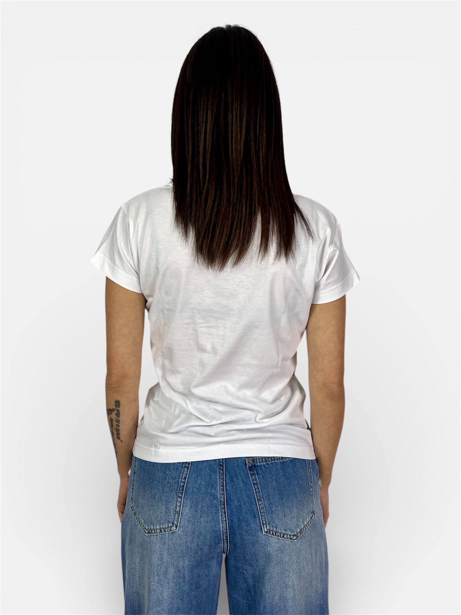 - modello t-shirt mezza manica con stampa serigrafica con parti in ricamo