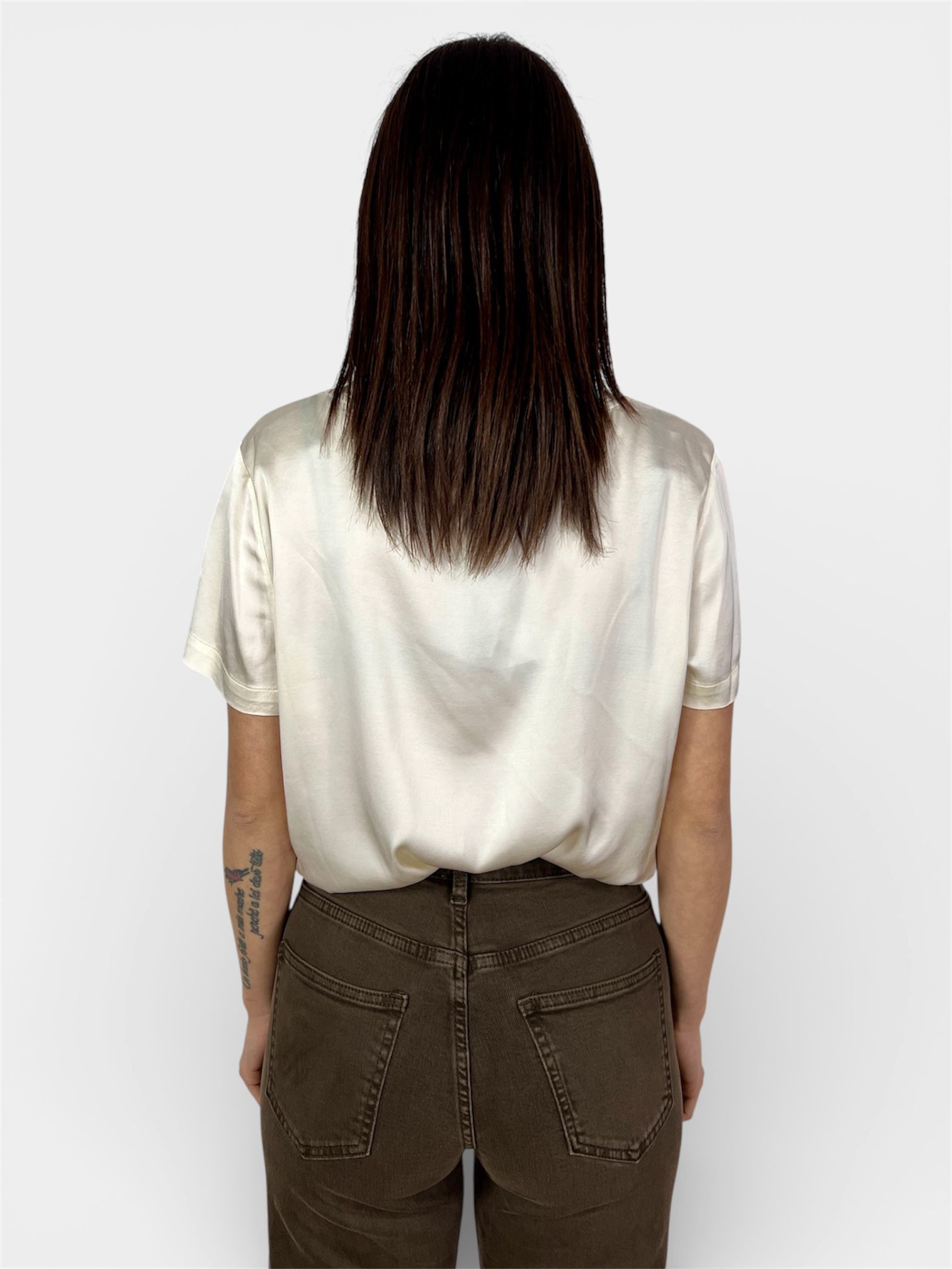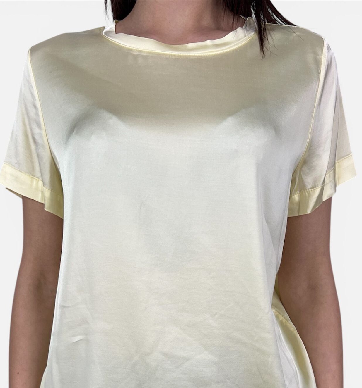 Eleva il tuo stile quotidiano con questa t-shirt in viscosa dal finish lucido, un capo versatile pensato per chi non vuole rinunciare alla raffinatezza nemmeno nei look più casual. La texture setosa cattura la luce, offrendo una lucentezza sofisticata che ricorda il satin.