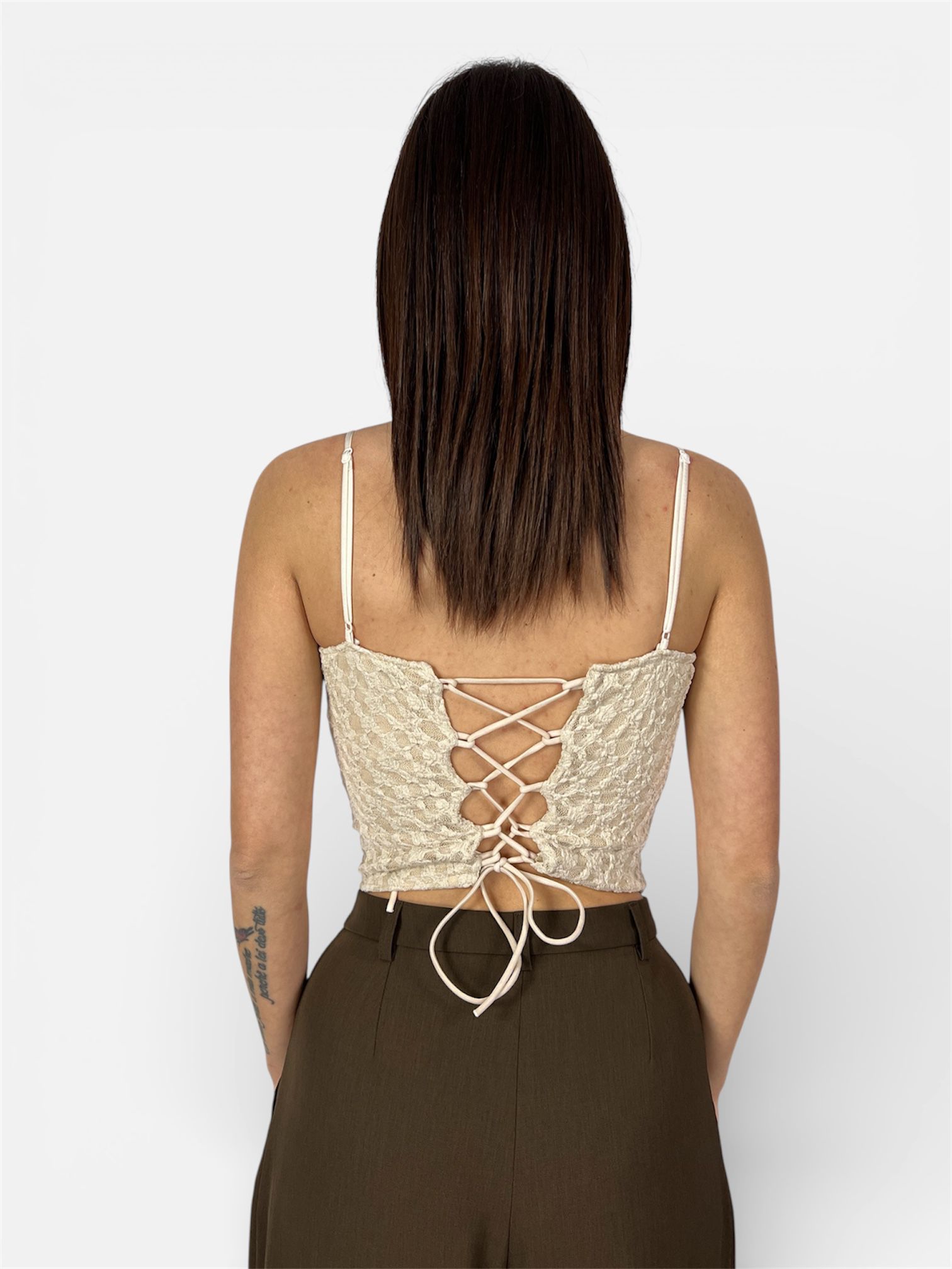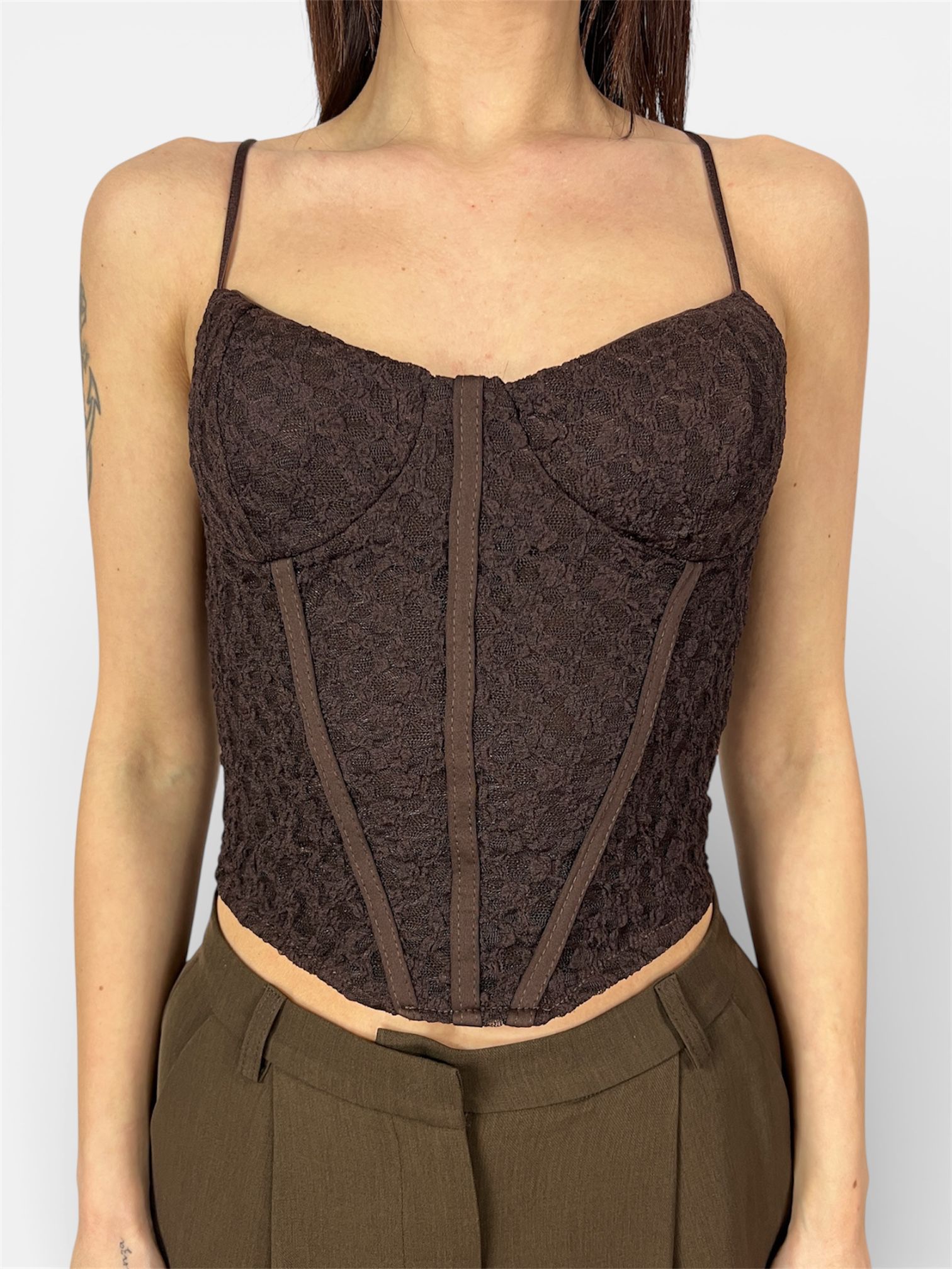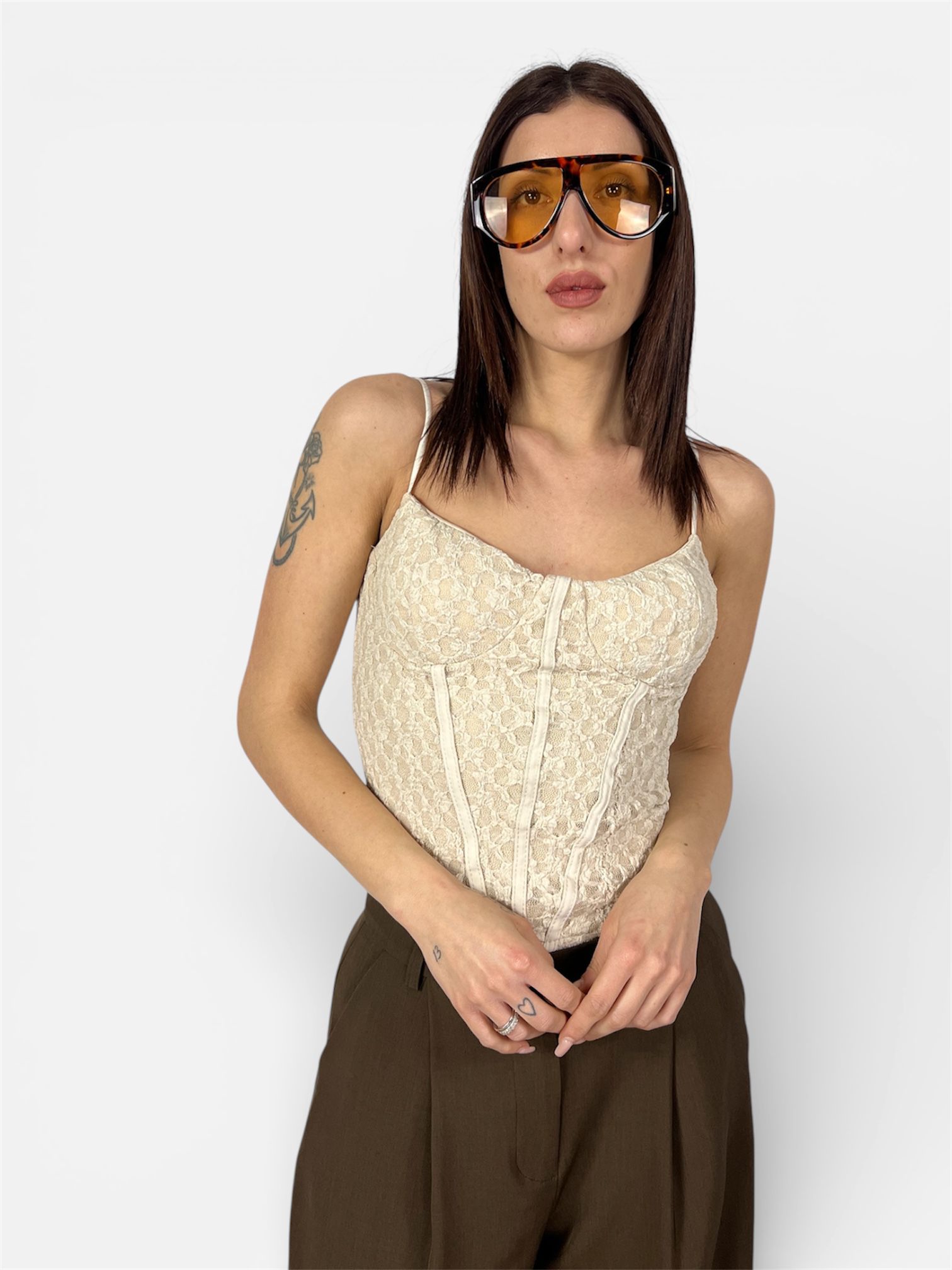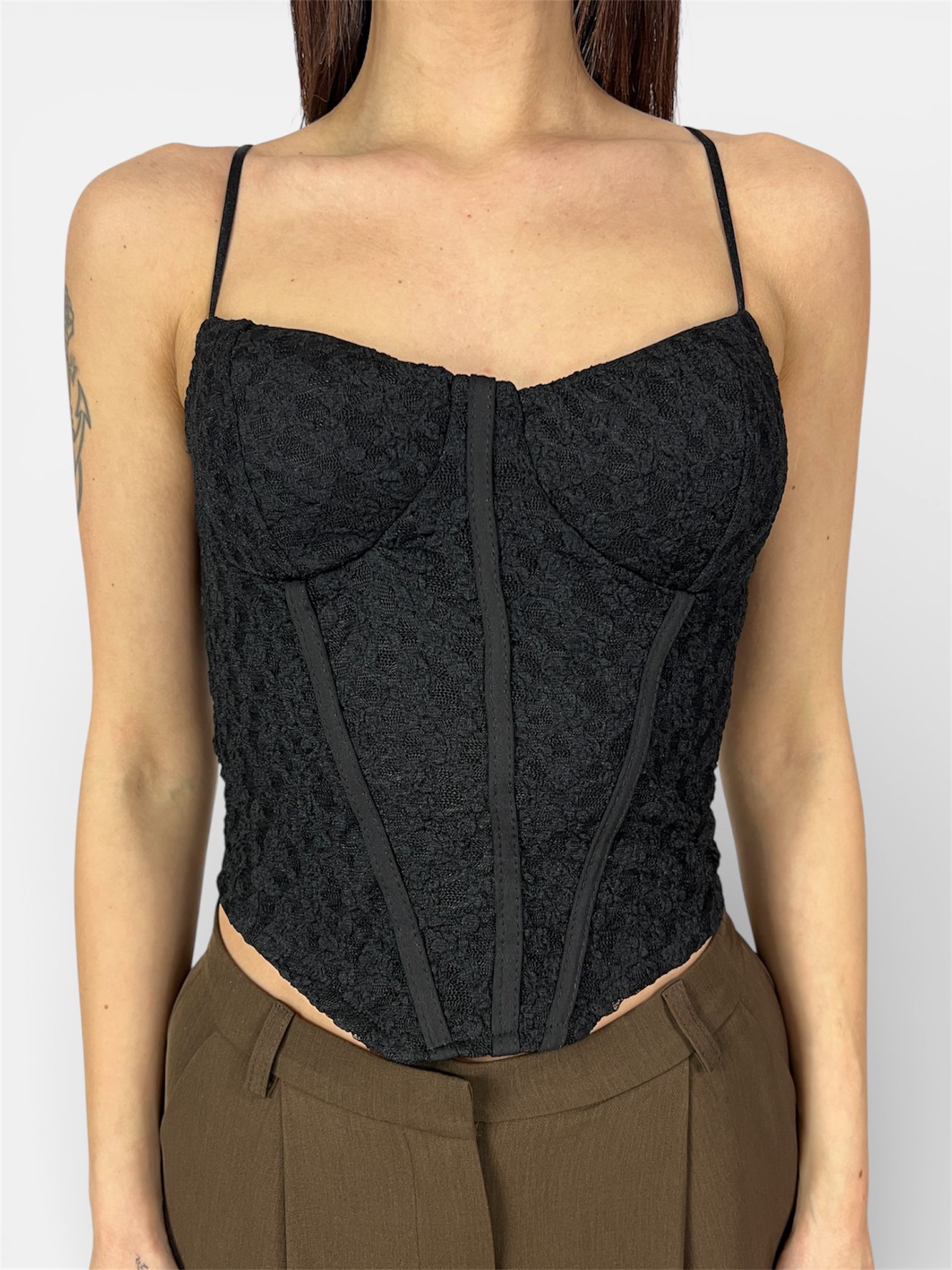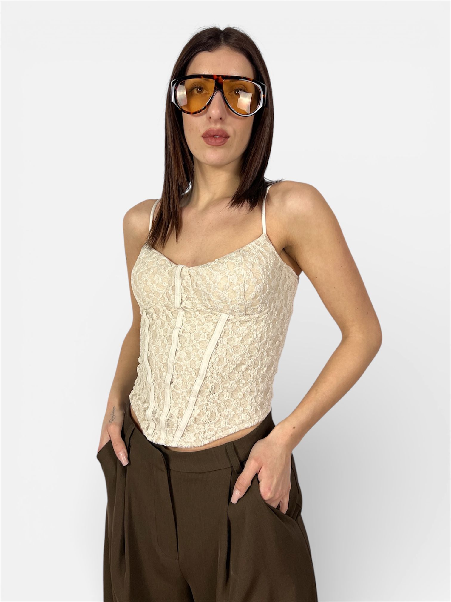 - Elegante e femminile, questo top bustino in pizzo è il capo perfetto per valorizzare la silhouette con uno stile raffinato e contemporaneo. Realizzato con una delicata lavorazione in pizzo, presenta una struttura ispirata al corsetto con cuciture verticali che definiscono la figura e slanciano il busto.